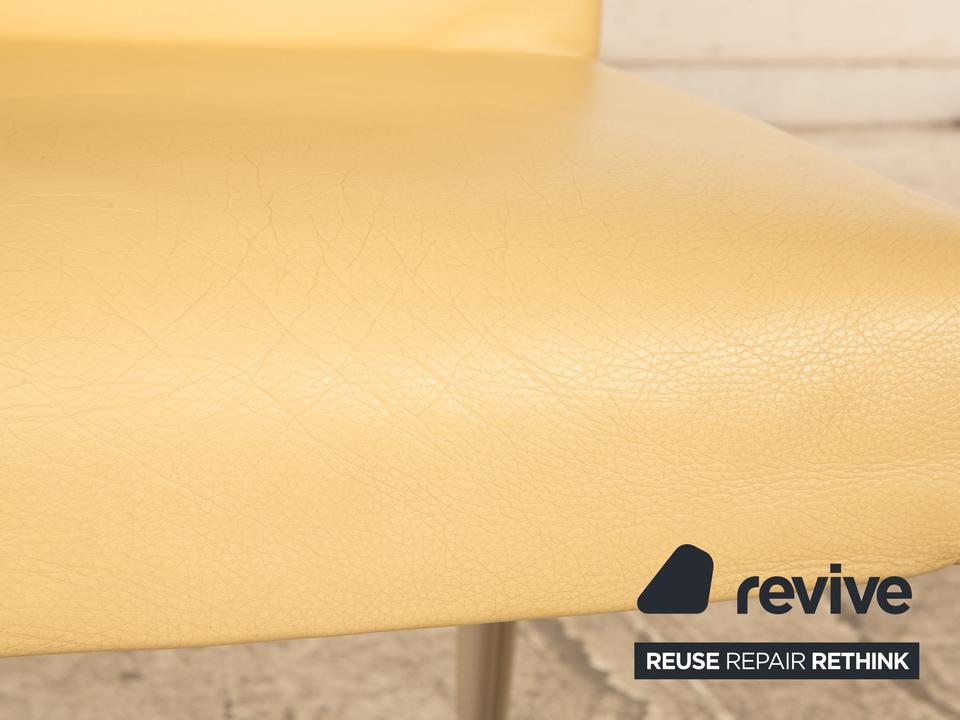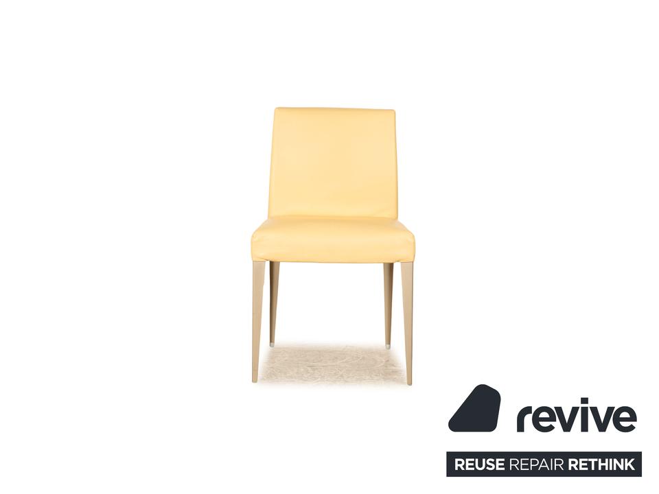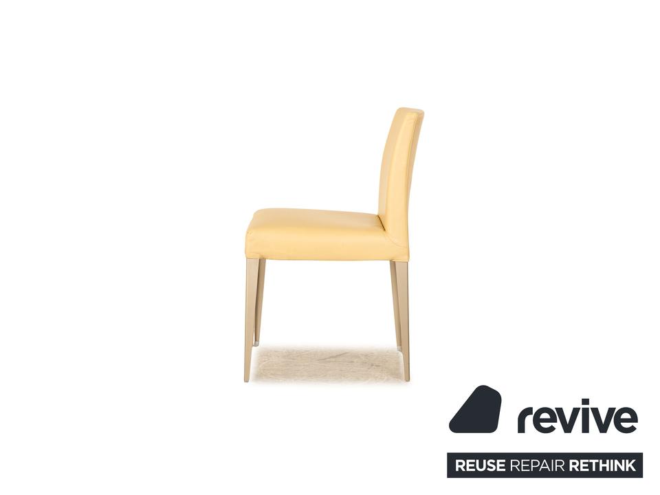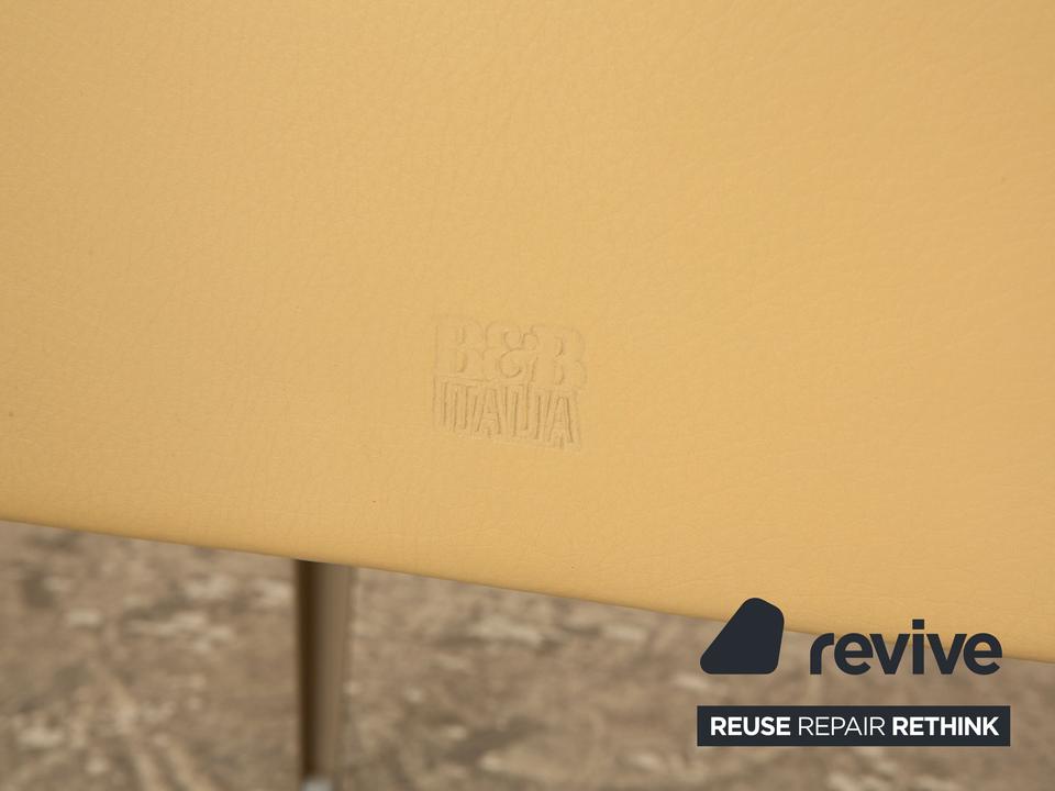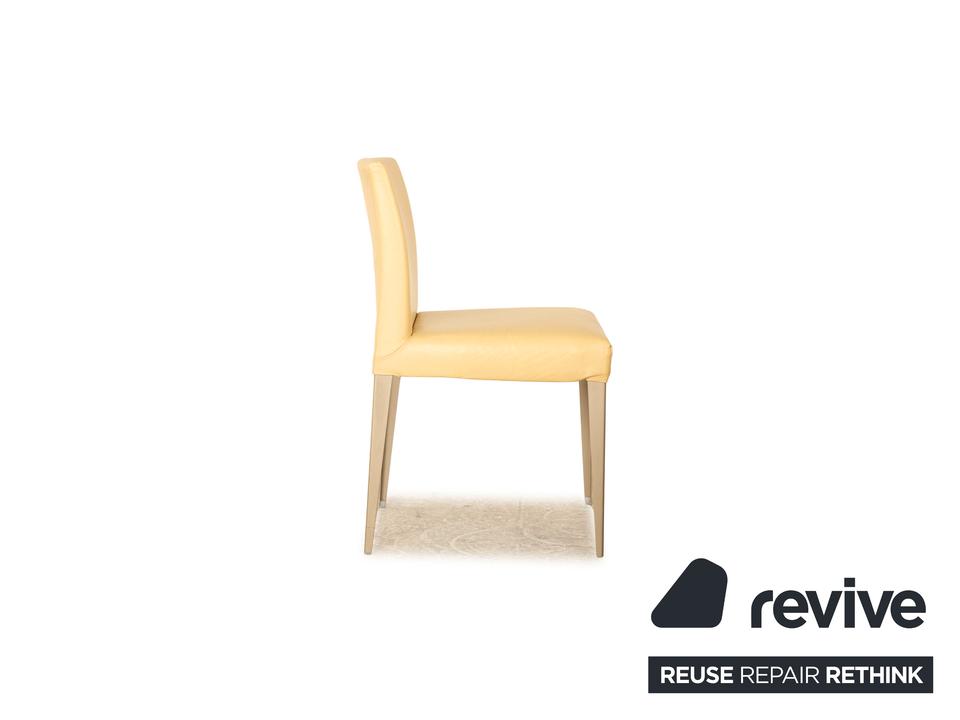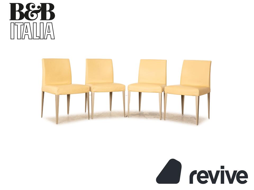 Die Stuhl Garnitur von B&B Italia ist mit einem cremefarbenen Echtleder bezogen und steht auf schmalen Metallfüßen. Er zeichnet sich durch das klassische Design und die schlichte, zeitlose Optik aus. Die Garnitur besteht aus vier Stühlen.