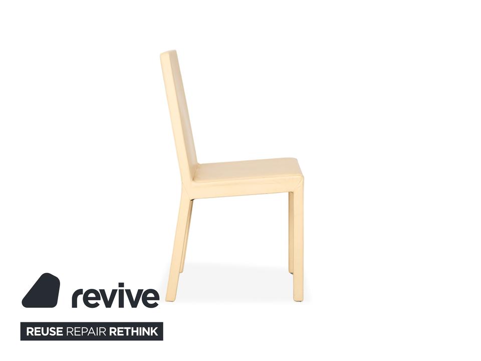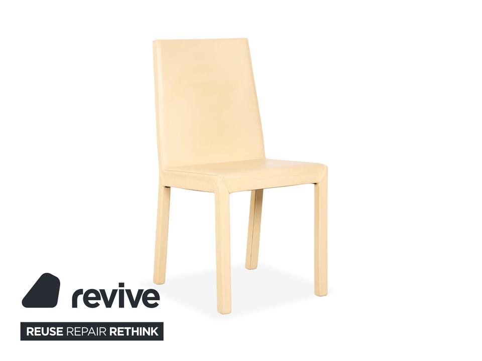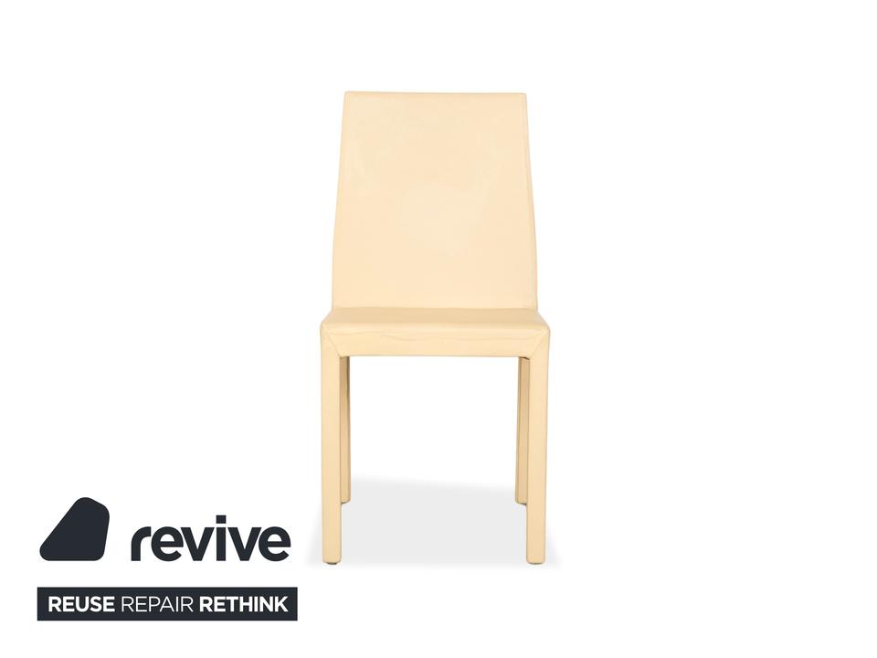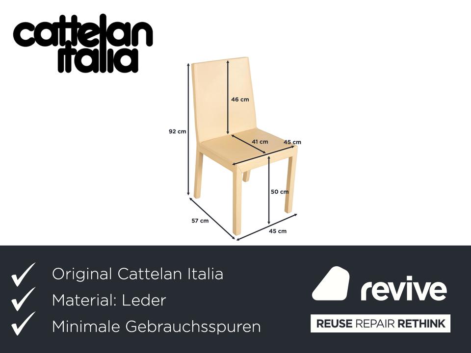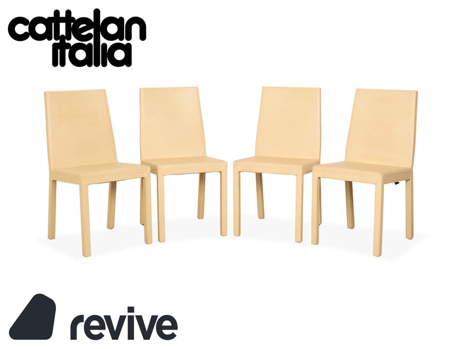 Die Garnitur besteht aus vier Stühlen von Cattelan Italia. Der Bezug aus echtem Leder in Creme-Elfenbein verleiht den Stühlen eine elegante Ausstrahlung und macht sie zugleich pflegeleicht und langlebig. Sitzfläche, Rückenlehne und Beine sind komplett mit Leder bezogen, was die klare Formensprache unterstreicht.