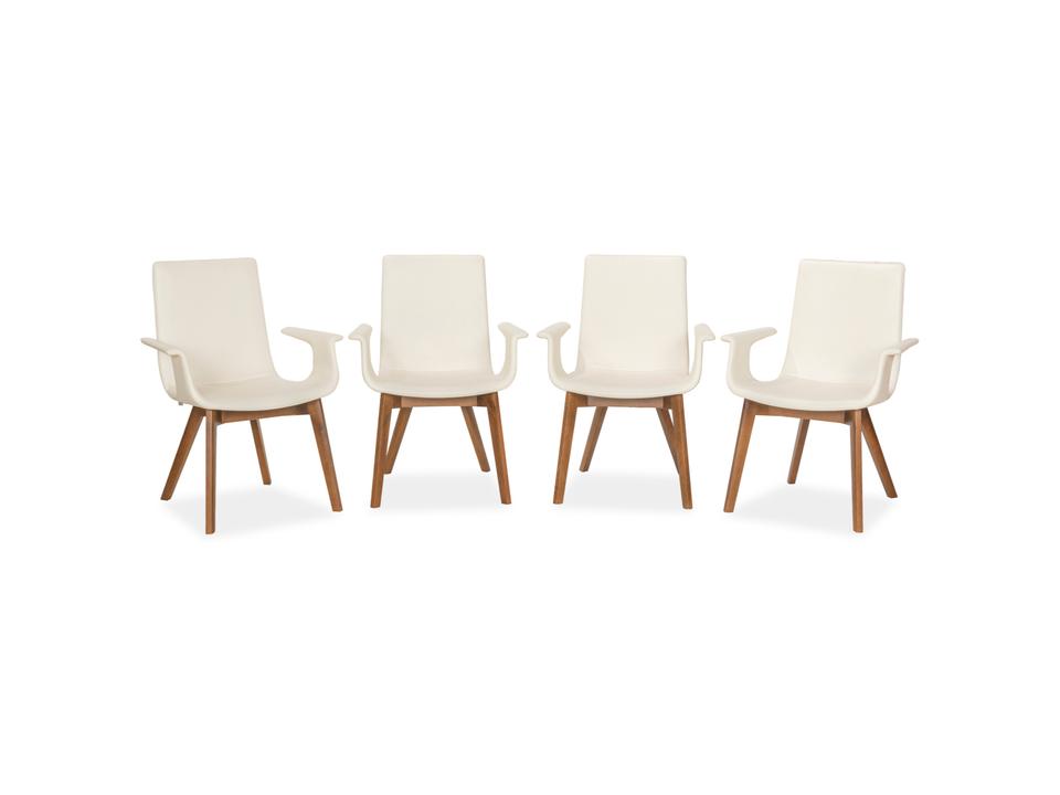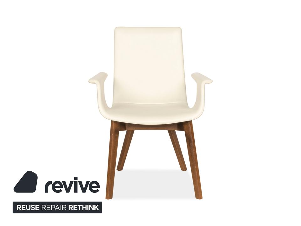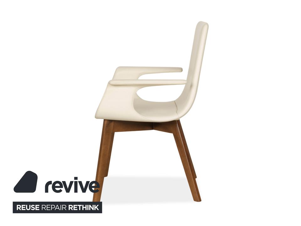 Das Stuhl-Set D27 von Hülsta besteht aus insgesamt vier Stühlen, die mit einem cremefarbenen Echtleder bezogen sind und auf braunen Holzbeinen stehen.