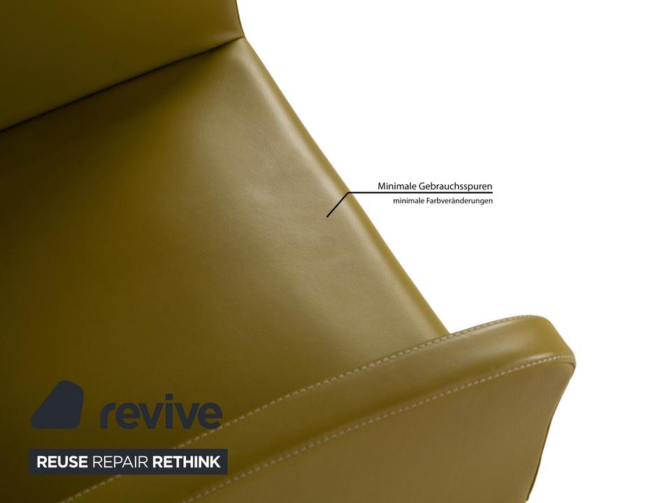 Das Stuhl-Set von Poltrona Frau besteht aus insgesamt vier Stühlen (2x Armlehnstuhl, 2x ohne Armlehne), die mit einem gelb-grünen Echtleder bezogen sind und auf braunen Holzbeinen stehen.