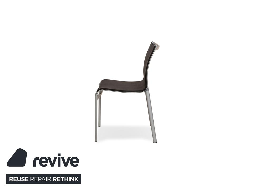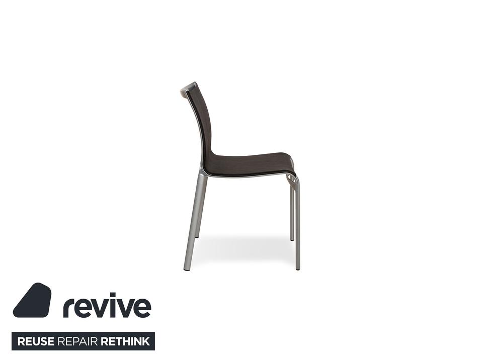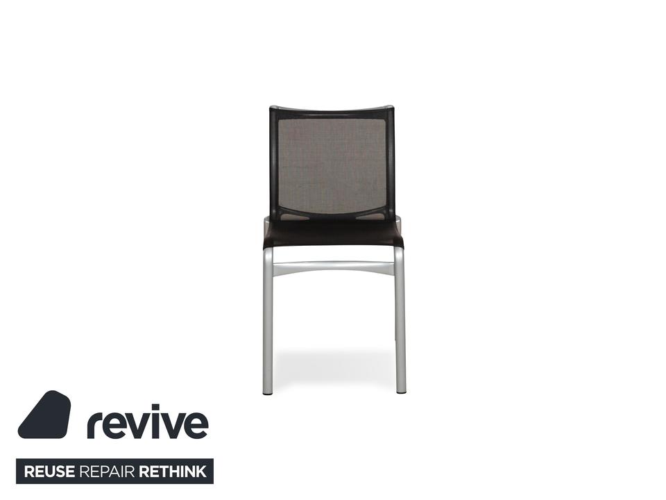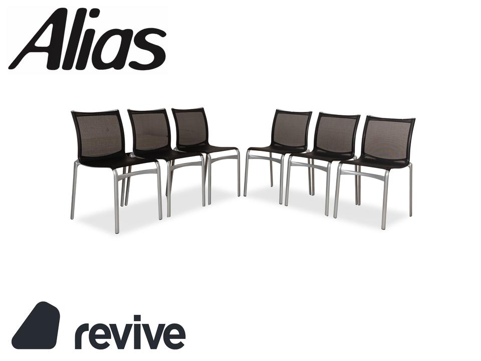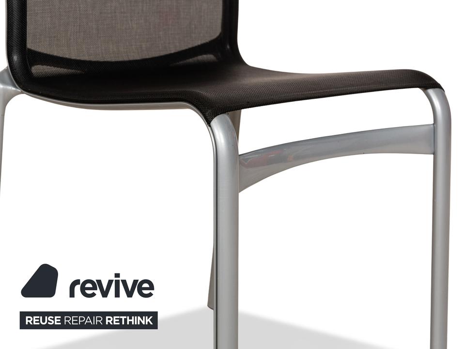 Die Stuhl Garnitur Highframe 40 von Alias ist mit einem schwarzen Meshstoff bezogen und steht auf einem anthrazitfrabenen Metallgestell. Sie zeichnet sich durch das klassische Design und die minimalistische Optik aus.