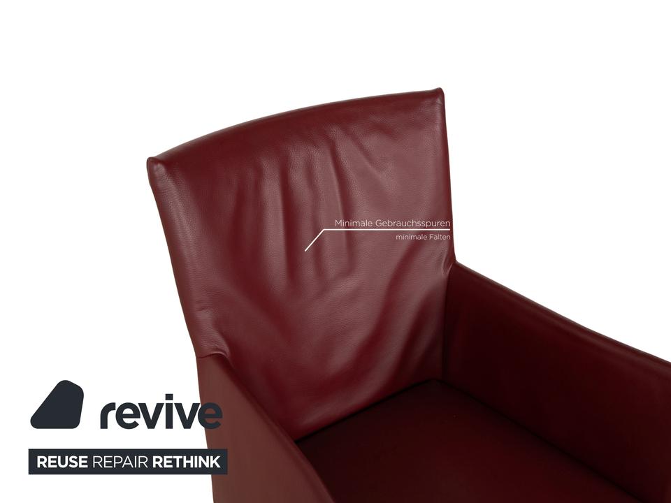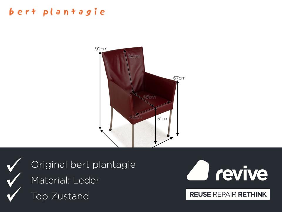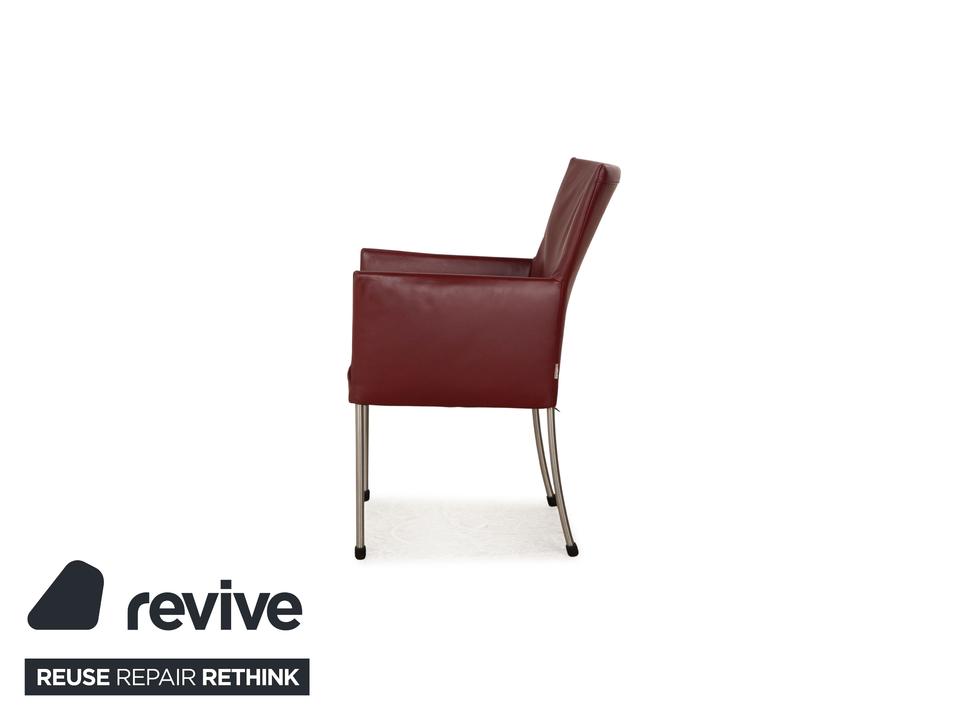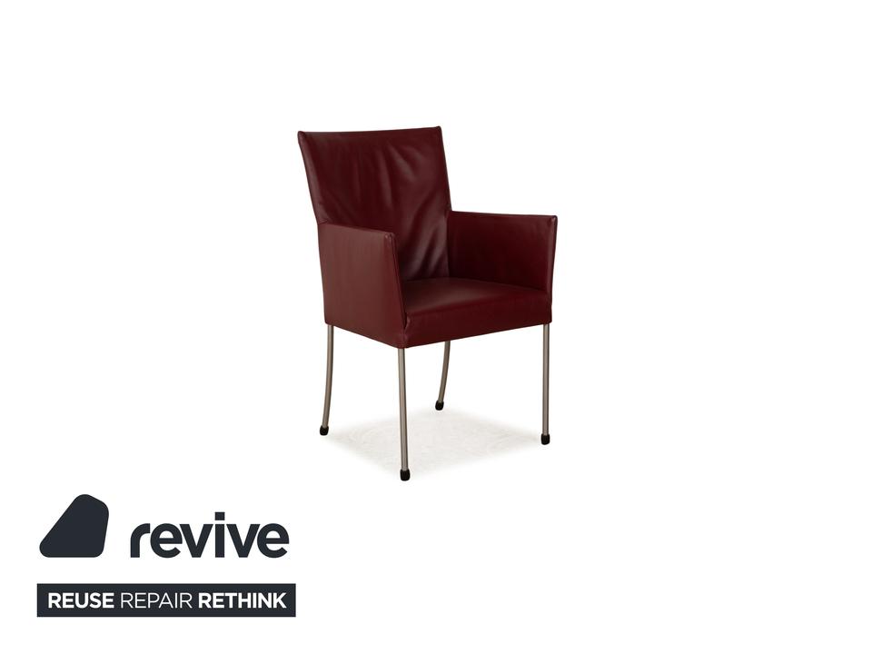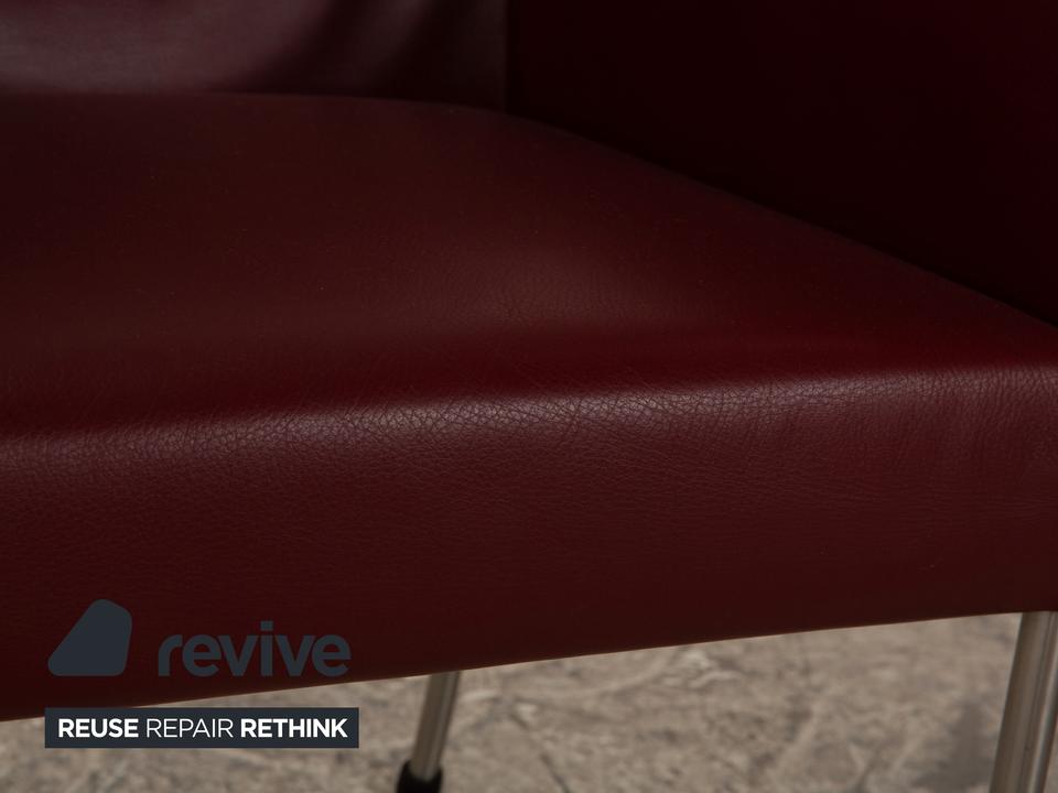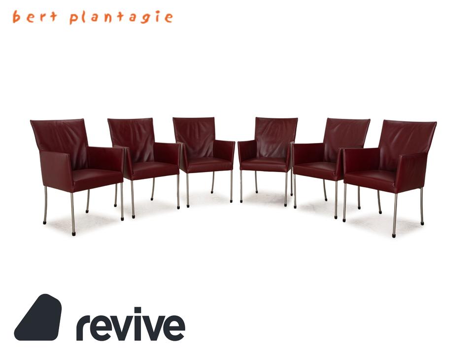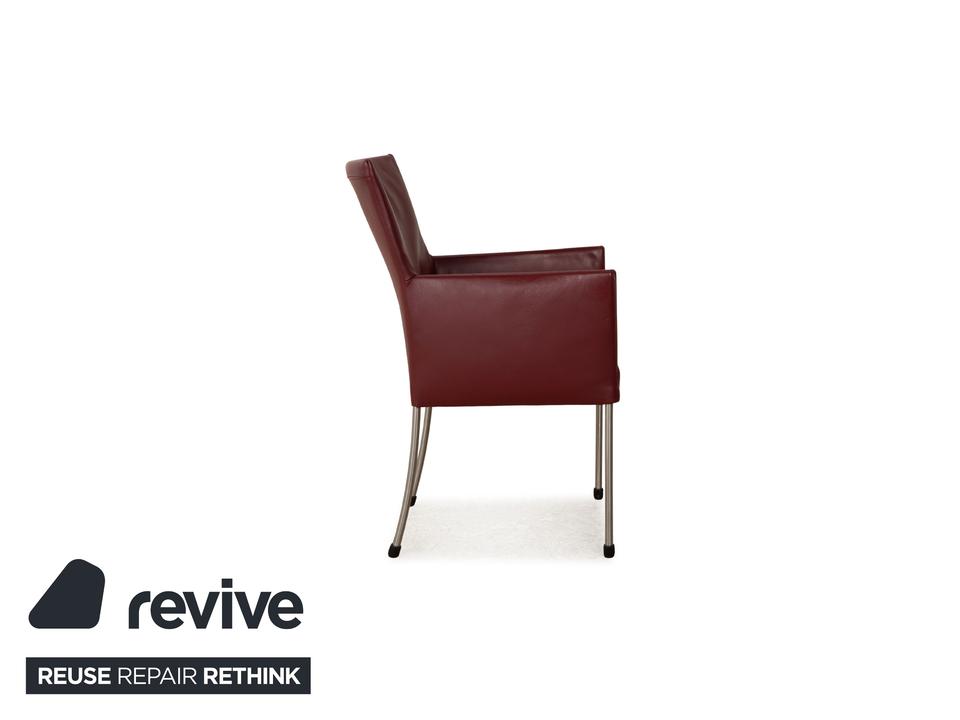 Die ARC-E Stuhl Garnitur von bert plantagie ist mit einem weinroten Echtleder bezogen und steht auf Metallfüßen. Das schlichte Design und die praktischen Armlehnen zeichnen sie aus.