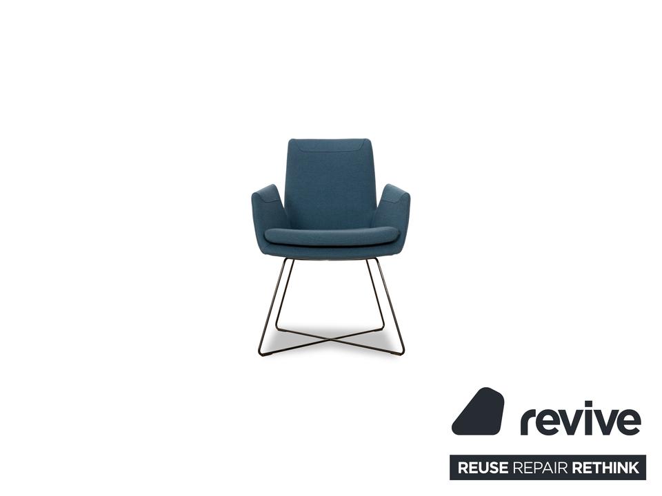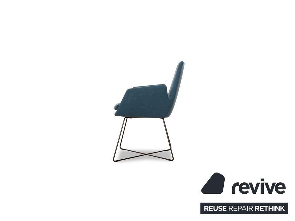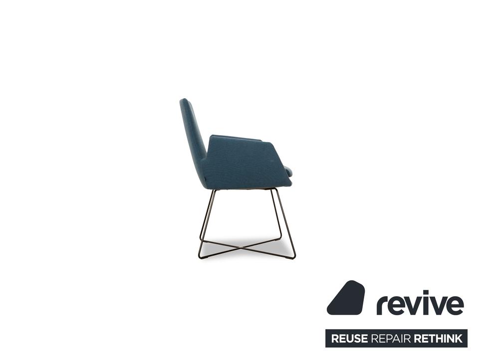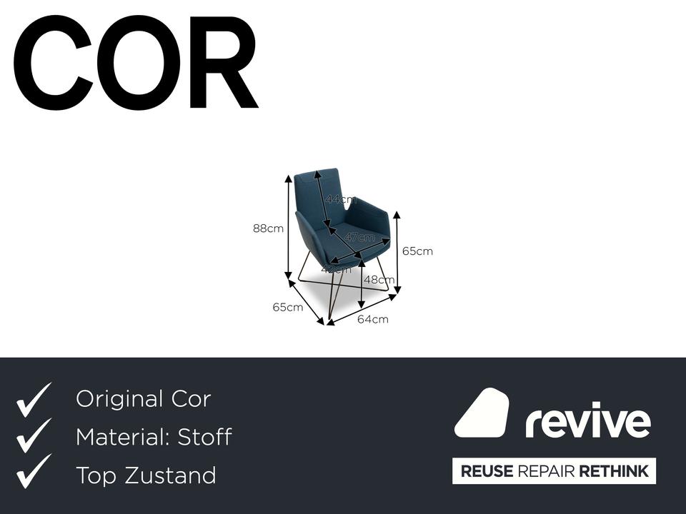 Die Stuhl Ganitur Cordia von Cor ist mit einem blauen Stoff bezogen und steht auf einem schmalen Metallgestell. Sie zeichnet sich durch die moderne Optik und das stilvolle, elegante Design aus.