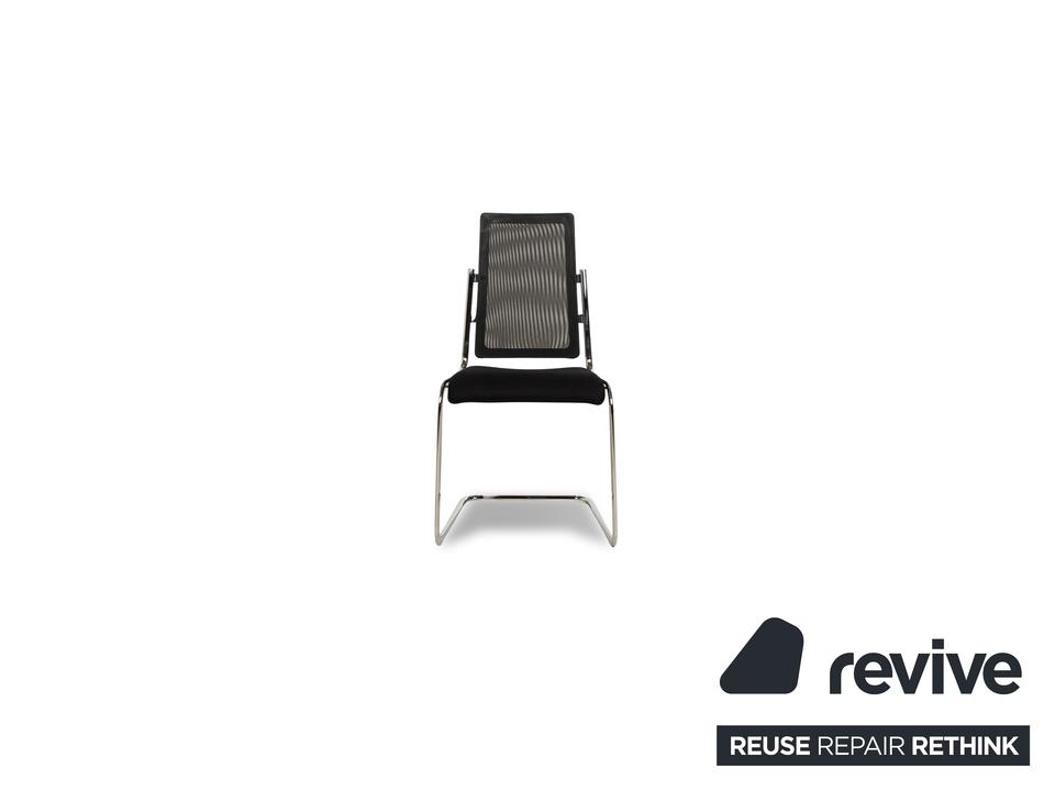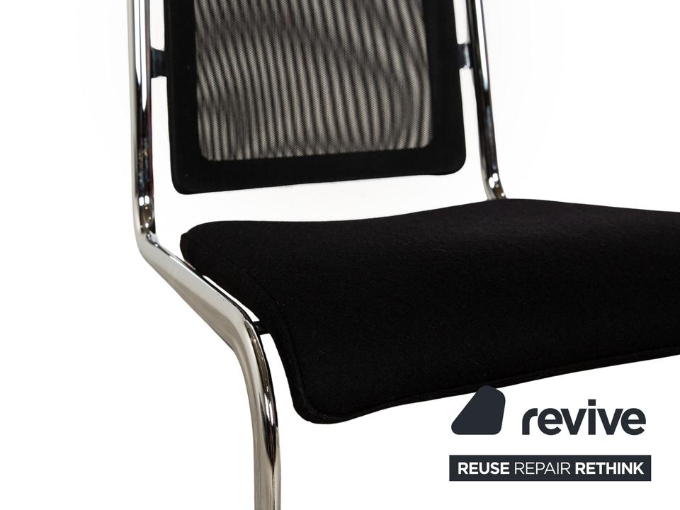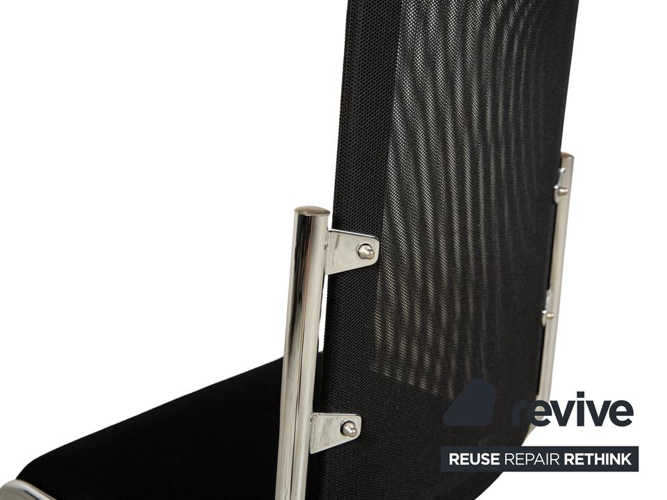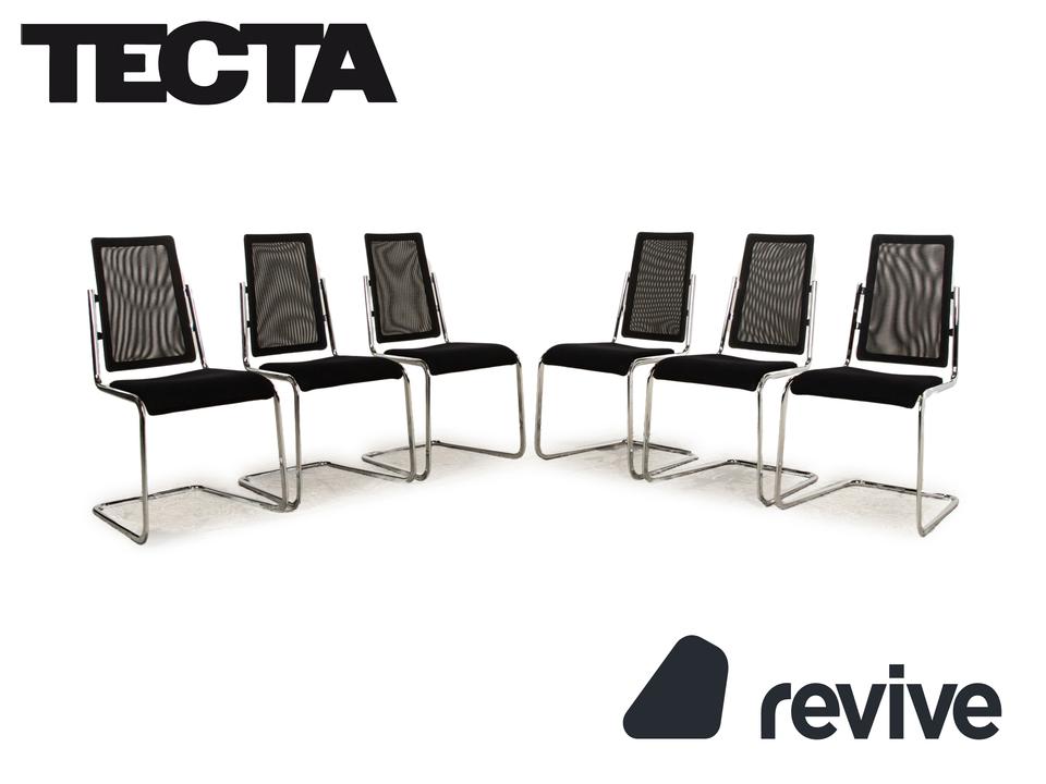 Die Stuhl Garnitur von Tecta besteht aus sechs Stühlen und steht auf einem schmalen Metallgestell. Die Rückenlehne ist mit einem schwarzen Mesh und die Sitzfläche mit einem schwarzen Stoff bezogen. Sie zeichnet sich durch das stilvolle Design und die zeitlose Optik aus.