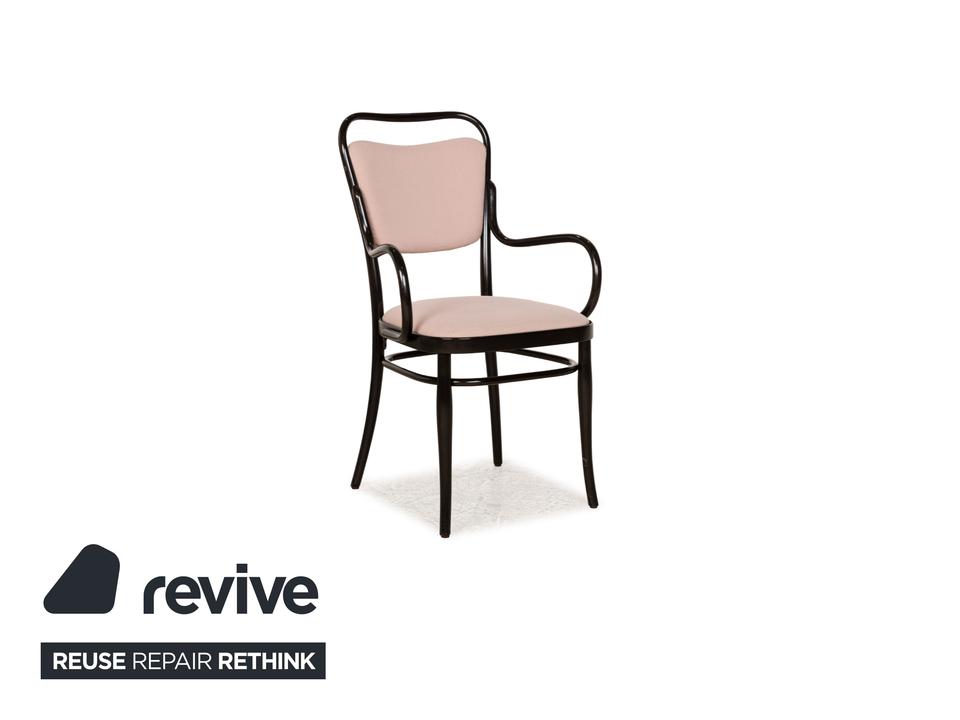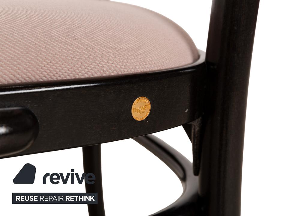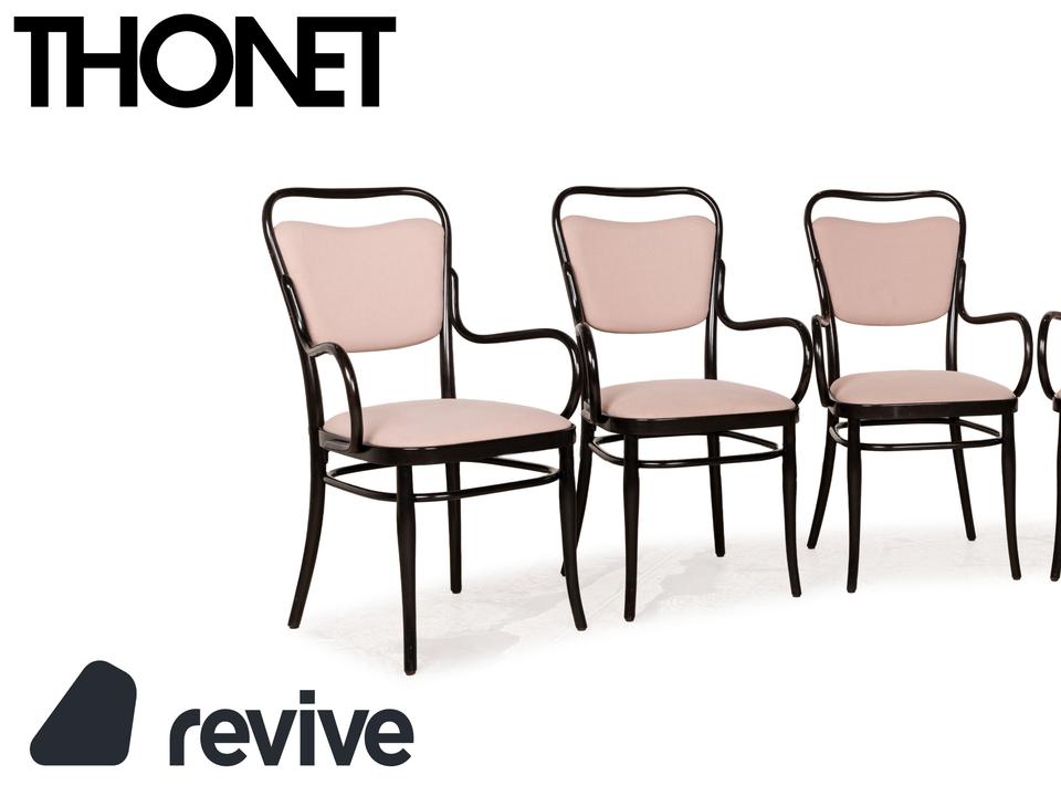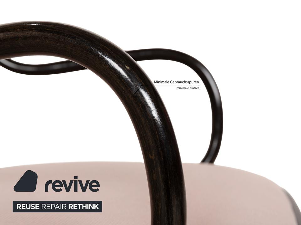 Die Stuhl-Garnitur von Thonet, bestehend aus sechs baugleichen Exemplaren, ist eine moderne Variante des bekannten Kaffeehaus-Klassikers, für das der Traditionsherteller weltberühmt ist. Dunkelbraunes Bugholz bildet das Gerüst des Stuhls, dessen Sitz- und Lehnfläche mit einem Stoff in Altrosa bezogen sind. Stil und Komfort gehen hier eine zeitlos schöne Verbindung ein.