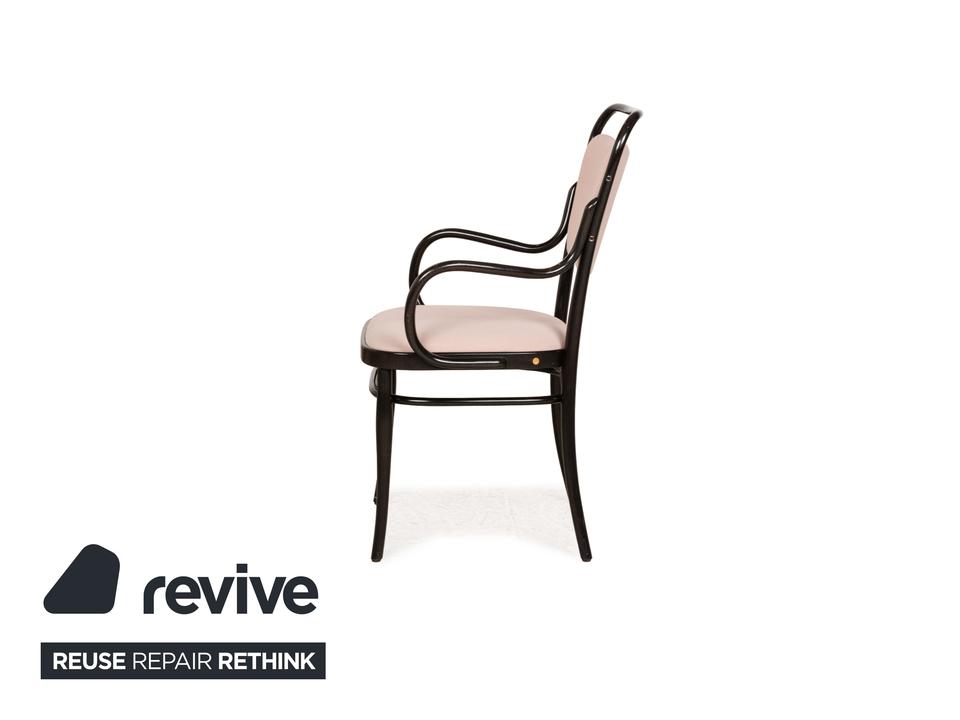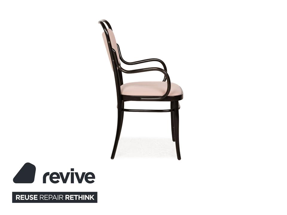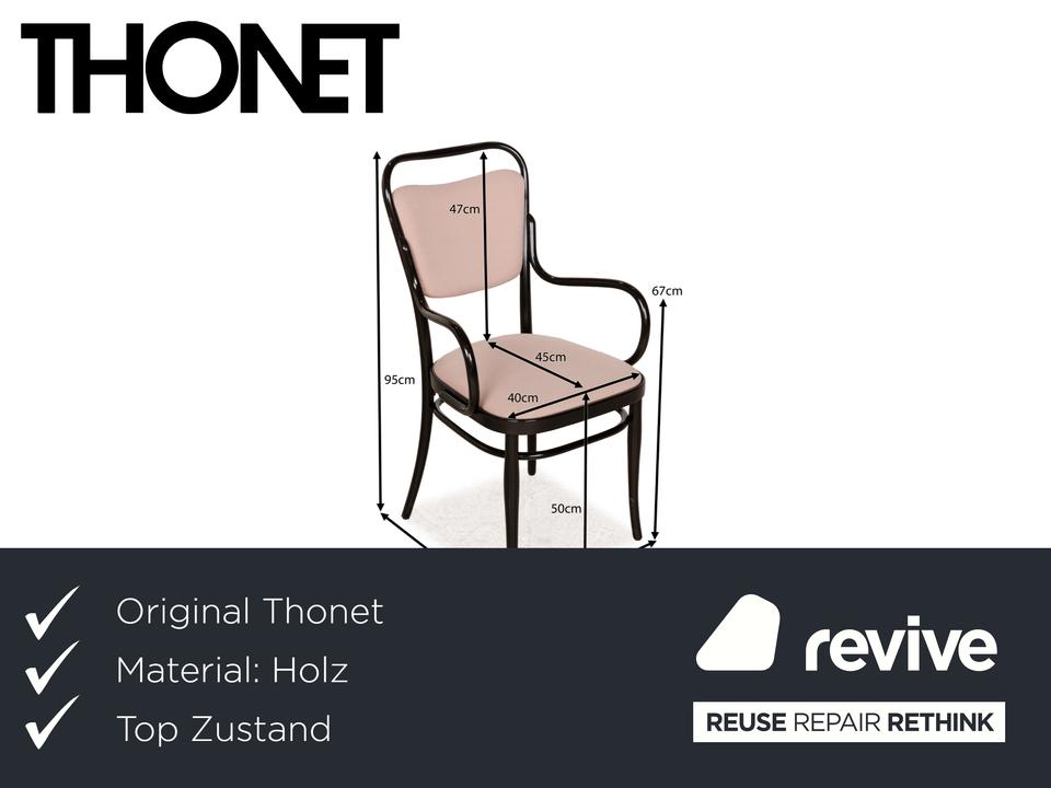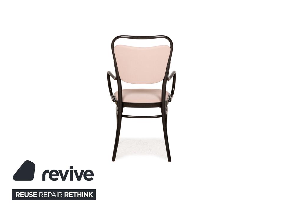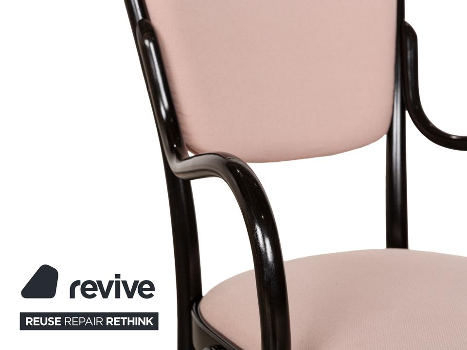 Die Stuhl-Garnitur von Thonet, bestehend aus sechs baugleichen Exemplaren, ist eine moderne Variante des bekannten Kaffeehaus-Klassikers, für das der Traditionsherteller weltberühmt ist. Dunkelbraunes Bugholz bildet das Gerüst des Stuhls, dessen Sitz- und Lehnfläche mit einem Stoff in Altrosa bezogen sind. Stil und Komfort gehen hier eine zeitlos schöne Verbindung ein.