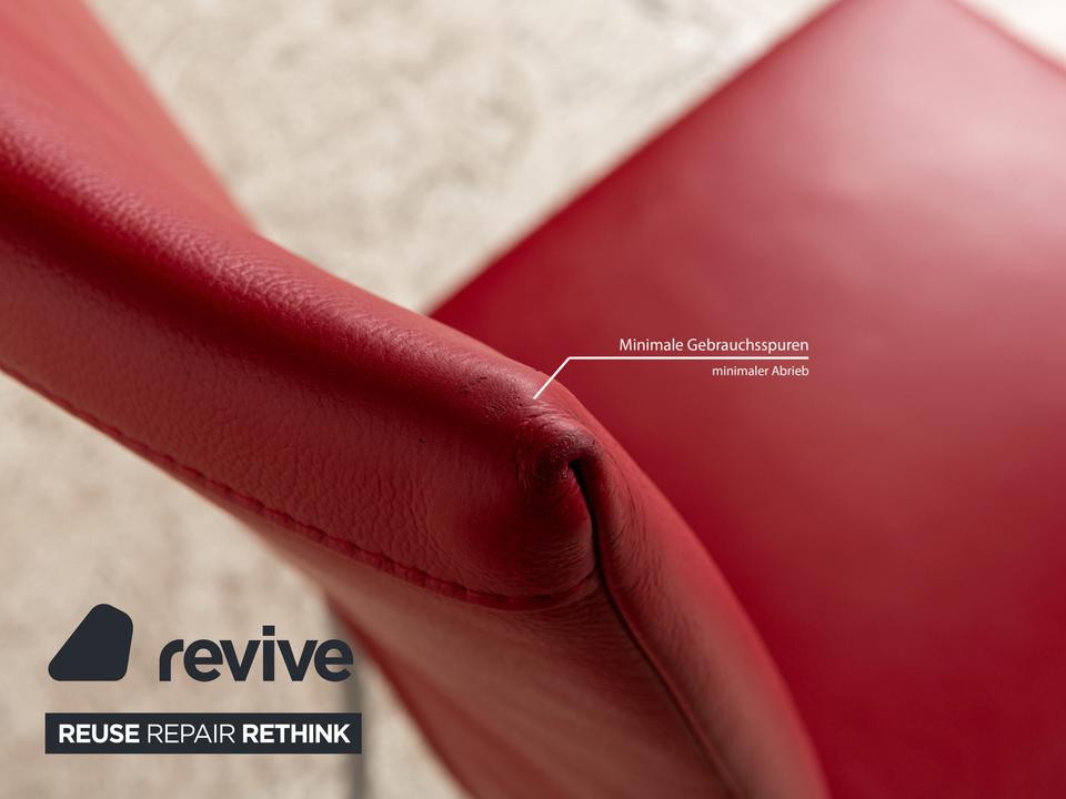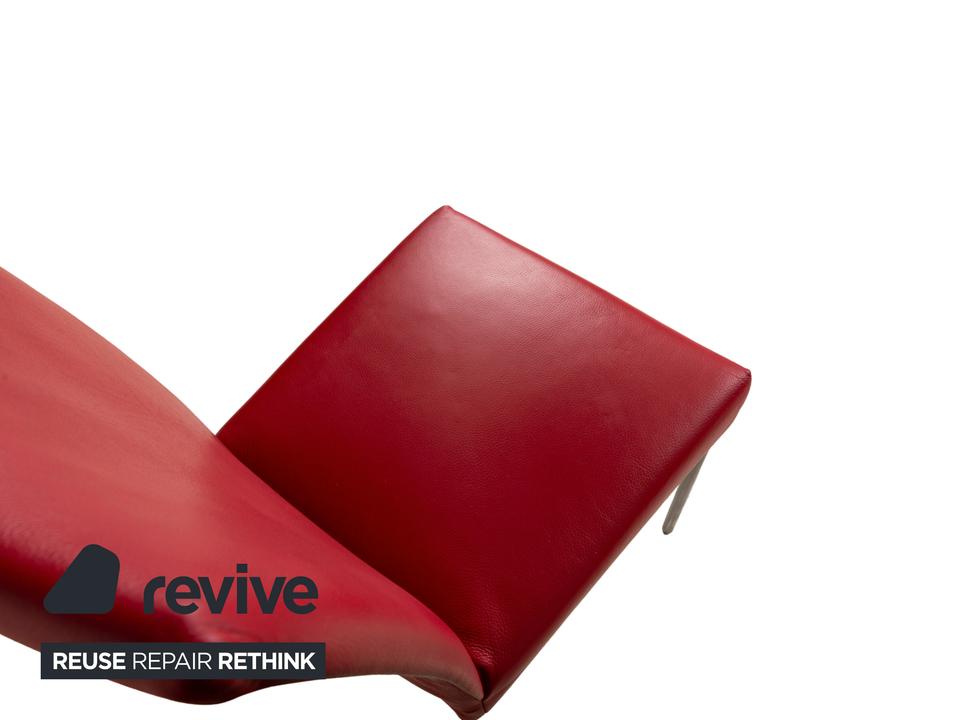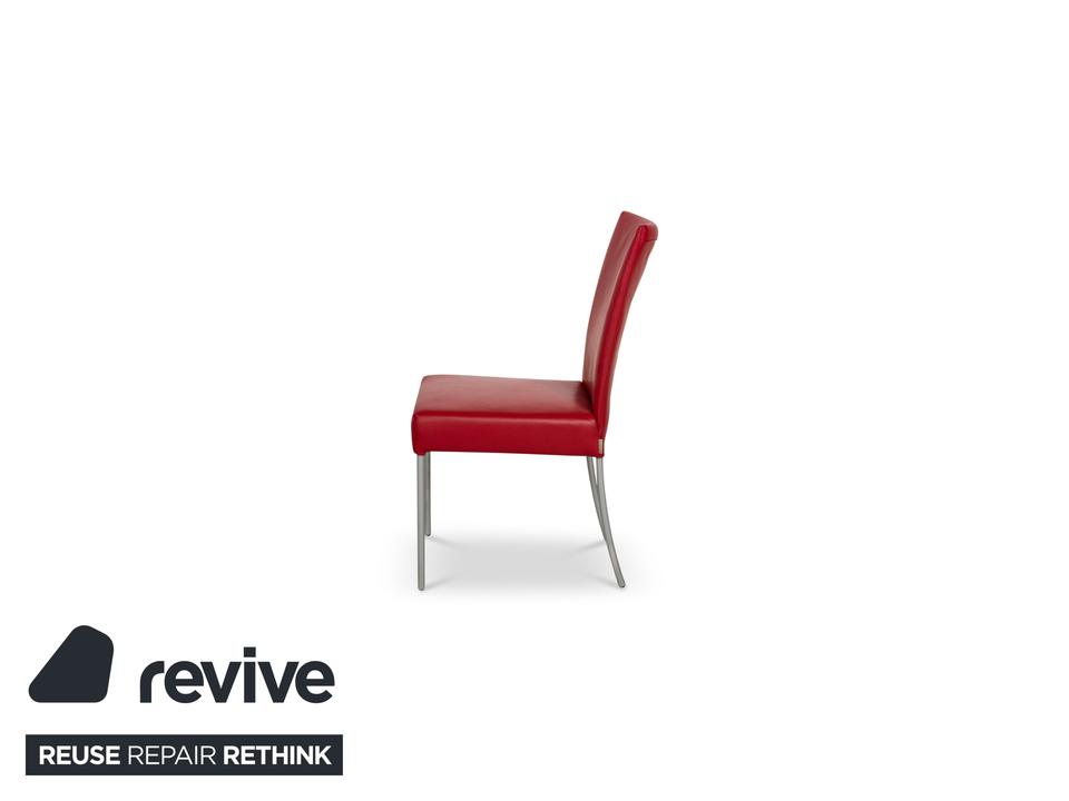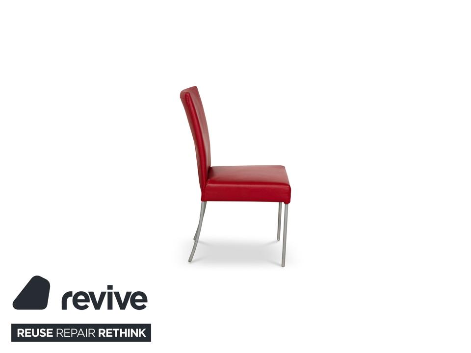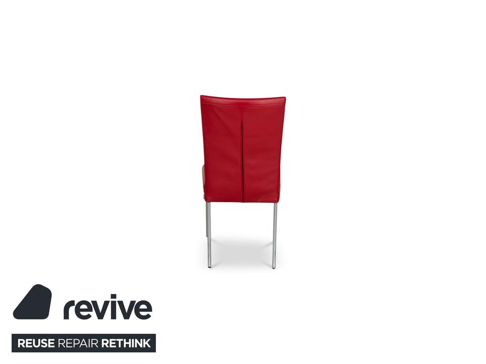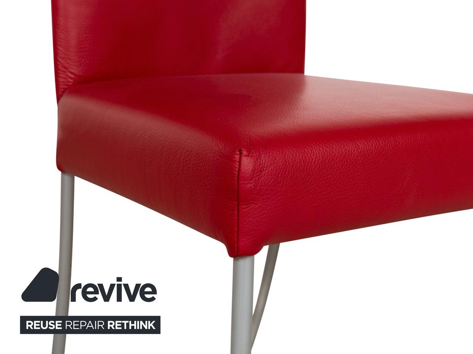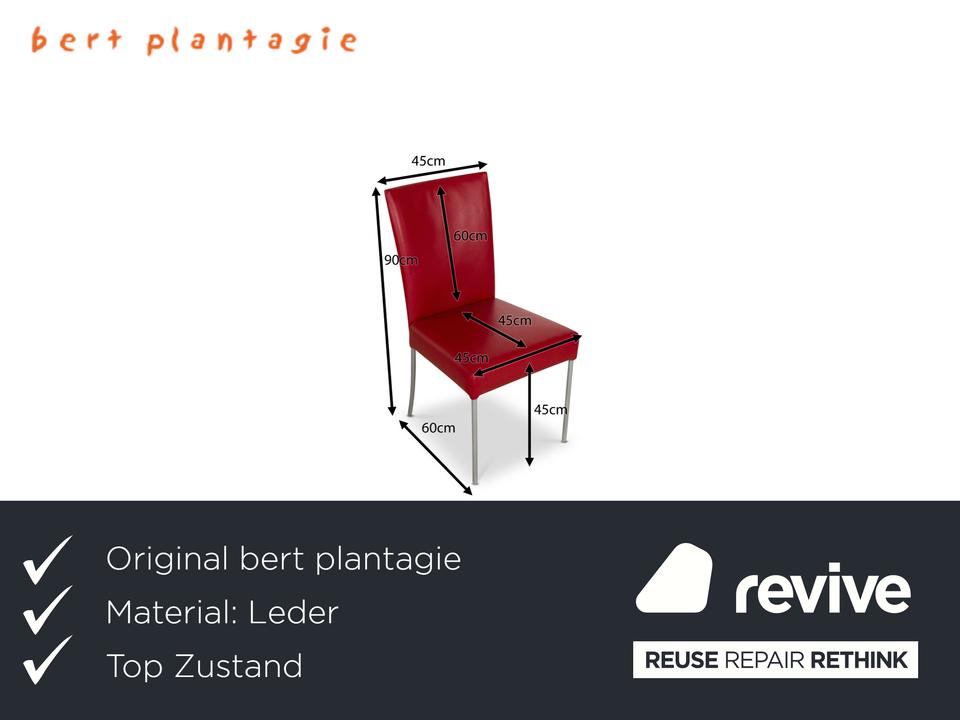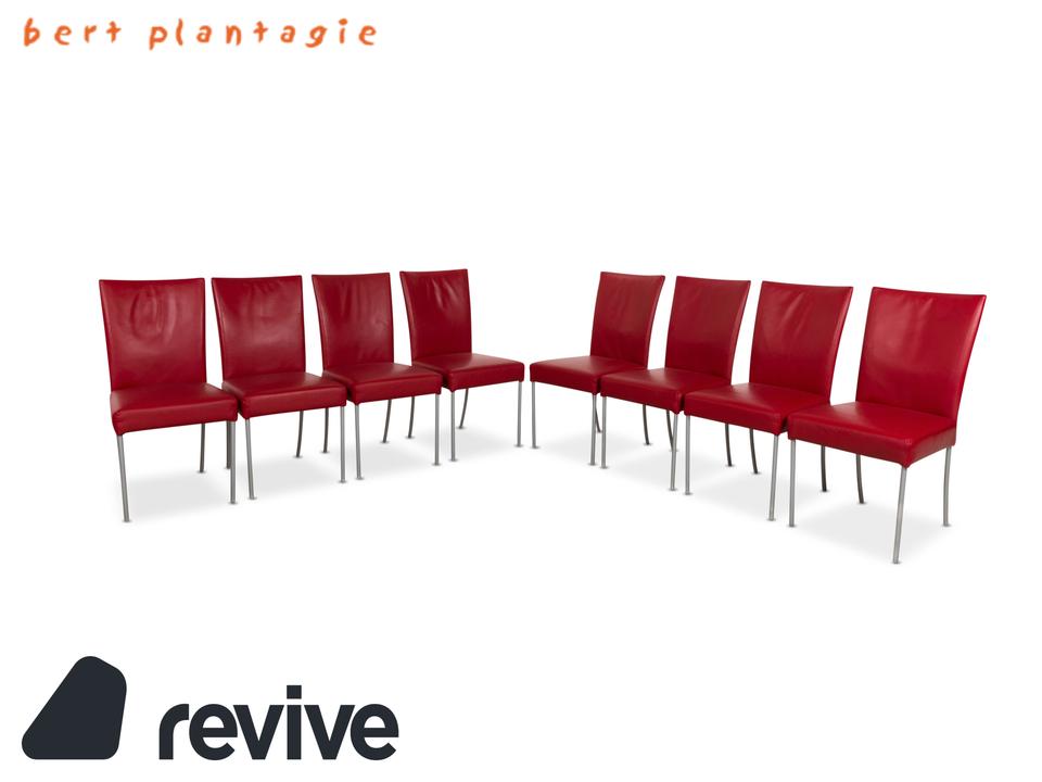 Die Stuhl Garnitur von bert plantagie ist mit einem intensiv-roten Echtleder bezogen und steht auf schmalen Beinen aus Metall. Das minimalistische, schlichte Design zeichnet sie aus.