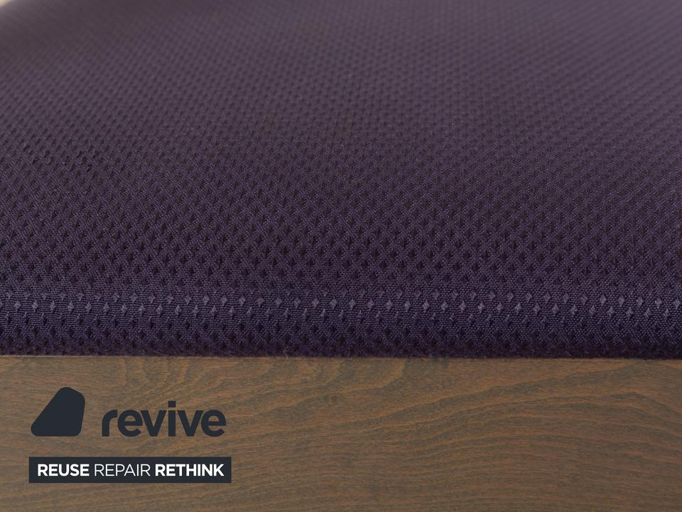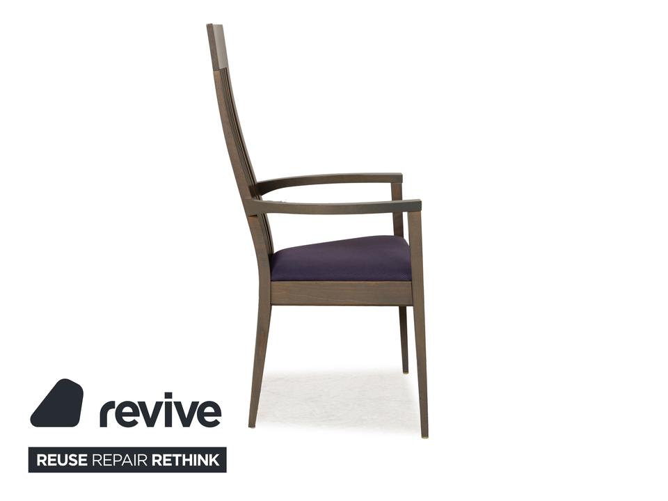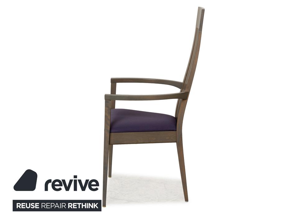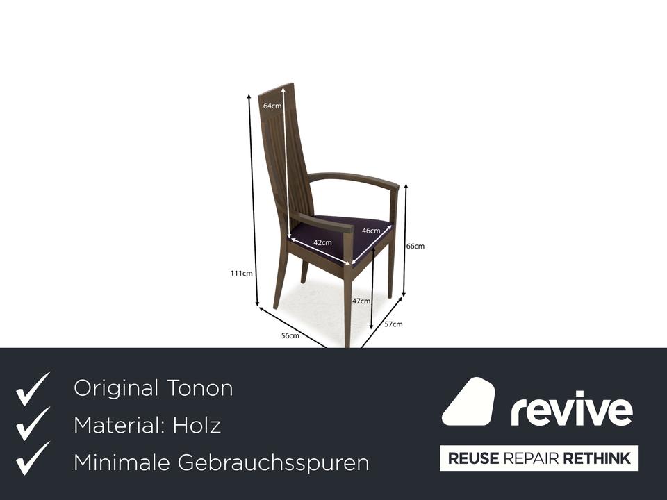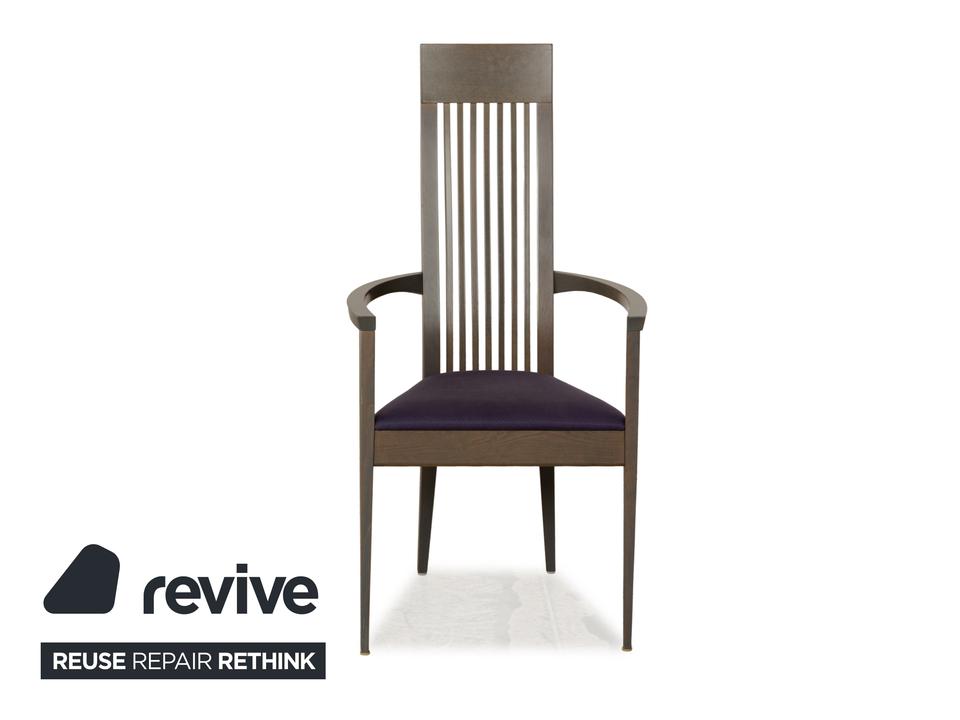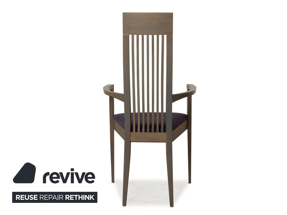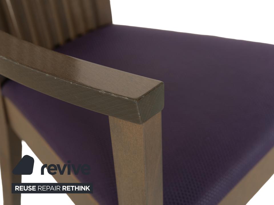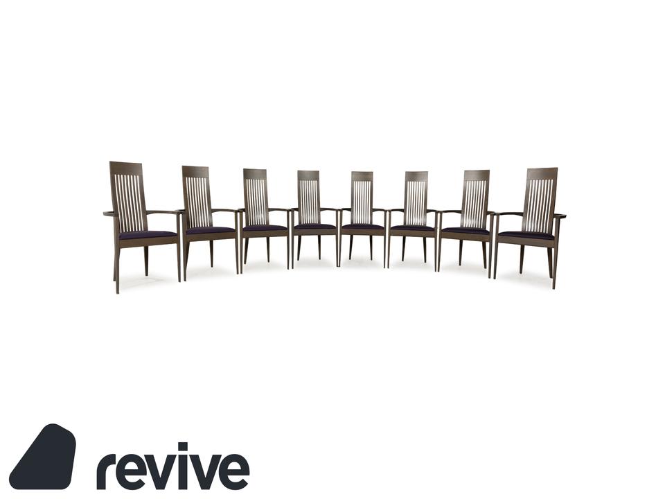 Die Stuhl-Garnitur von TONON, bestehend aus sechs baugleichen Exemplaren, ist aus grau-braunem Holz gefertigt. Die hohen Rückenlehnen sind durch die Streben optisch aufgebrochen und verleihen den Stühlen mit ihrem recht geometrischen Grunddesign Leichtigkeit. Die Sitzflächen sind mit einem lilafarbenen Stoff bezogen.
