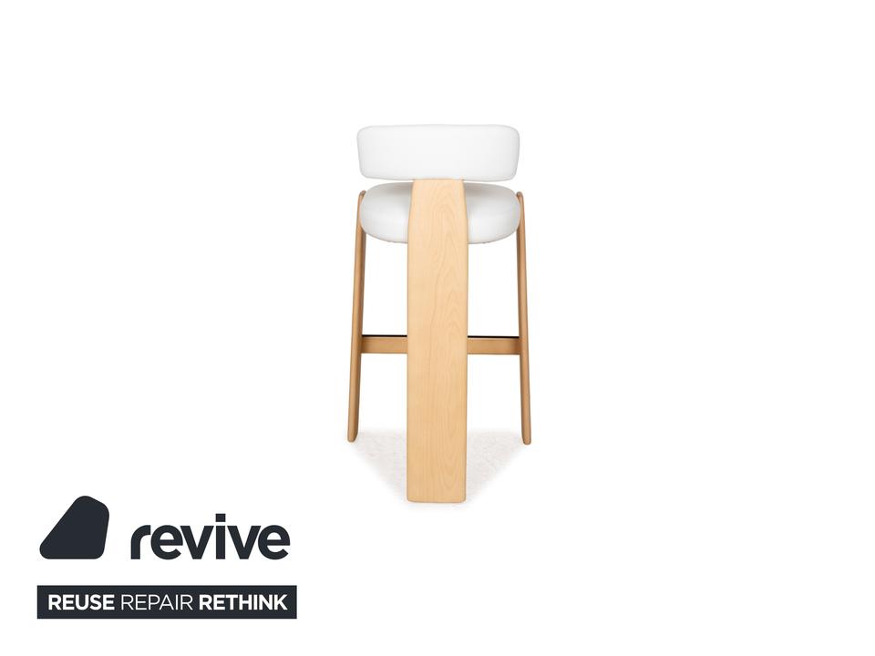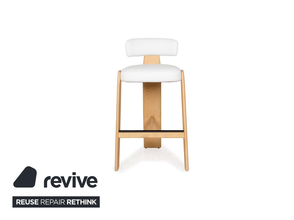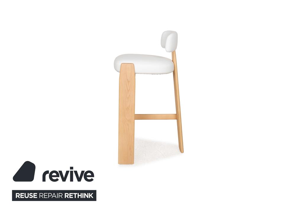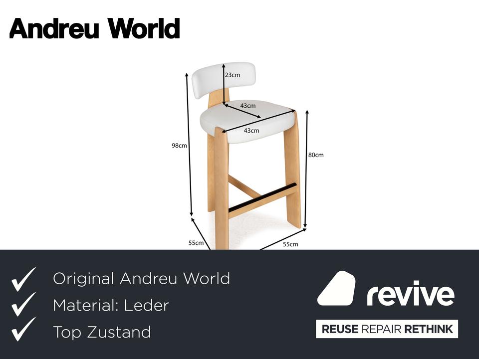 Der Stuhl Oru von Andreau World ist aus hellbraunem Holz und mit weißem Lederbezug gefertigt. Das Design des Hochstuhls, der sich auch hervorragend als Barhocker eignet ist unkonventionell und formenreich: Gerade Flächen und Streben des Holzgestells gehen in die Rundungen der gepolsterten, gerundeten Sitzfläche über und münden in einer elegant geschwungenen Lehne.