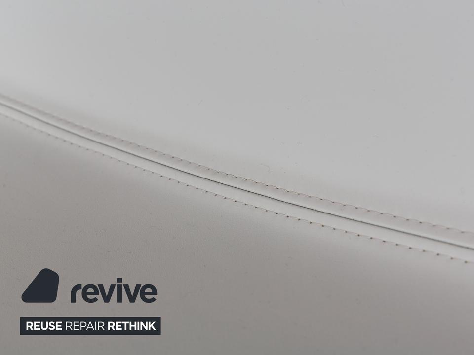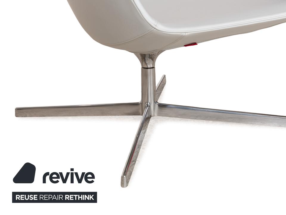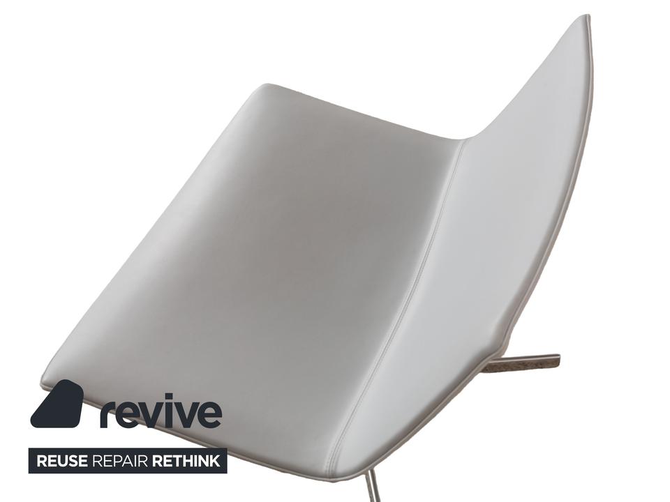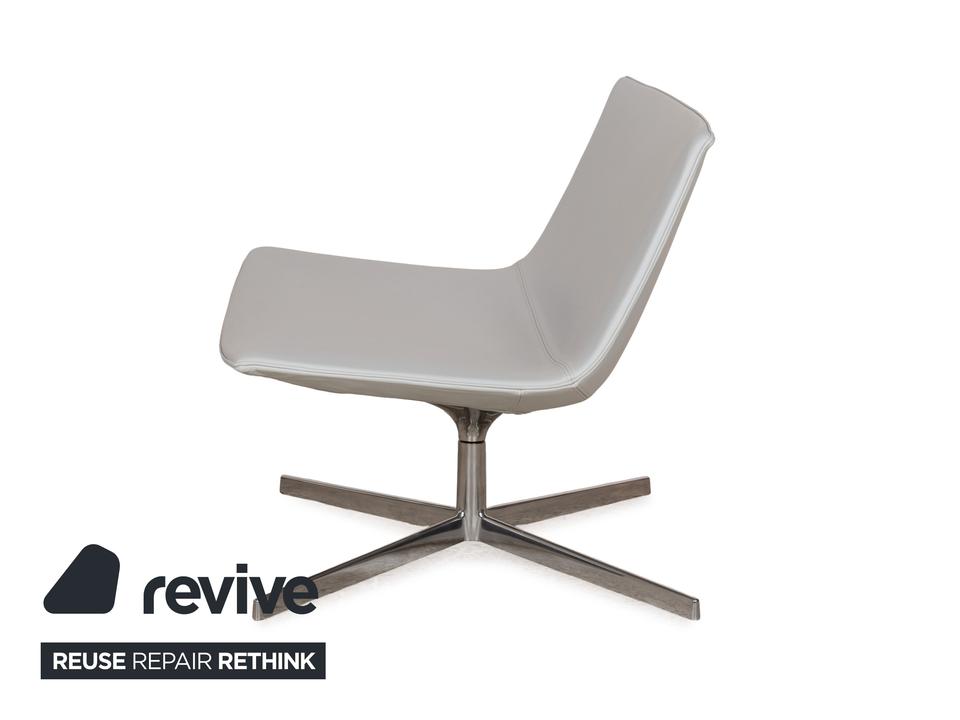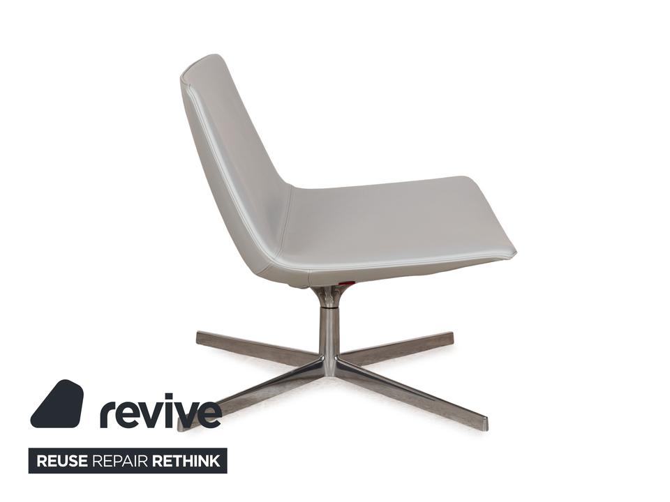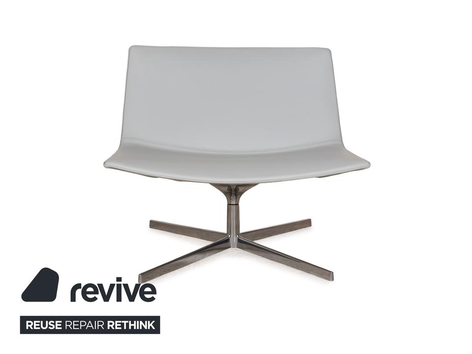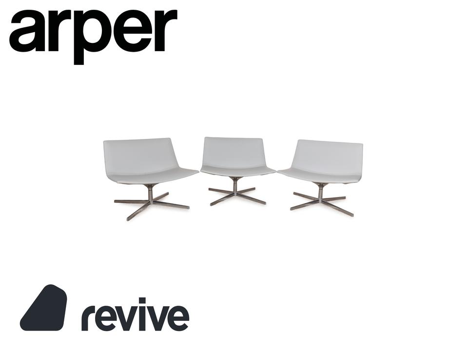 Die Sessel-Garnitur Catifa 80 von Arper, bestehend aus drei baugleichen Exemplaren, ist ein Zeichen für schlichtes, gelungenes Design. Der mit hellgrau-blauem Leder bezogene Korpus der Sessel ist auf einem Metallgestell mit Drehfunktion montiert und verzichtet auf jegliche Schnörkel und Extras – so kommen die klaren Kanten und minimalen Schwünge in der Gestaltung gut zur Geltung.