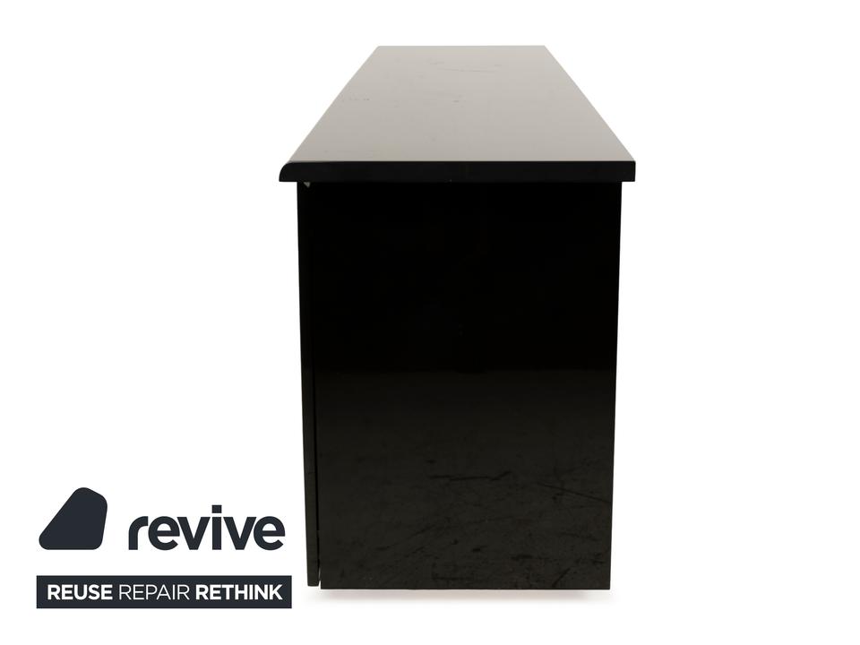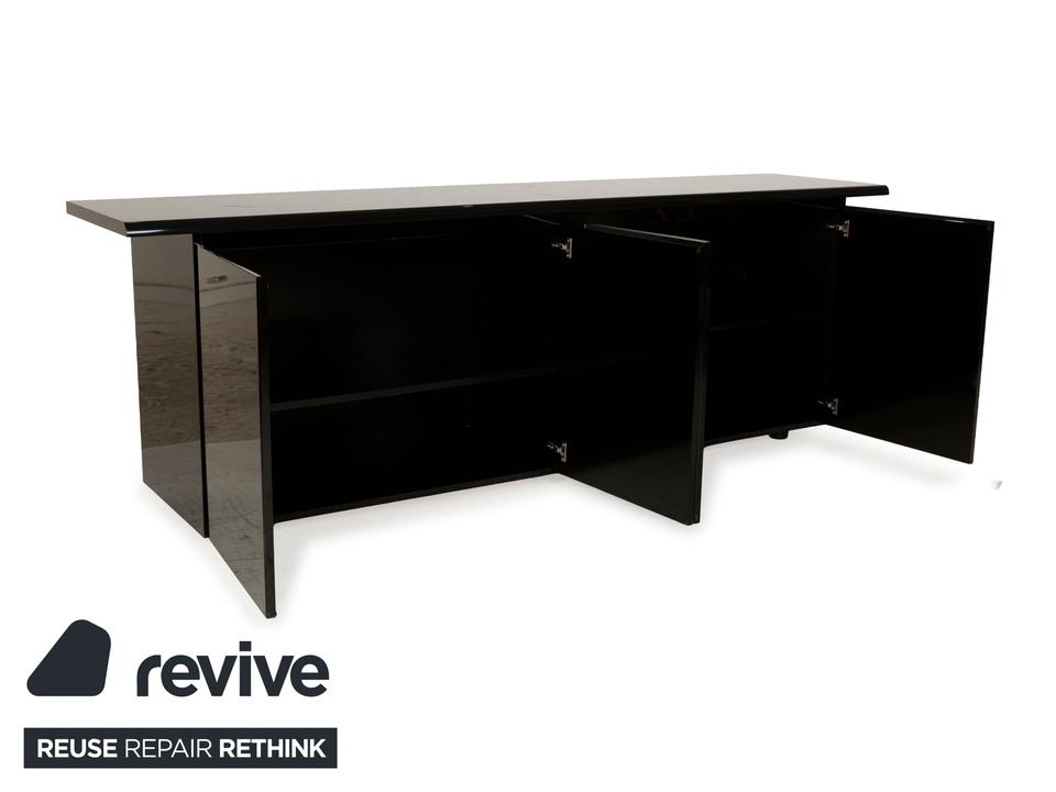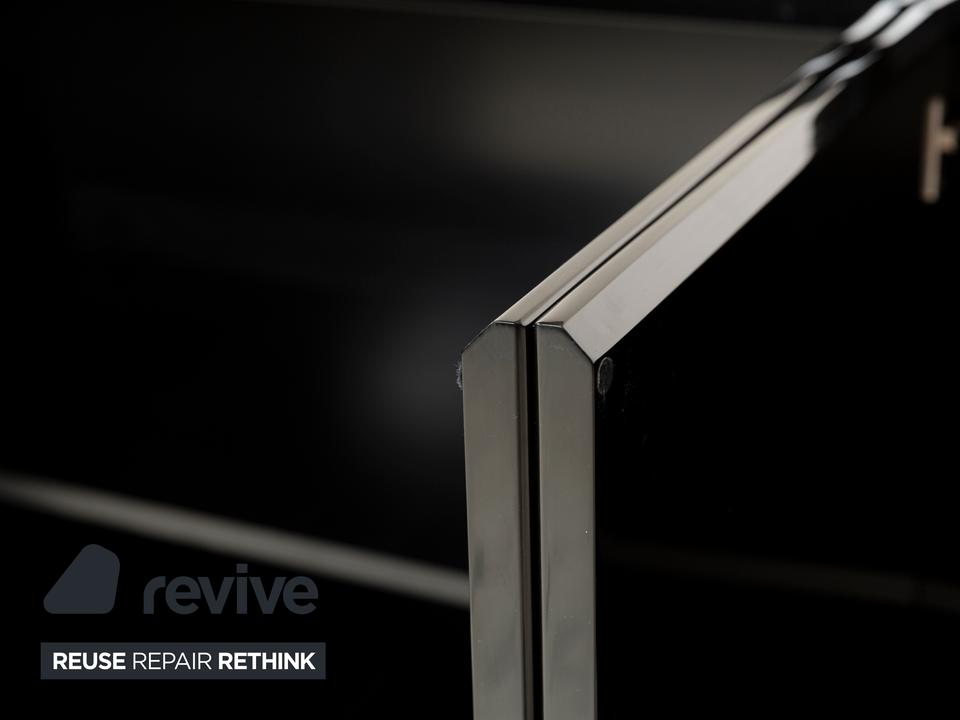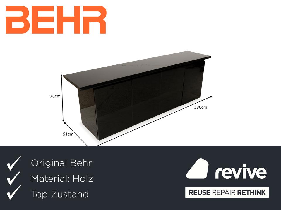 Das Sideboard von Behr ist aus schwarzem Glas und Holz gefertigt und überzeugt durch sein klassisches Design. Der Korpus steht auf sehr niedrigen, unscheinbaren Füßen und der minimale Abstand zum Boden nimmt dem dunklen Möbelstück die optische Schwere. Vier Türen machen den Weg frei zu den beiden großen, durch Trennböden aufgeteilte Fächern – hier ist genug Platz für alles, was stilvoll im Büro, Flur oder Wohnzimmer verstaut werden muss.