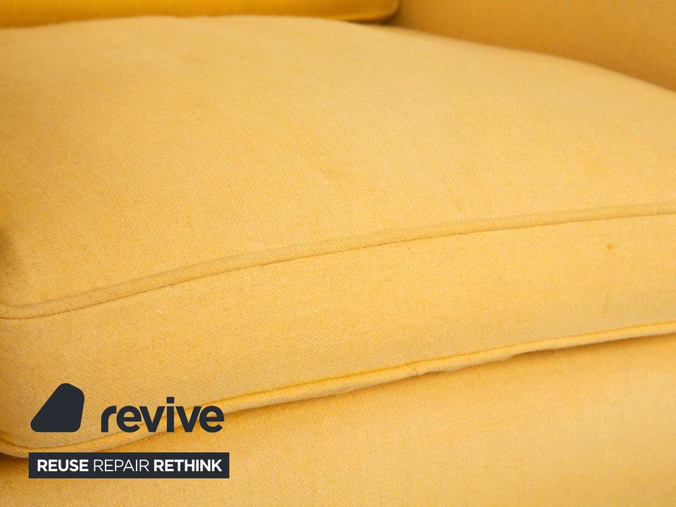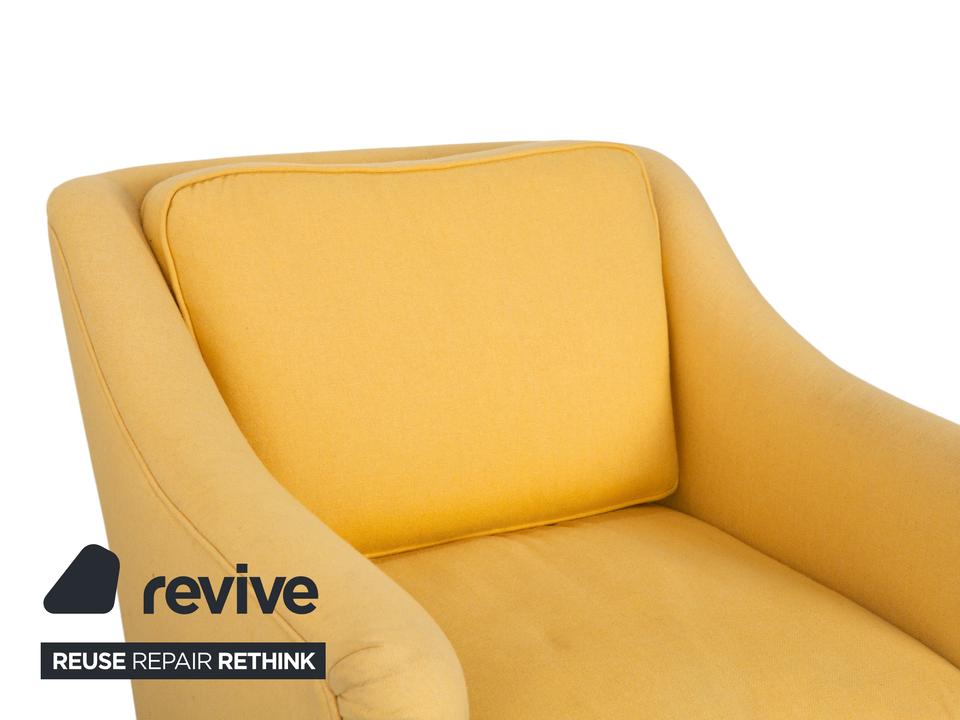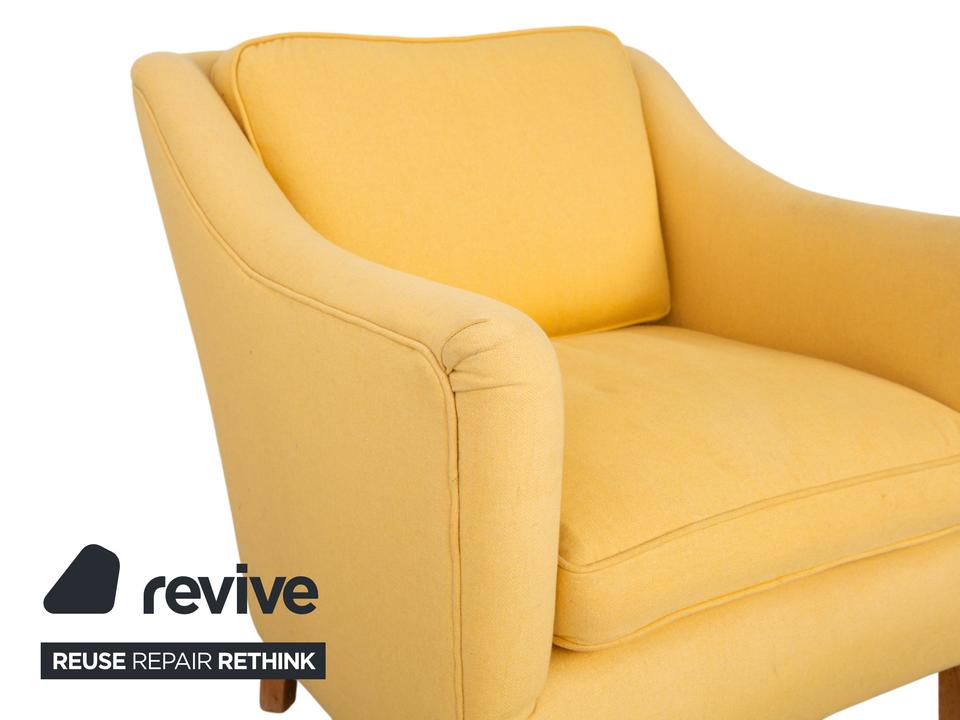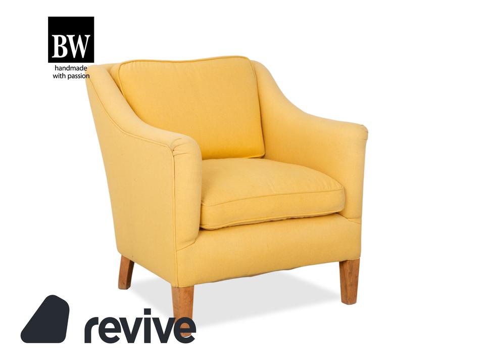 Mit diesem Sessel der renommierten Bielefelder Werkstätten (BW) holst du dir ein Stück klassische, deutsche Handwerkskunst in dein Zuhause. Die Marke steht für zeitlose Eleganz und eine Verarbeitungsqualität, die man sieht und spürt.Der Bezug ist in einem wunderschönen, warmen Gelb gehalten, das sofort eine sonnige und freundliche Atmosphäre in den Raum zaubert, ohne aufdringlich zu wirken. Die Formsprache ist traditionell und doch modern interpretiert: Die sanft geschwungenen Armlehnen umarmen den Sitzenden förmlich und gehen harmonisch in den Rücken über.Für exzellenten Sitzkomfort sorgen das dicke, lose Sitzkissen und das separate Rückenkissen, die eine gemütliche, aber gestützte Position ermöglichen. Getragen wird der Sessel von hellen Holzfüßen, die leicht konisch zulaufen und einen natürlichen, bodenständigen Kontrast zum frischen Stoff bilden. Ein perfekter Solitär für eine gemütliche Leseecke oder als farbiger Akzent im Wohnzimmer.