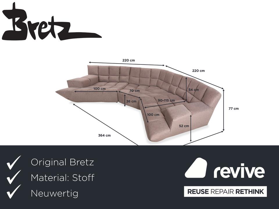 Mit dem Modell „Cloud 7“ von Bretz holst du dir nicht einfach nur ein Sofa, sondern eine extravagante Wohnskulptur in dein Zuhause. Die deutsche Manufaktur Bretz ist bekannt für mutiges, unkonventionelles Design – und dieses Sofa macht seinem Namen alle Ehre: Es sieht aus wie eine gemütliche Wolkenlandschaft.Das absolute Highlight an diesem Stück ist der komplette Neubezug: Das Sofa erstrahlt in einem modernen, warmen Grau-Beige (Greige/Taupe), das makellos ist und sich vielseitiger kombinieren lässt als die oft sehr knalligen Originalstoffe von Bretz. Charakteristisch für die Cloud 7 ist die aufwendige Kassetten-Steppung, die sich über die gesamte Sitz- und Rückenfläche zieht und die weiche, voluminöse Optik verstärkt.Die Form ist asymmetrisch und organisch, ohne harte Kanten, was den „fließenden“ Charakter unterstreicht. Mit seiner übertiefen Sitzfläche und der soften Polsterung bietet es ein unvergleichliches Sitzgefühl – man sitzt nicht darauf, man versinkt förmlich darin. Ein spektakulärer Mittelpunkt für jedes große Wohnzimmer.