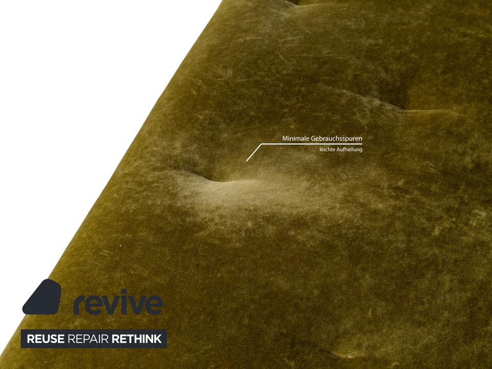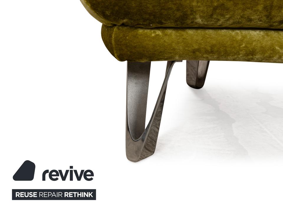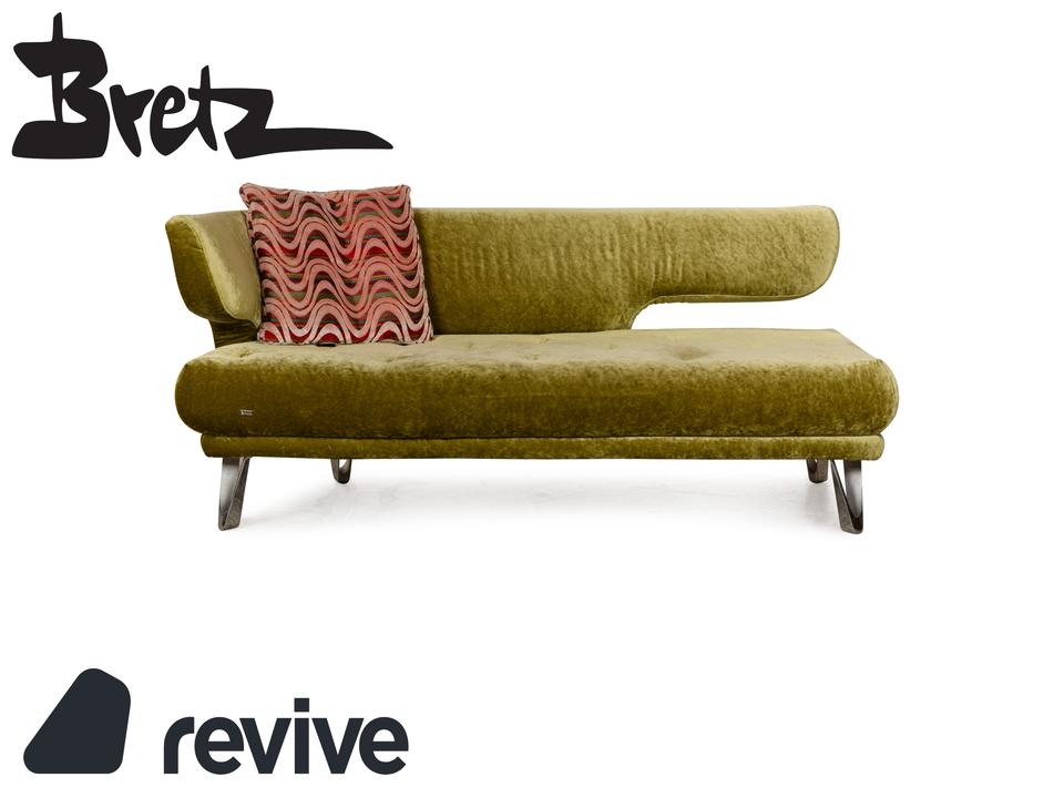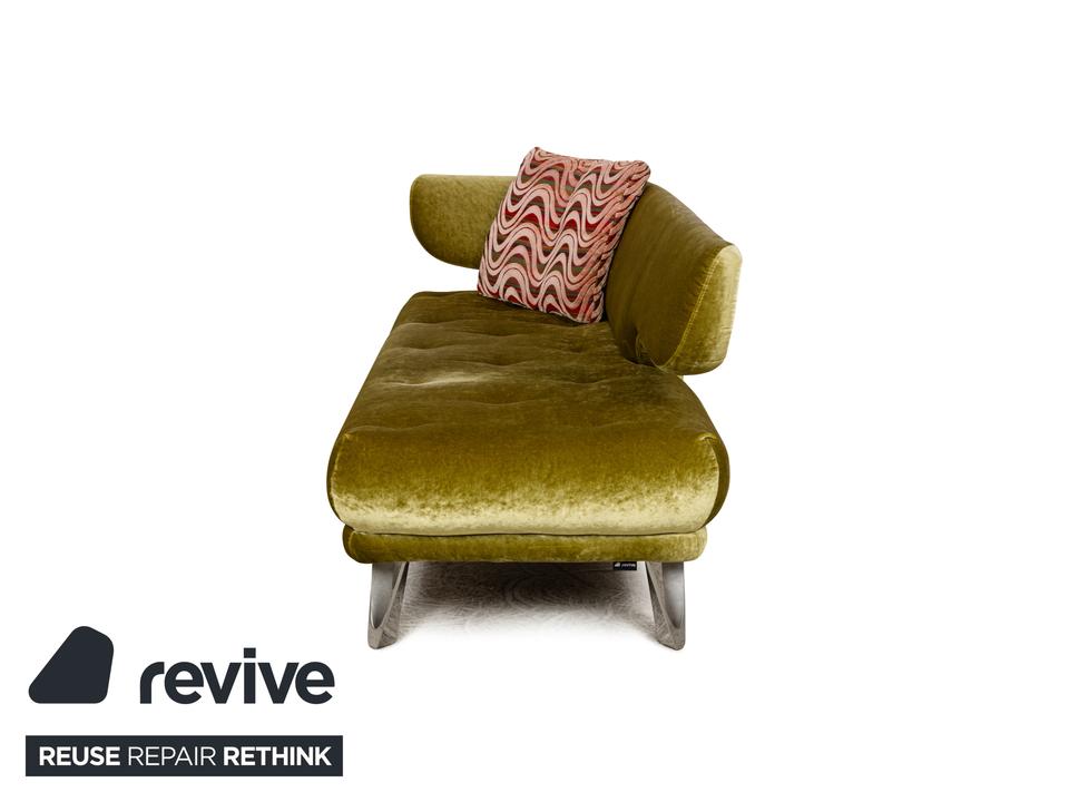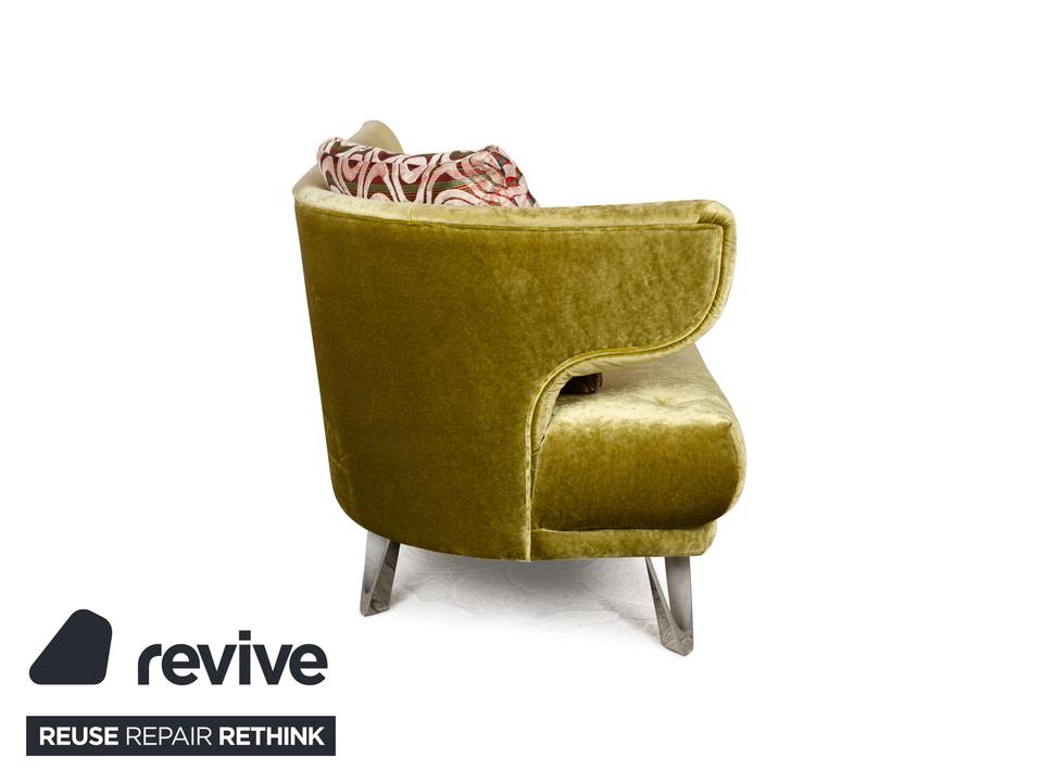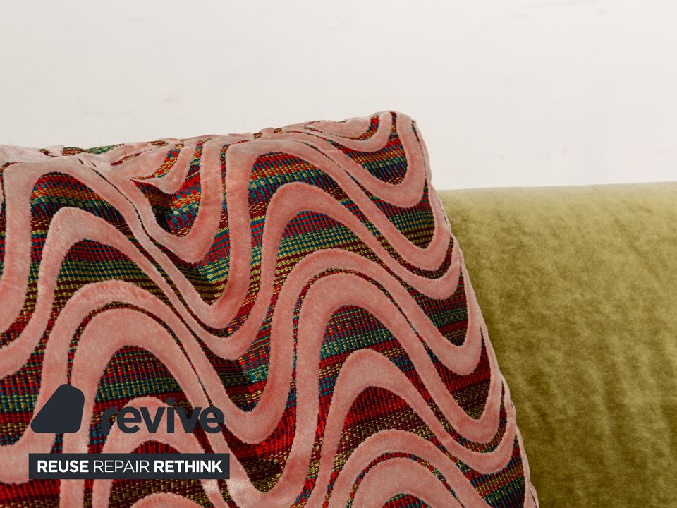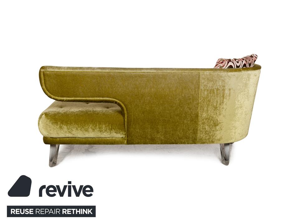 Das Sofa Croissant von Bretz ist mit grünem und gemustertem Stoff bezogen und steht auf leicht angewinkelten Beinen aus Metall. Der Dreisitzer ist von oben bis unten ein Zeichen für Extravaganz: Die besonderen, scheinbar gefalteteten Beine und der exklusive Stoffbezug gehen einen gelungenen Kontrast ein, der durch die asymmetrische Rückenlehne abgerundet wird.