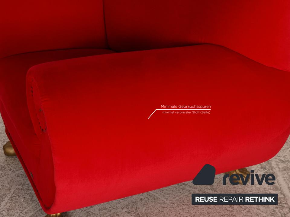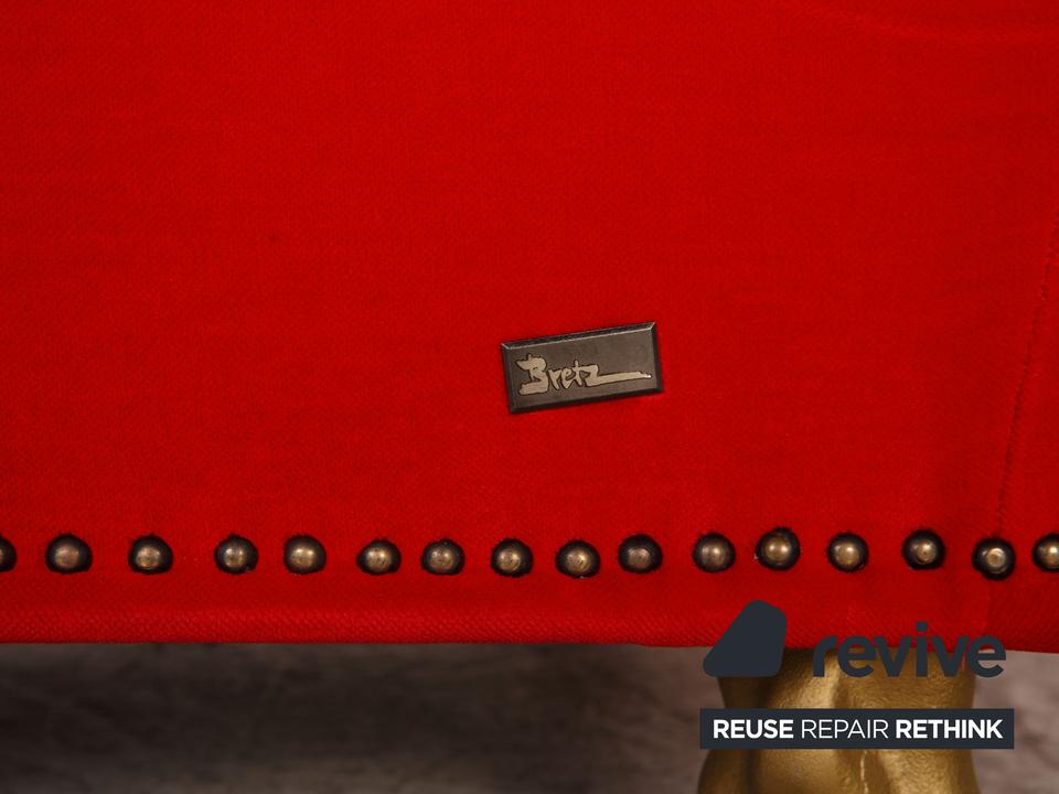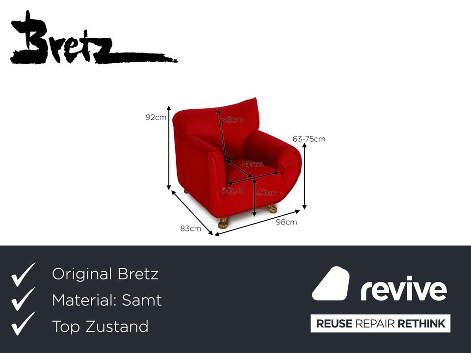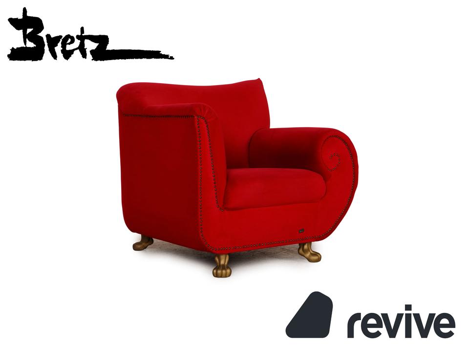 Der Sessel Gaudi von Bretz ist mit einem roten Samtstoff bezogen und steht auf bronzefarbenen Füßen. Er zeichnet sich durch das extravagante Design und die gedrehten, geschwungenen Lehnen aus.