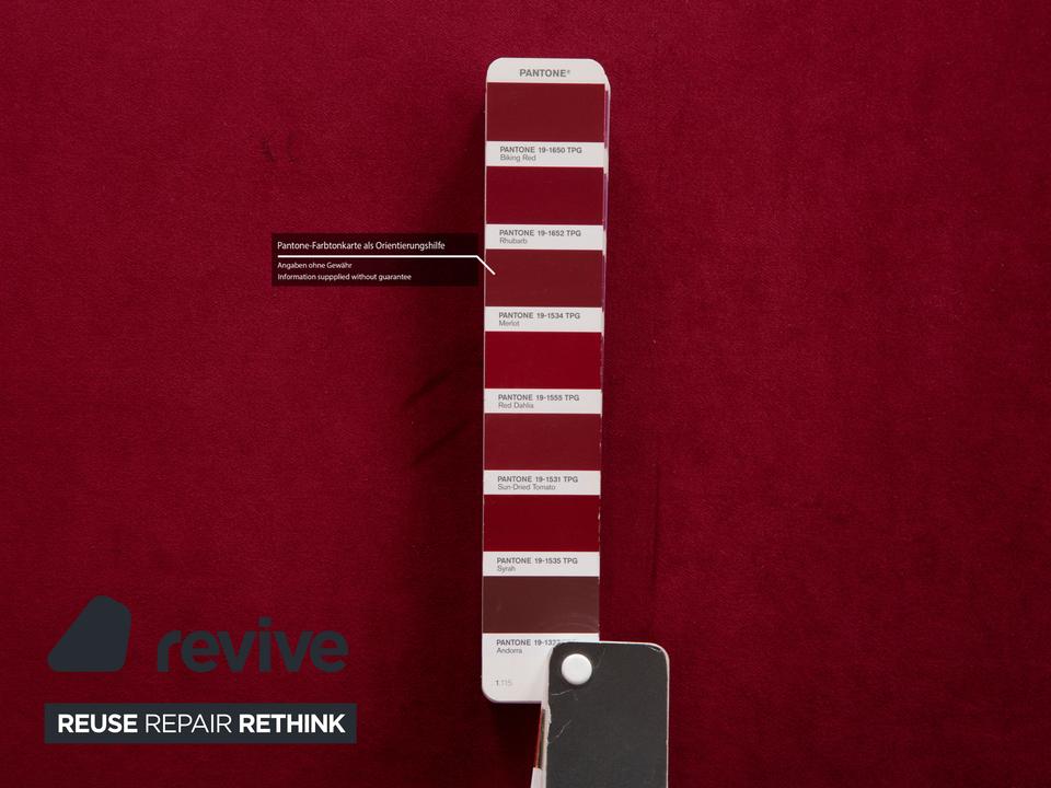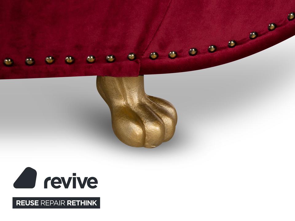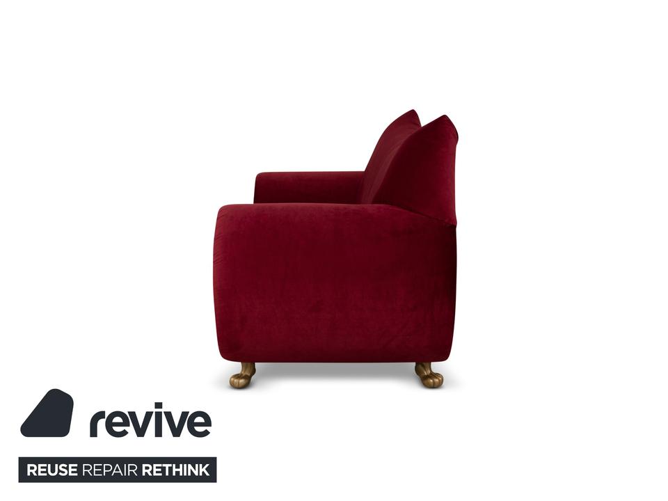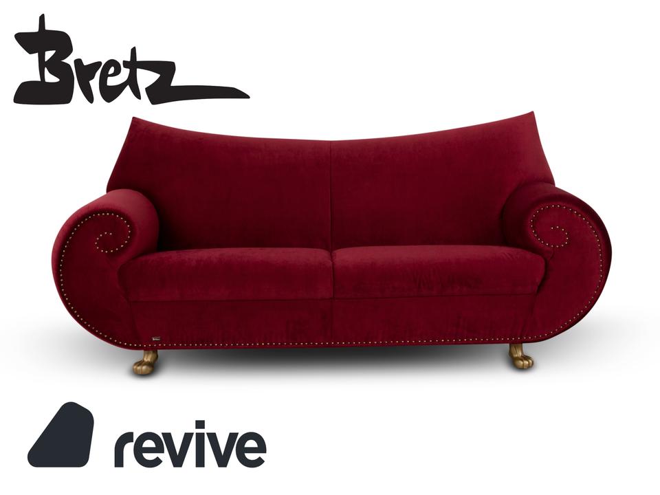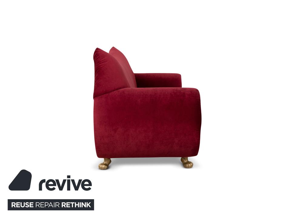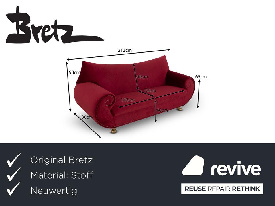 Der Dreisitzer Gaudi von Bretz ist mit einem roten Qualitätsstoff von Höpke (MELIA FR 851; Material: 100% Polyester)neu bezogen worden und steh auf silbernen Füßen. Er überzeugt durch das extravagante Design und die prunkvolle Optik.