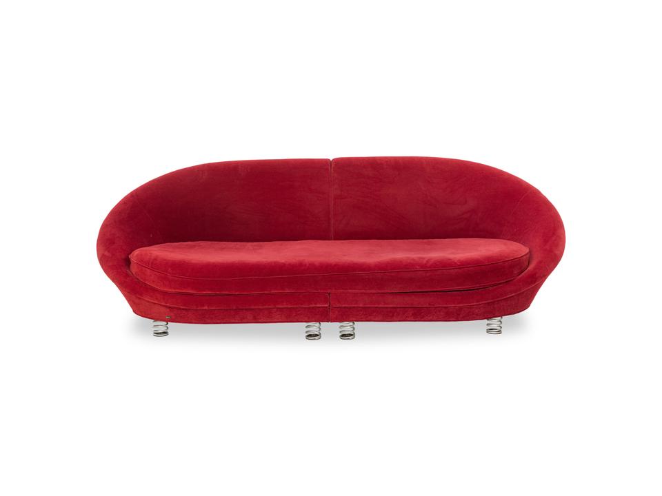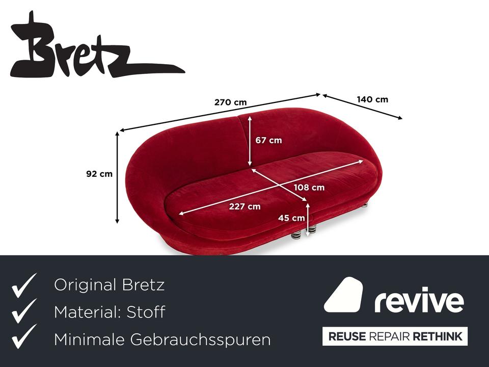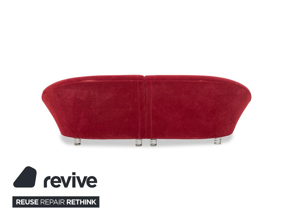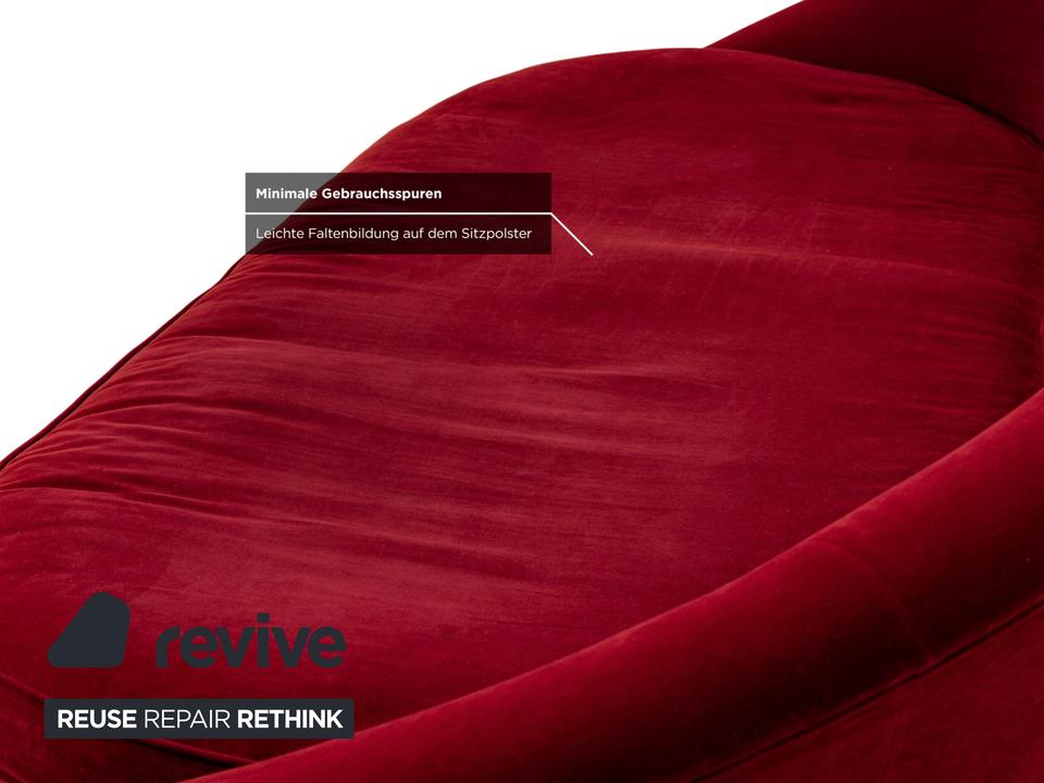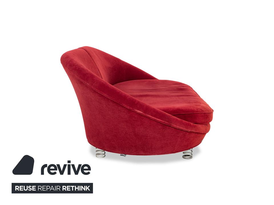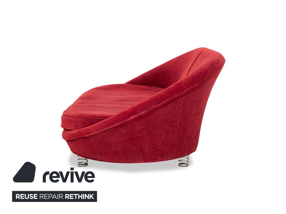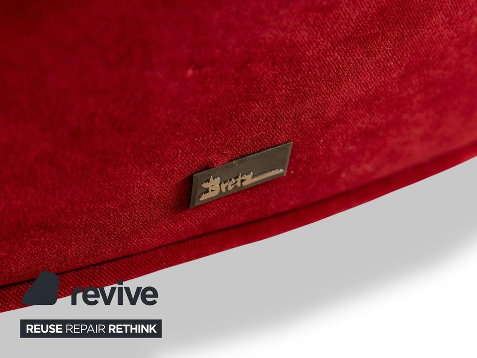 Der Viersitzer Pool von Bretz ist mit einem roten Qualitätsstoff bezogen und steh auf silbernen Feder-Füßen. Er überzeugt durch das extravagante Design und die runde Optik.