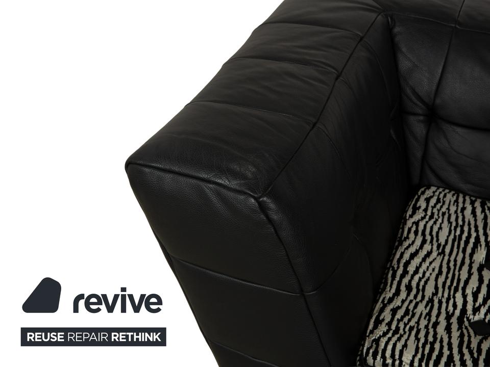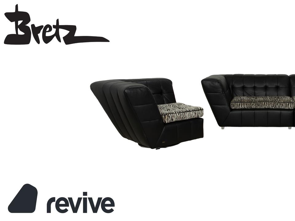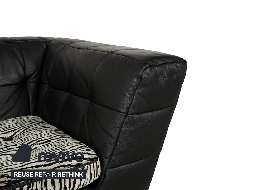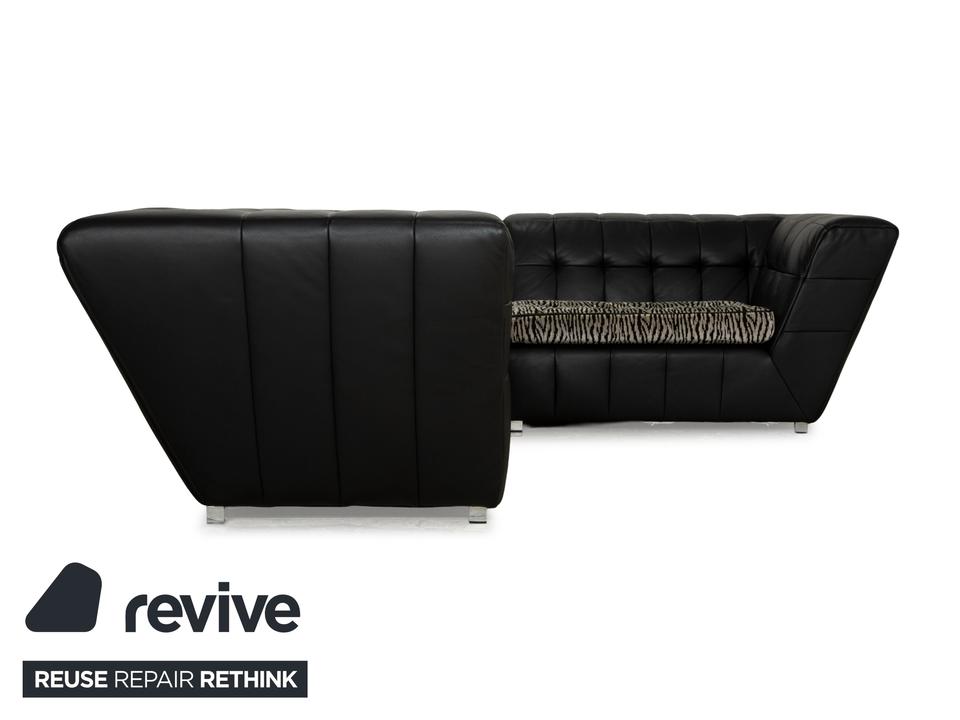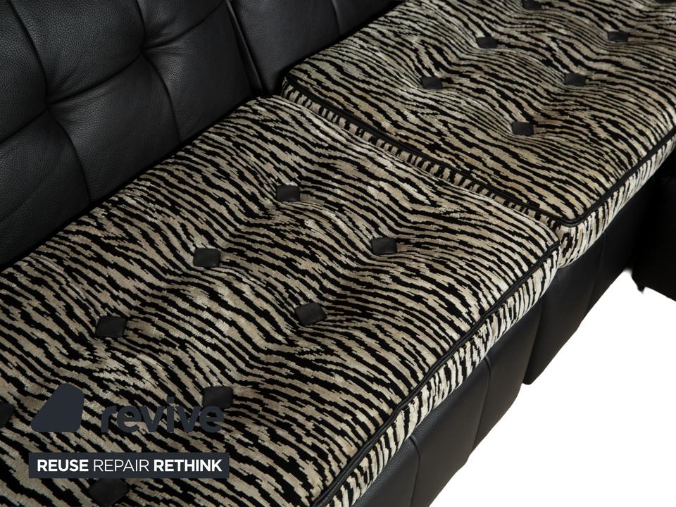 Die Sofa-Garnitur Tiziana von Bretz, bestehend aus einem Ecksofa und dem dazu passenden Sessel mit Drehfunktion, ist mit schwarzem Leder bezogen und steht auf schmalen Metallfüßen. Sie zeichnet sich durch ihr unkonventionelles, ausladendes Design aus. Die mit schwarz-weißem Stoff in Zebramuster bezogenen Sitzpolster bilden einen spannenden Kontrast zur gesteppten Bezugsfläche des Korpus. Mit diesem Set kommt ein echter Hingucker ins moderne Wohnzimmer!