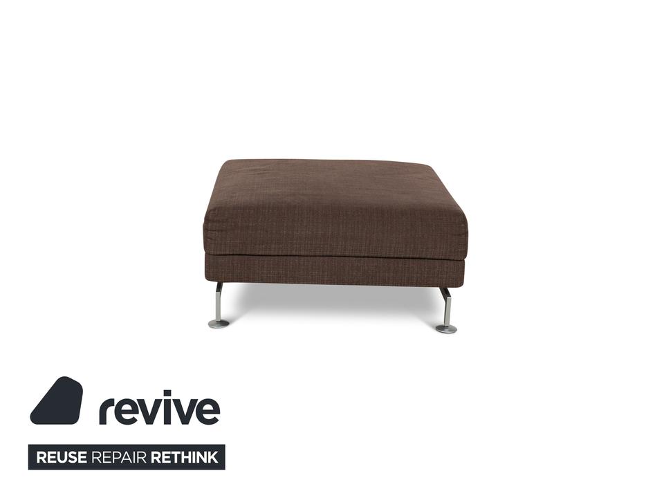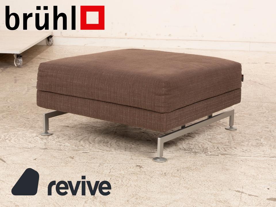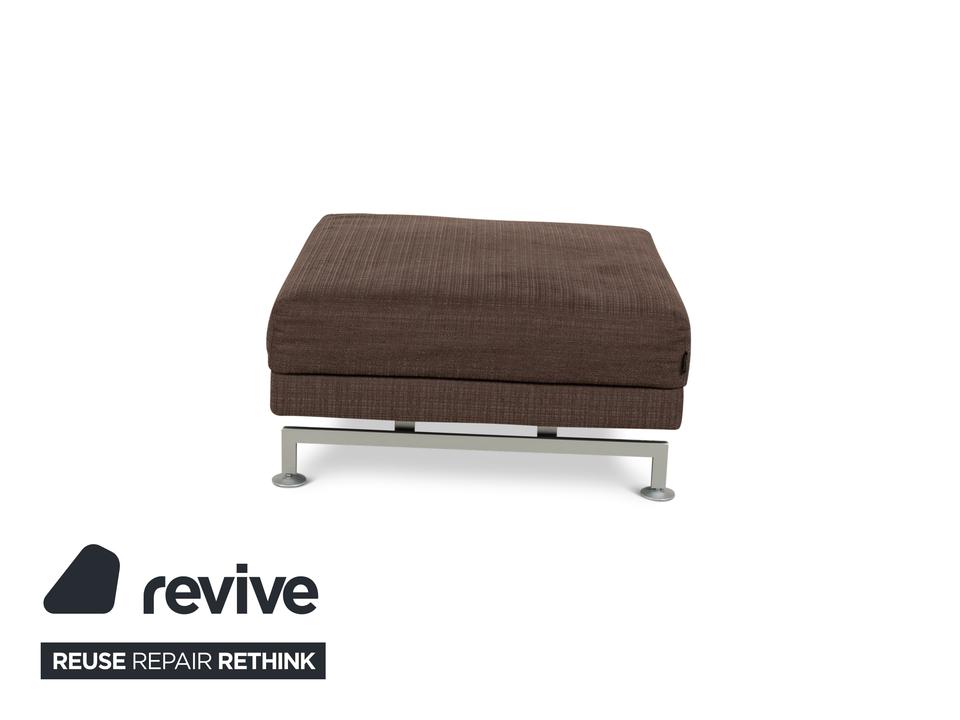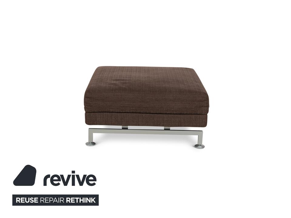 Der Moule Hocker von Brühl ist mit einem dunkelbraunen Stoff bezogen und steht auf silbernen Metallfüßen. Das schlichte Design zeichnet ihn aus.