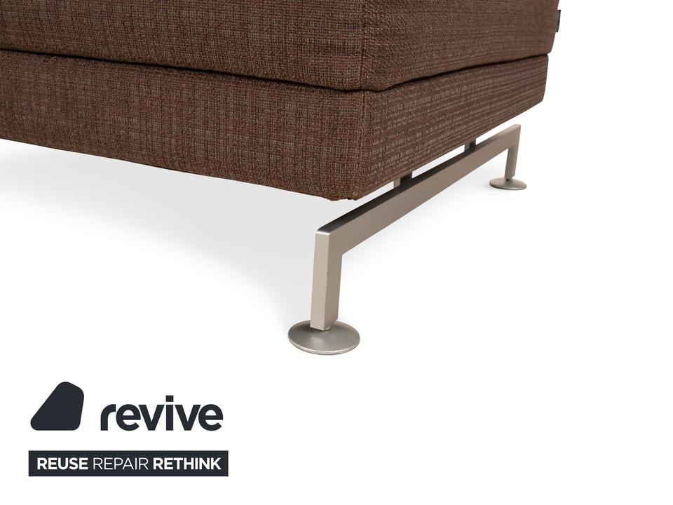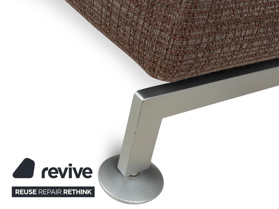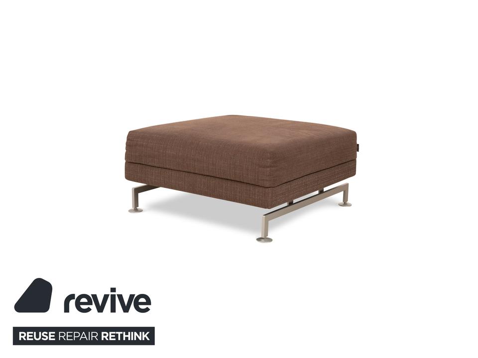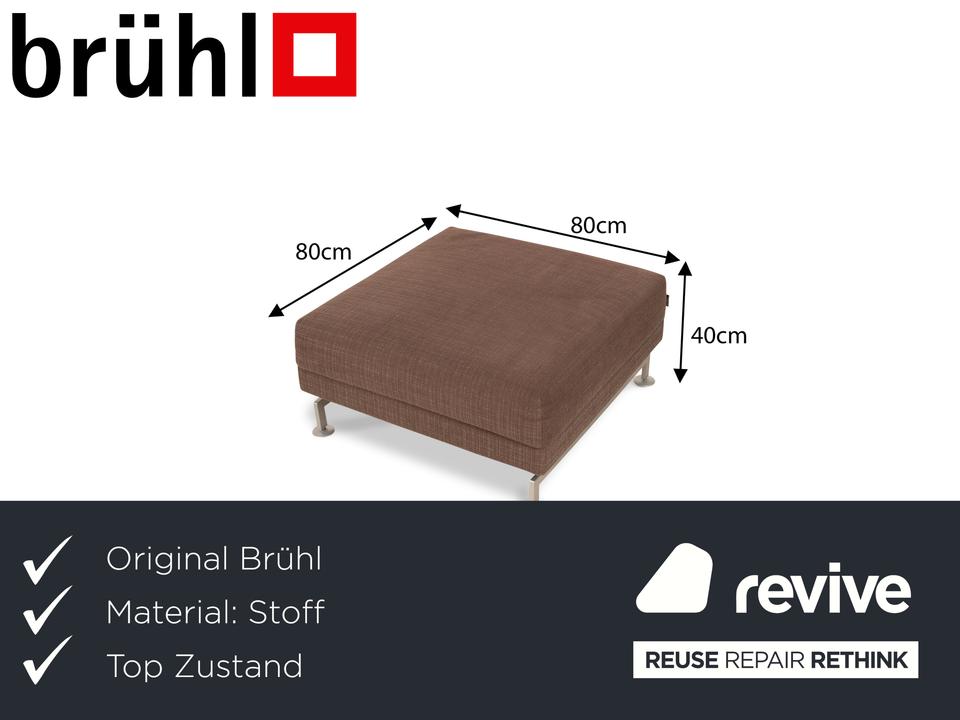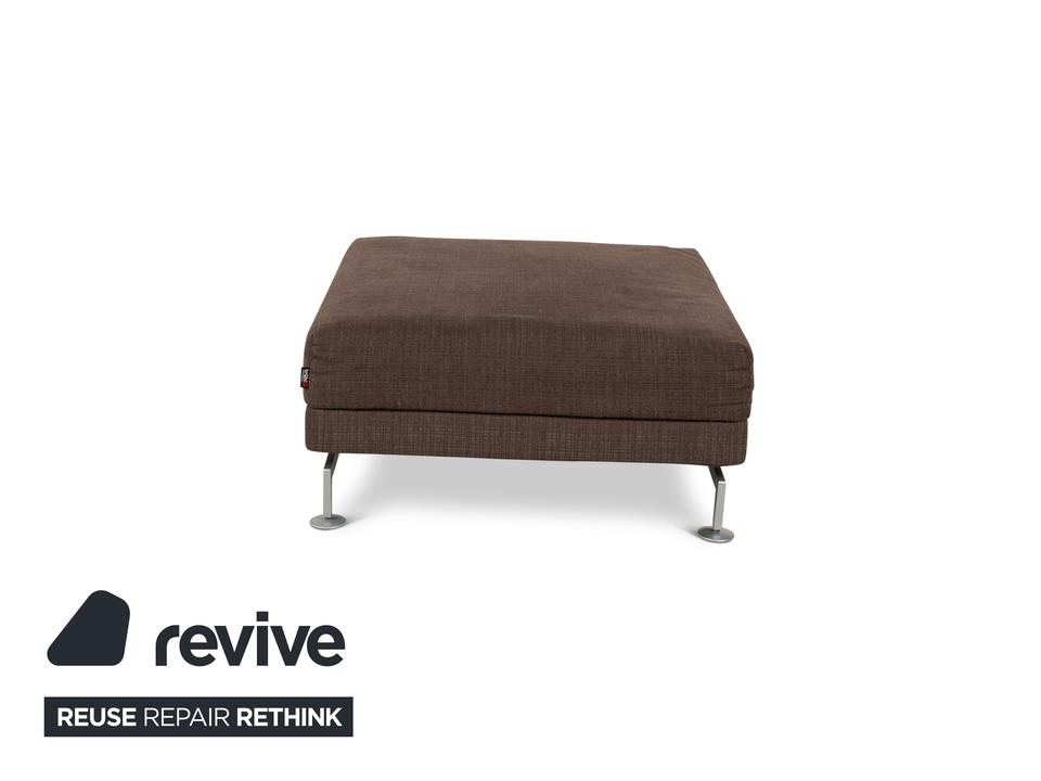 Der Moule Hocker von Brühl ist mit einem dunkelbraunen Stoff bezogen und steht auf silbernen Metallfüßen. Das schlichte Design zeichnet ihn aus.