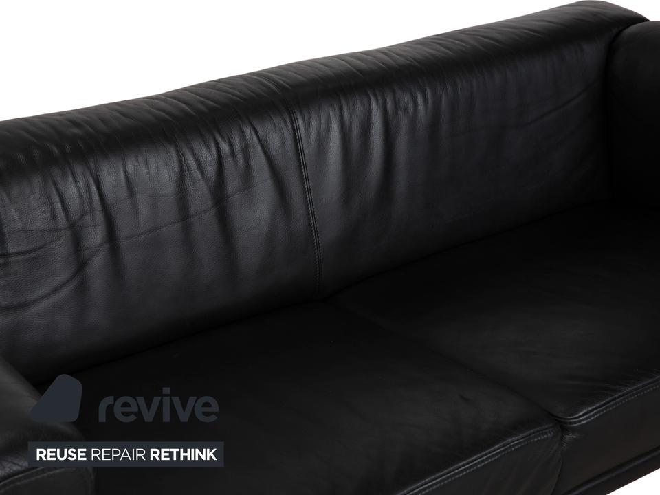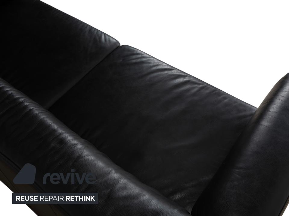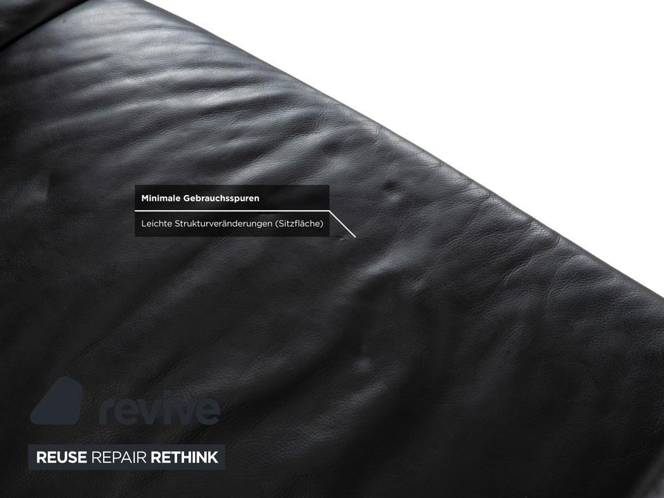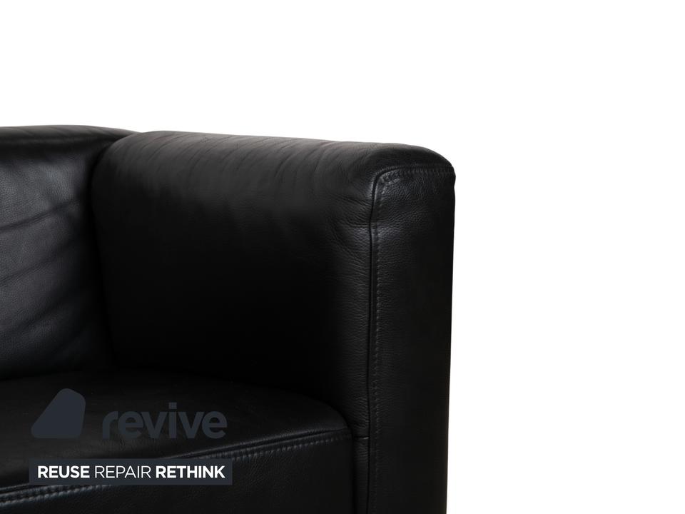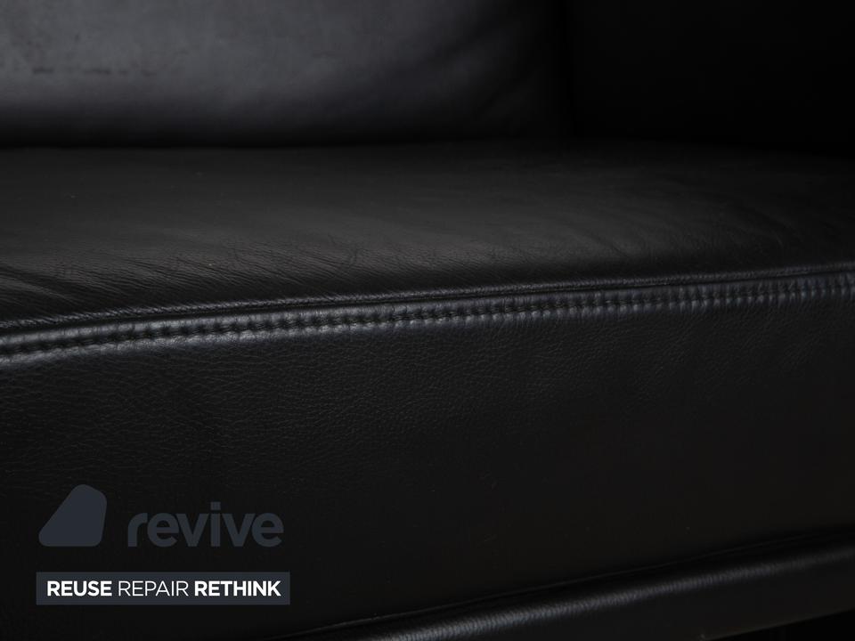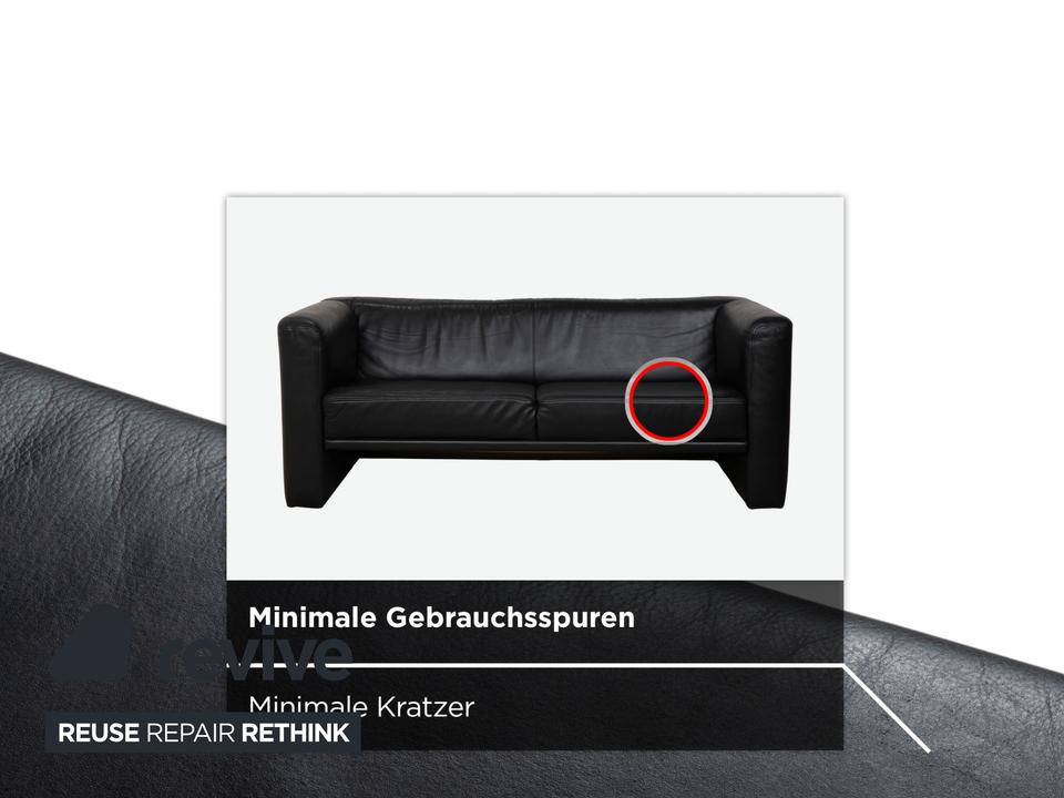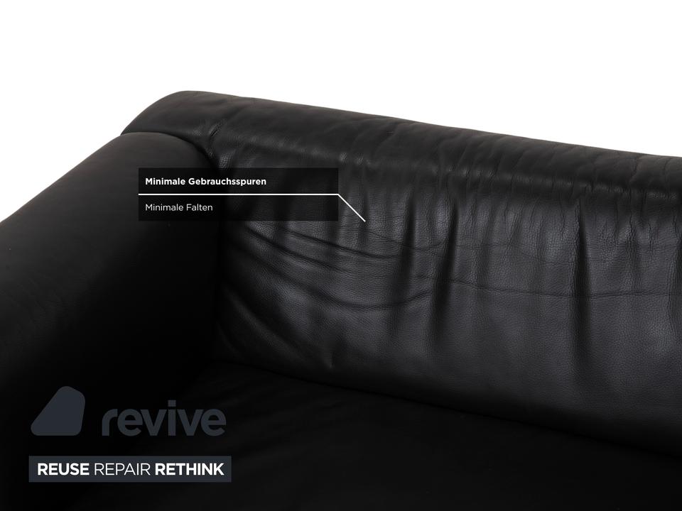 Das Modell „Visavis“ von Brühl ist ein Möbelstück, das sofort auffällt, weil es mit den gängigen Sehgewohnheiten bricht. Statt auf vier klassischen Füßen zu stehen, ruht dieser Zweisitzer auf massiven, lederbezogenen Wangen, die nahtlos in die Seitenteile übergehen. Das verleiht dem Sofa eine unglaublich satte, fast architektonische Präsenz im Raum – es wirkt wie aus einem Block gemeißelt, aber dabei wunderbar weich.Das schwarze Leder unterstreicht diesen skulpturalen Charakter, ist aber haptisch sehr angenehm und einladend. Ein tolles Detail sind die kissenartigen Polster auf den Armlehnen, die dem strengen Aufbau die Härte nehmen und förmlich zum Anlehnen einladen. Es ist ein kompaktes, charakterstarkes Sofa, das sich perfekt eignet, um einen stilvollen Akzent zu setzen, ohne dabei auf Gemütlichkeit zu verzichten. Ein Design-Statement für alle, die das Besondere jenseits des Mainstreams suchen.