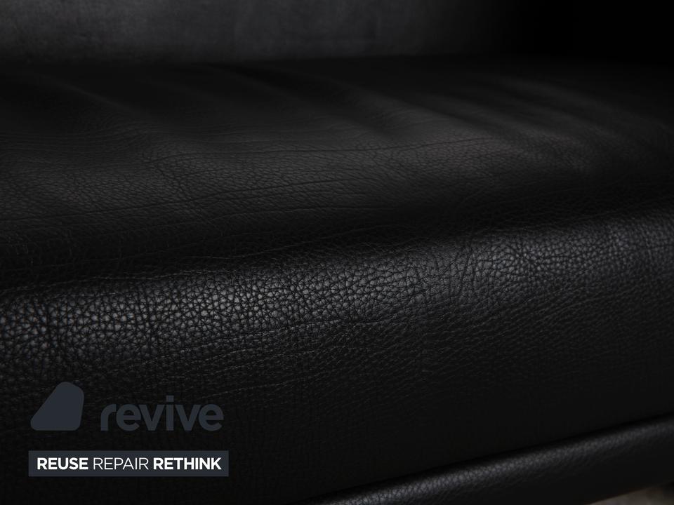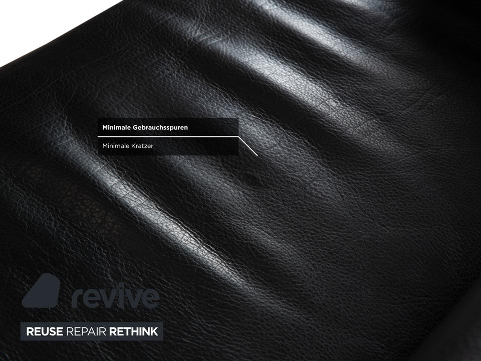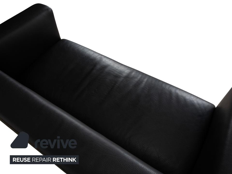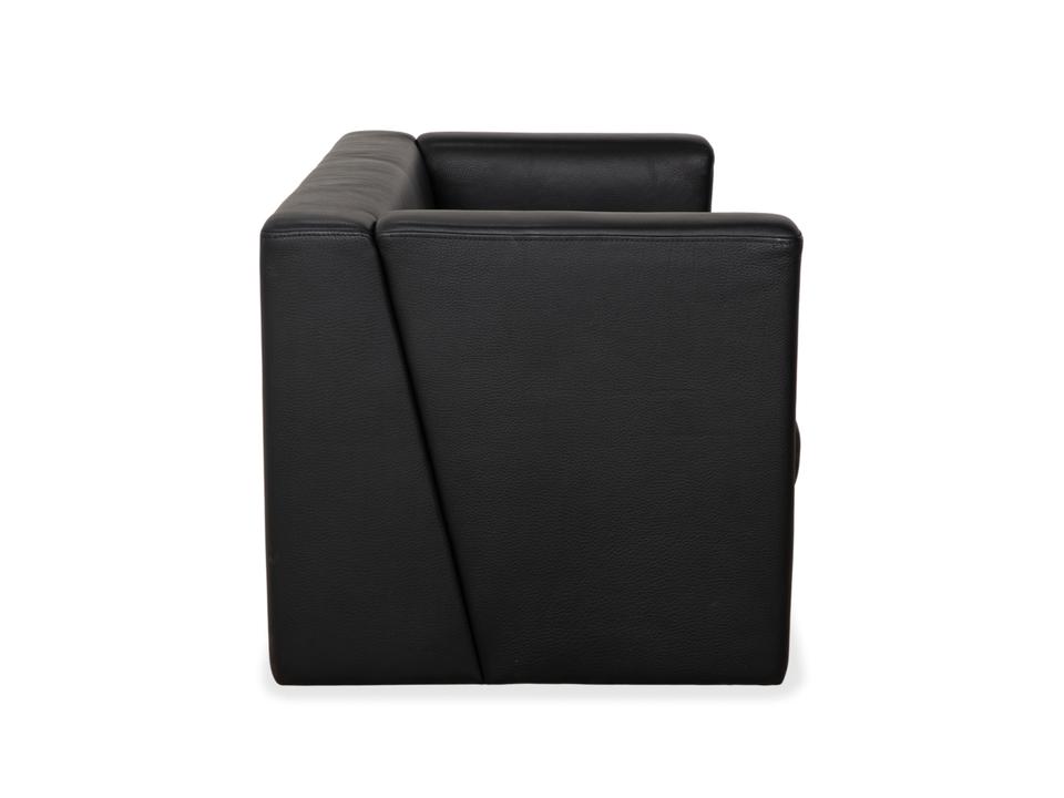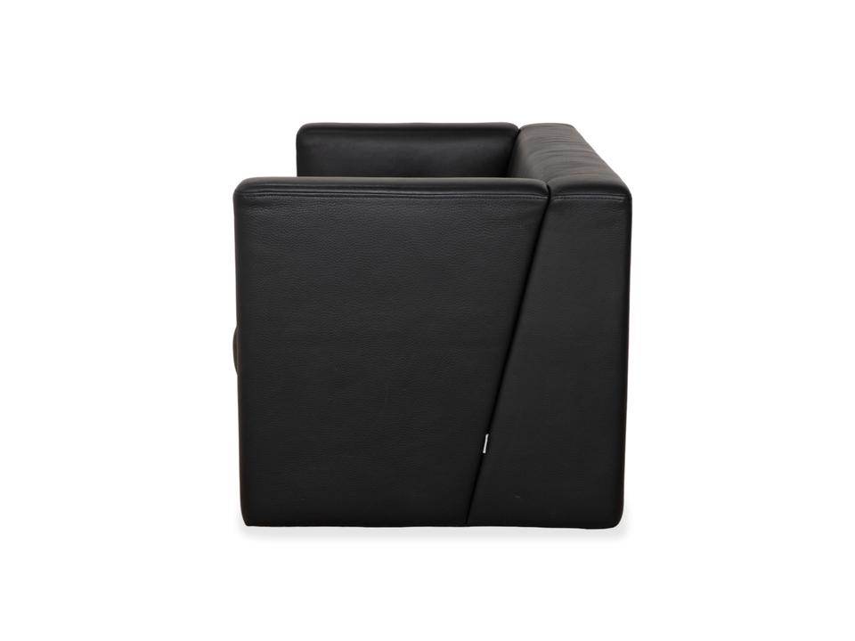 Das Modell „Visavis“ von Brühl ist ein Möbelstück, das sofort auffällt, weil es mit den gängigen Sehgewohnheiten bricht. Statt auf vier klassischen Füßen zu stehen, ruht dieser Zweisitzer auf massiven, lederbezogenen Wangen, die nahtlos in die Seitenteile übergehen. Das verleiht dem Sofa eine unglaublich satte, fast architektonische Präsenz im Raum – es wirkt wie aus einem Block gemeißelt, aber dabei wunderbar weich.Das schwarze Leder unterstreicht diesen skulpturalen Charakter, ist aber haptisch sehr angenehm und einladend. Ein tolles Detail sind die kissenartigen Polster auf den Armlehnen, die dem strengen Aufbau die Härte nehmen und förmlich zum Anlehnen einladen. Es ist ein kompaktes, charakterstarkes Sofa, das sich perfekt eignet, um einen stilvollen Akzent zu setzen, ohne dabei auf Gemütlichkeit zu verzichten. Ein Design-Statement für alle, die das Besondere jenseits des Mainstreams suchen.