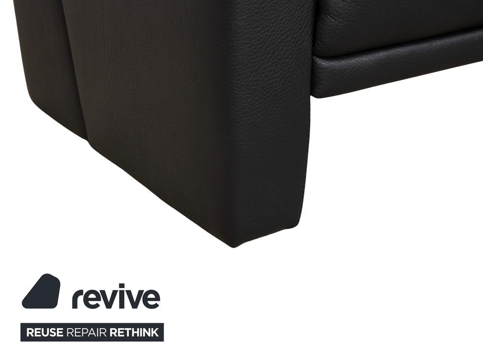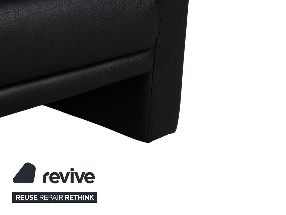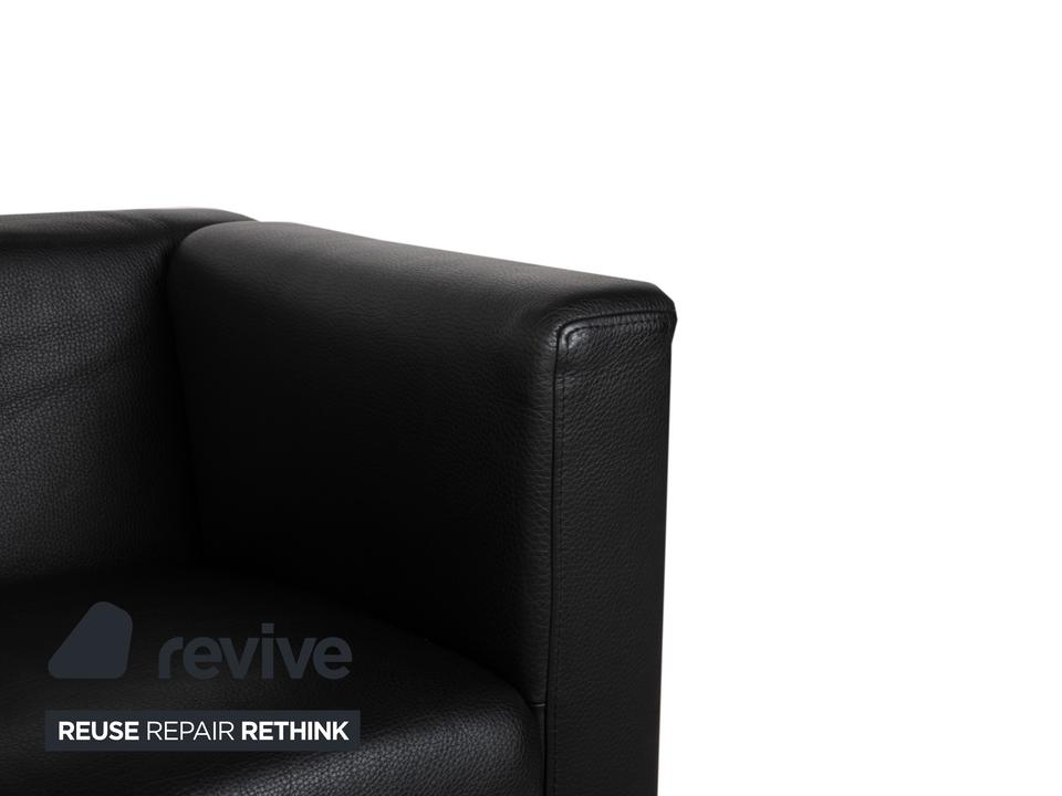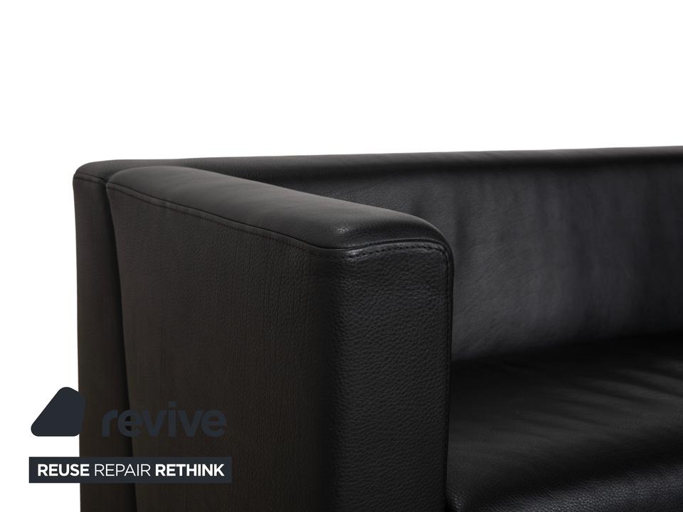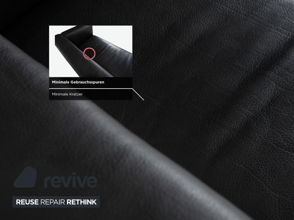 Das Modell „Visavis“ von Brühl ist ein Möbelstück, das sofort auffällt, weil es mit den gängigen Sehgewohnheiten bricht. Statt auf vier klassischen Füßen zu stehen, ruht dieser Zweisitzer auf massiven, lederbezogenen Wangen, die nahtlos in die Seitenteile übergehen. Das verleiht dem Sofa eine unglaublich satte, fast architektonische Präsenz im Raum – es wirkt wie aus einem Block gemeißelt, aber dabei wunderbar weich.Das schwarze Leder unterstreicht diesen skulpturalen Charakter, ist aber haptisch sehr angenehm und einladend. Ein tolles Detail sind die kissenartigen Polster auf den Armlehnen, die dem strengen Aufbau die Härte nehmen und förmlich zum Anlehnen einladen. Es ist ein kompaktes, charakterstarkes Sofa, das sich perfekt eignet, um einen stilvollen Akzent zu setzen, ohne dabei auf Gemütlichkeit zu verzichten. Ein Design-Statement für alle, die das Besondere jenseits des Mainstreams suchen.
