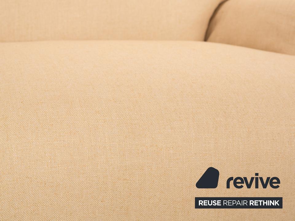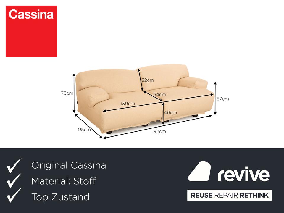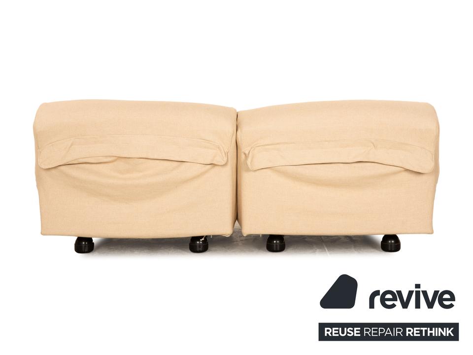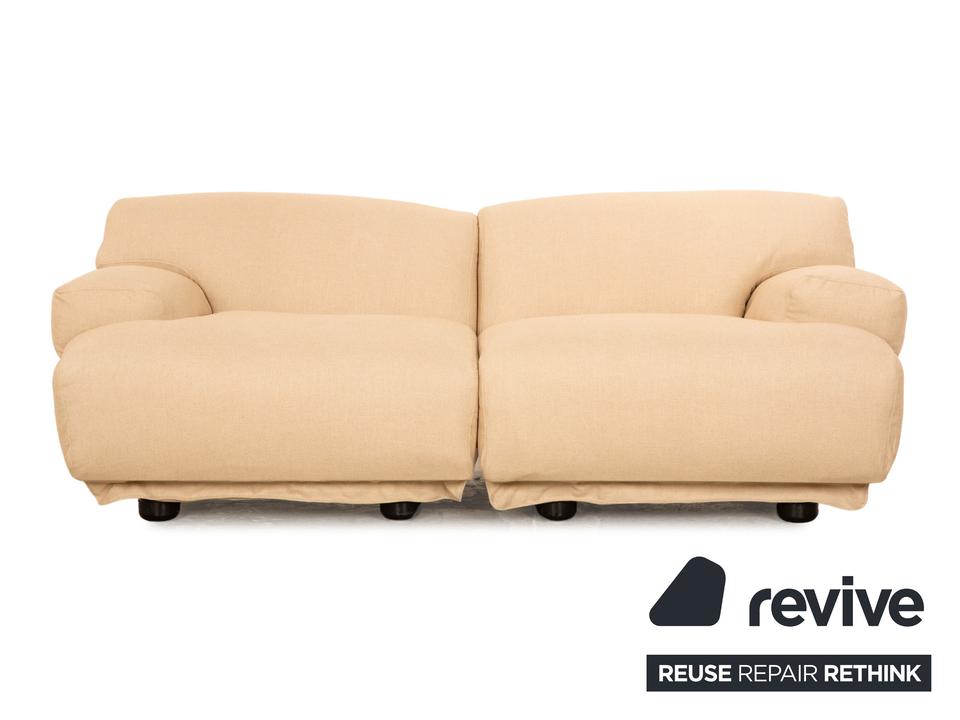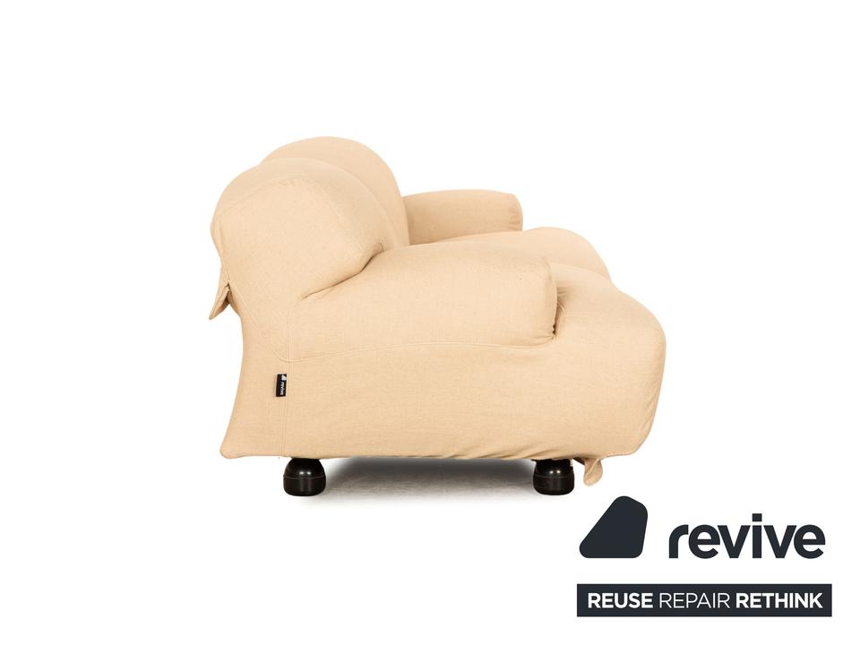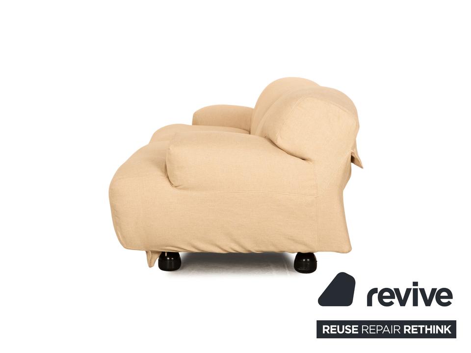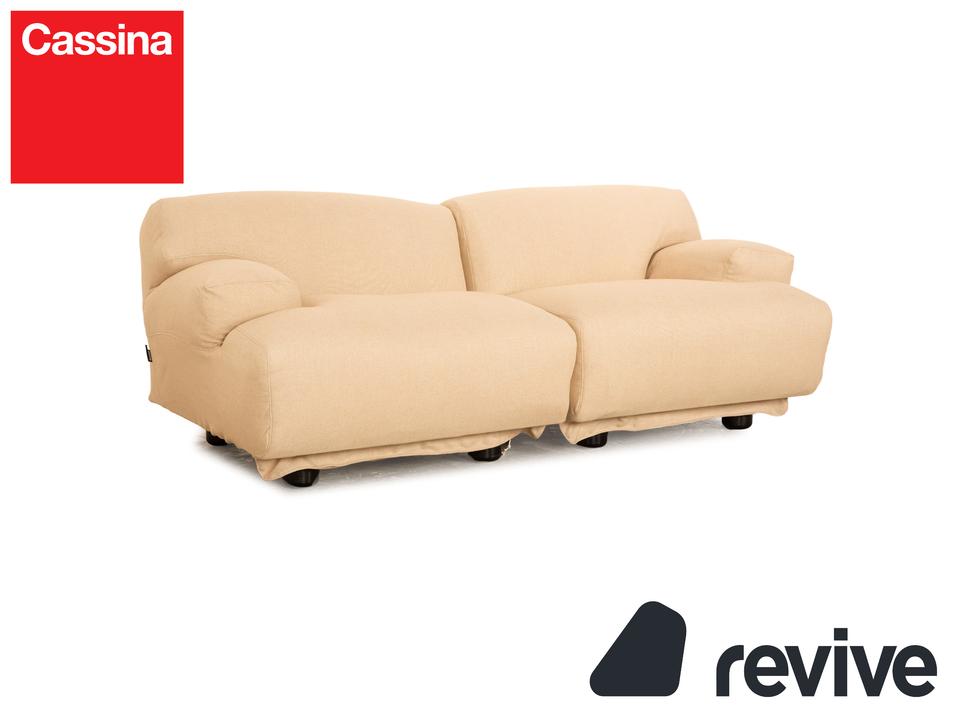 Der Zweisitzer Fiandra von Cassina ist mit einem cremefarbenen Stoff neu bezogen worden und steht auf schwarzen Füßen. Er zeichnet sich durch das kompakte, minimalistische Design und die stilvolle Optik aus.