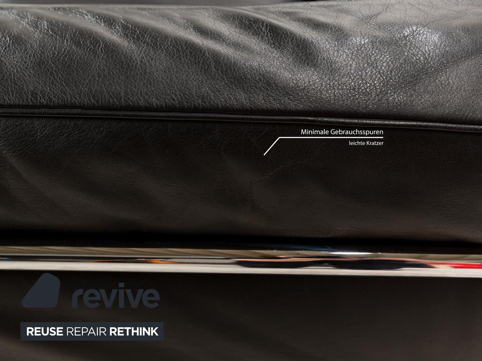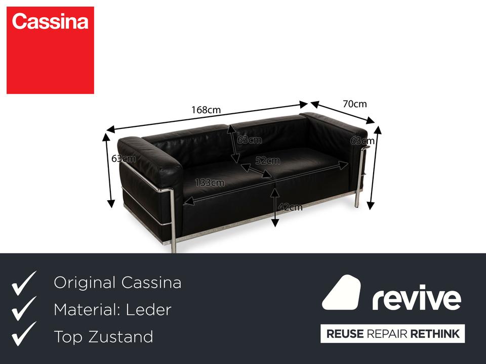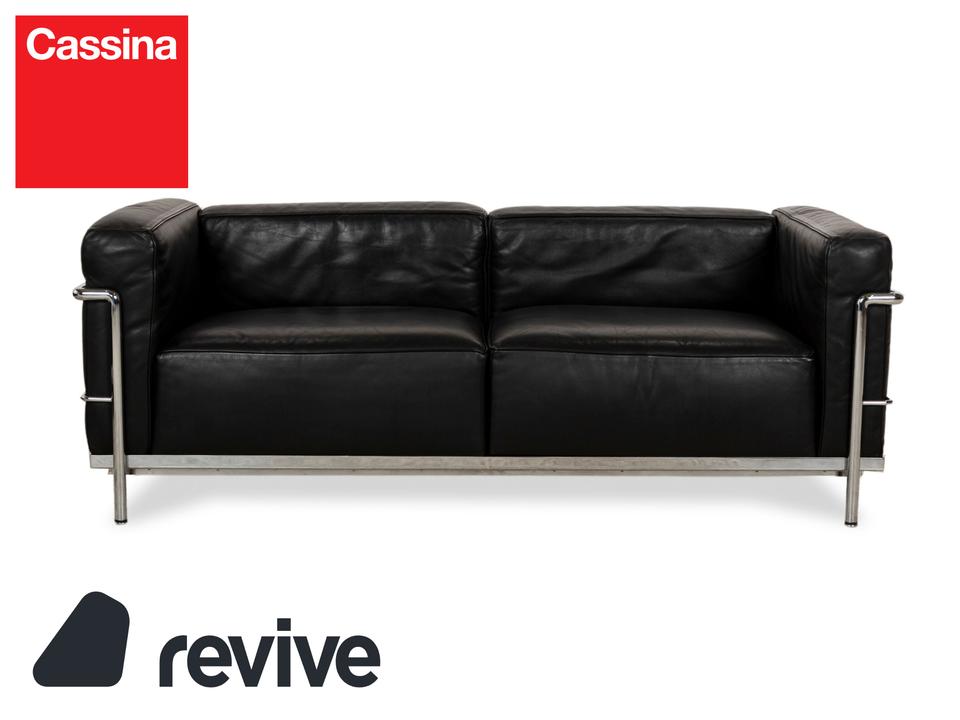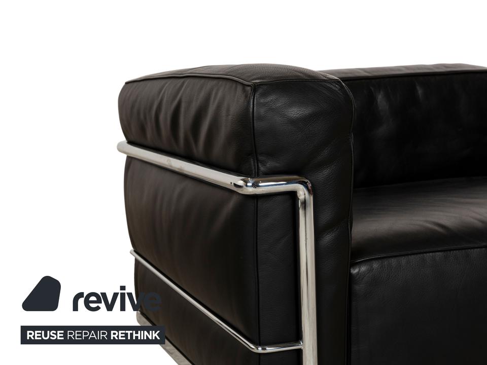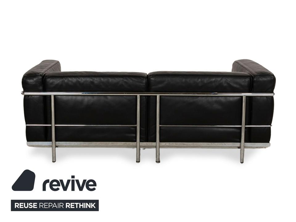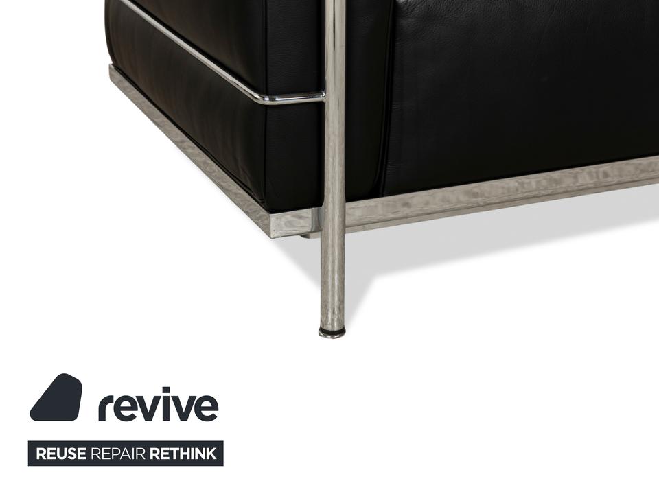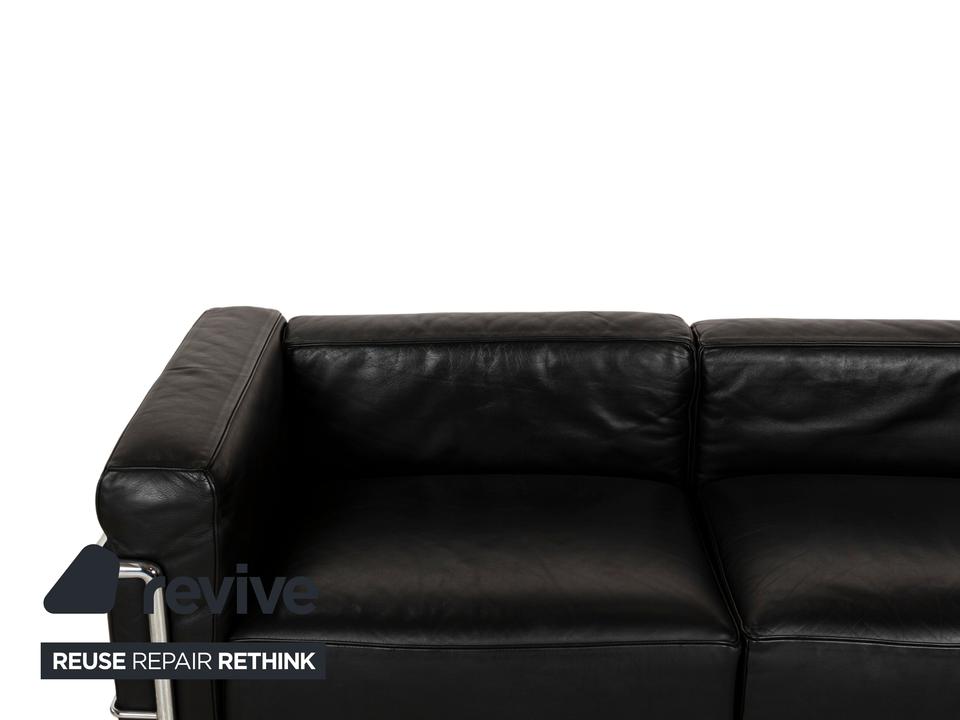 Der Zweisitzer Le Corbusier LC3 von Cassina ist mit einem schwarzen Echtleder bezogen und steht auf silbernen Metallfüßen. Er zeichnet sich durch das kompakte, massive Design und die stilvolle Optik aus.