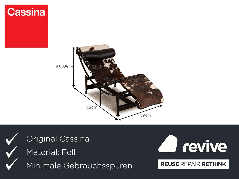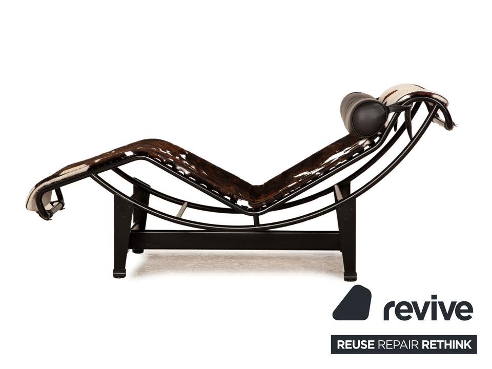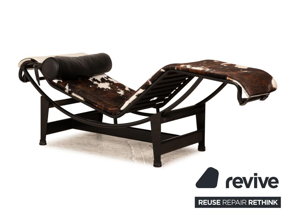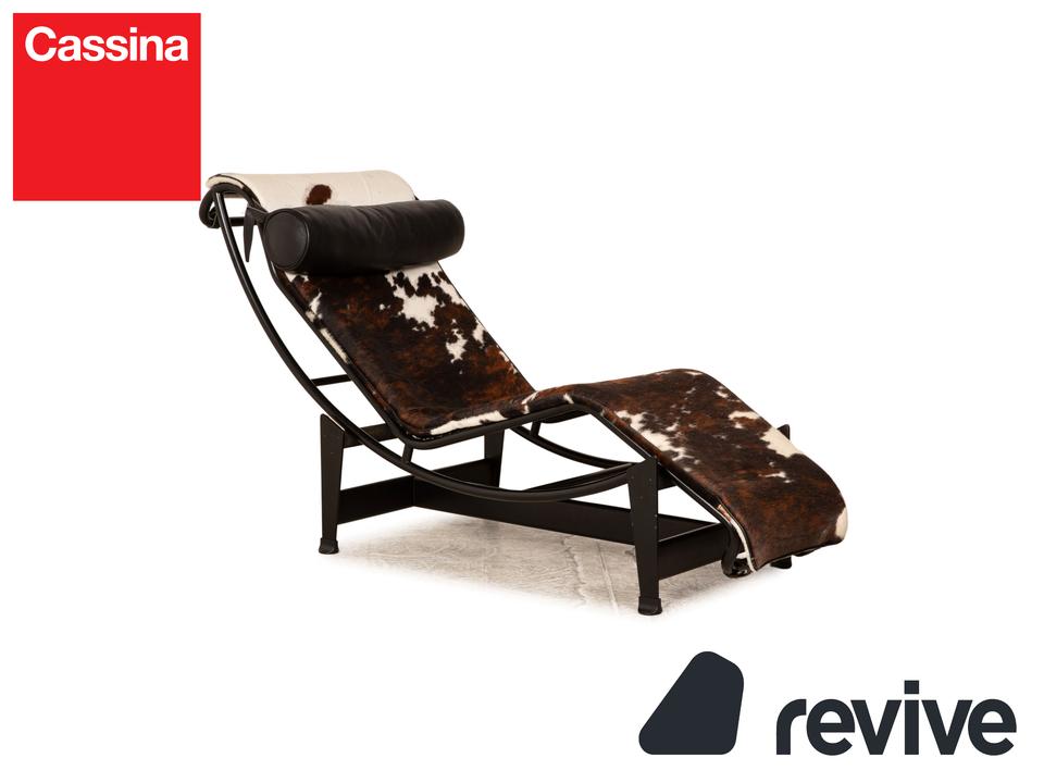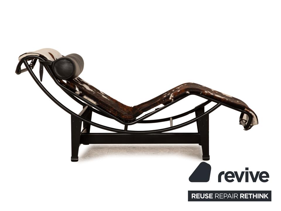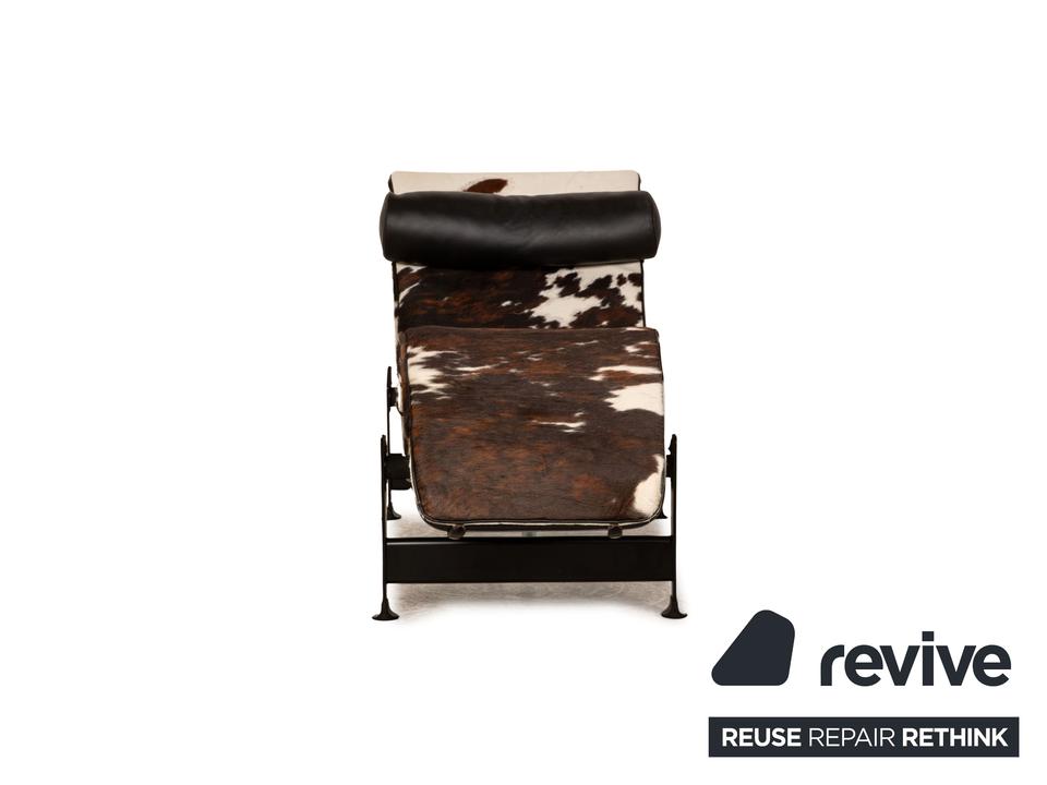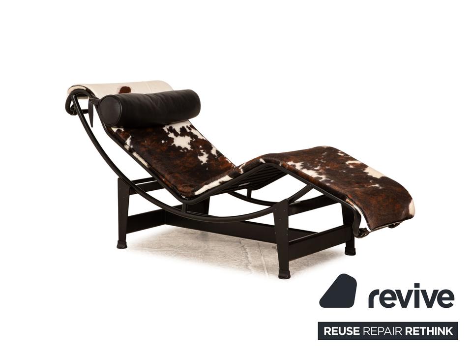 Die Liege Le Corbusier LC 4 von Cassina ist mit einem braun weißen Fell bezogen und steht auf einem schwarzen Metallgestell. Sie zeichnet sich durch das extravagante Design und die stilvolle Optik aus.