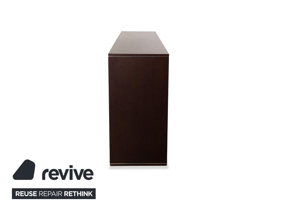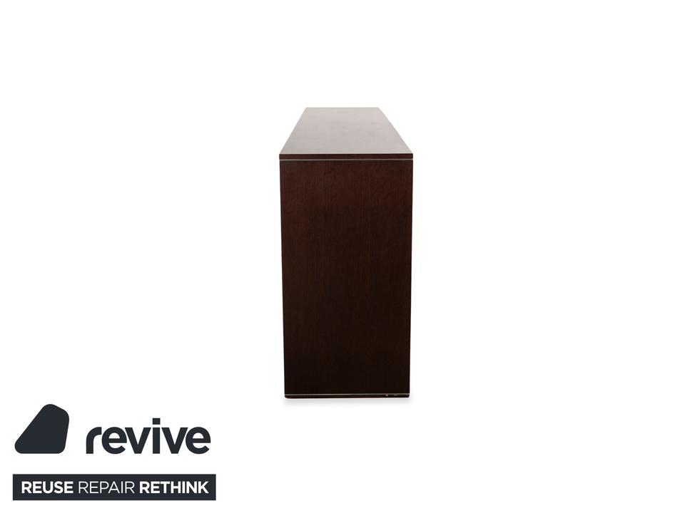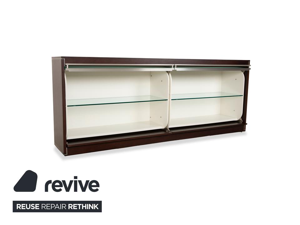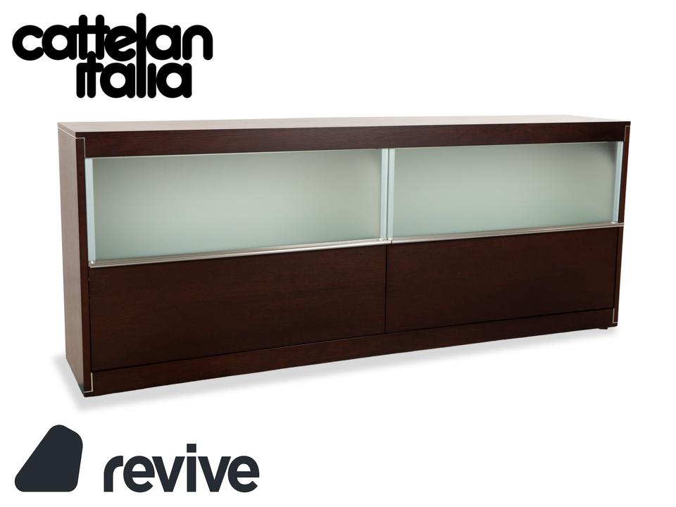 Das Sideboard bietet viel Stauraum und ist aus dunkelbraunem Holz und satiniertem Glas gefertigt.