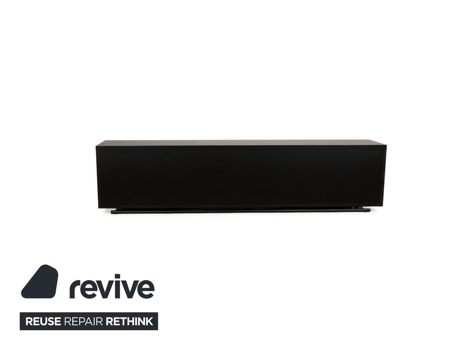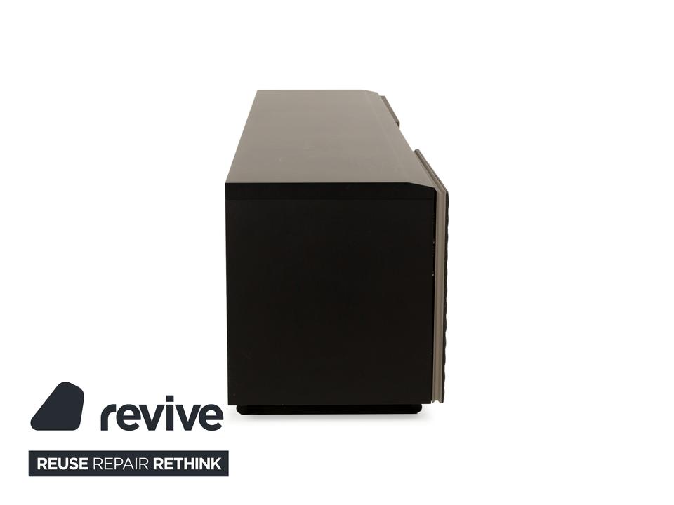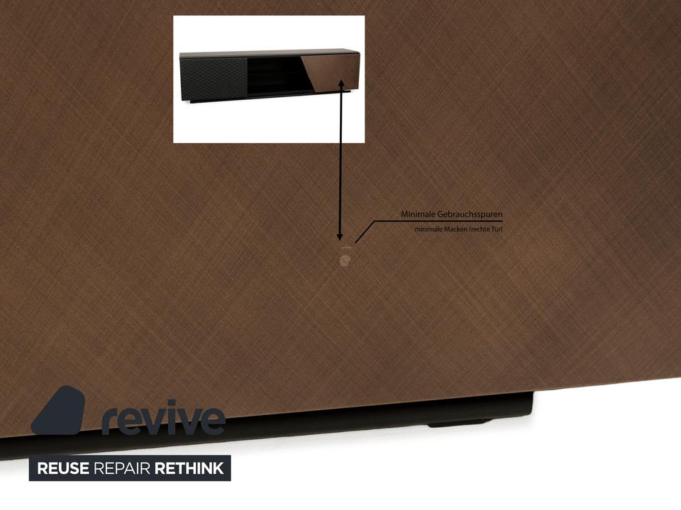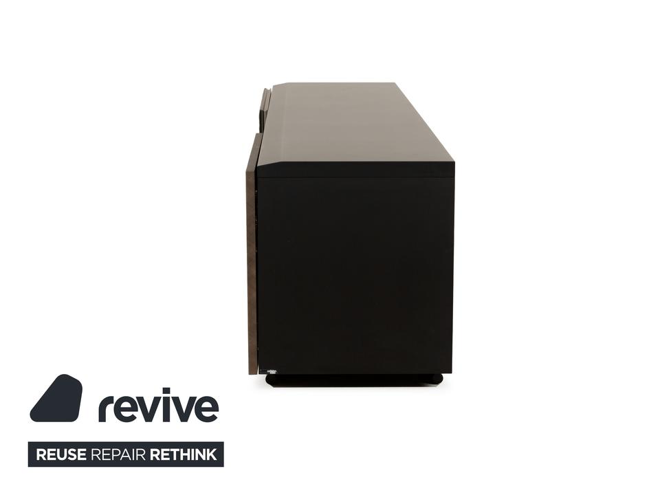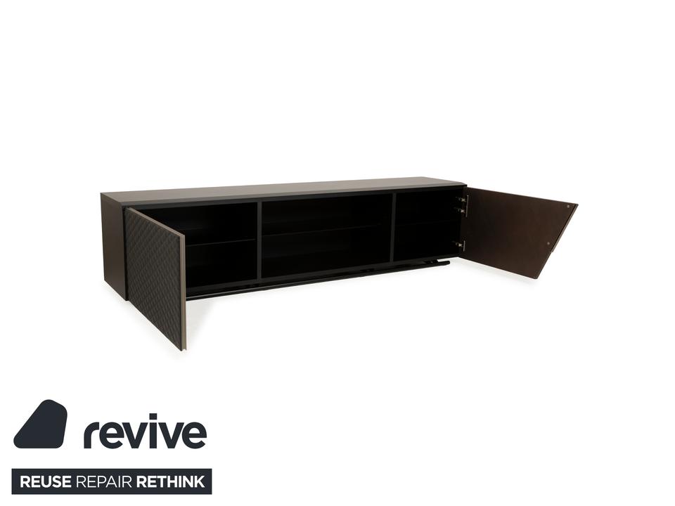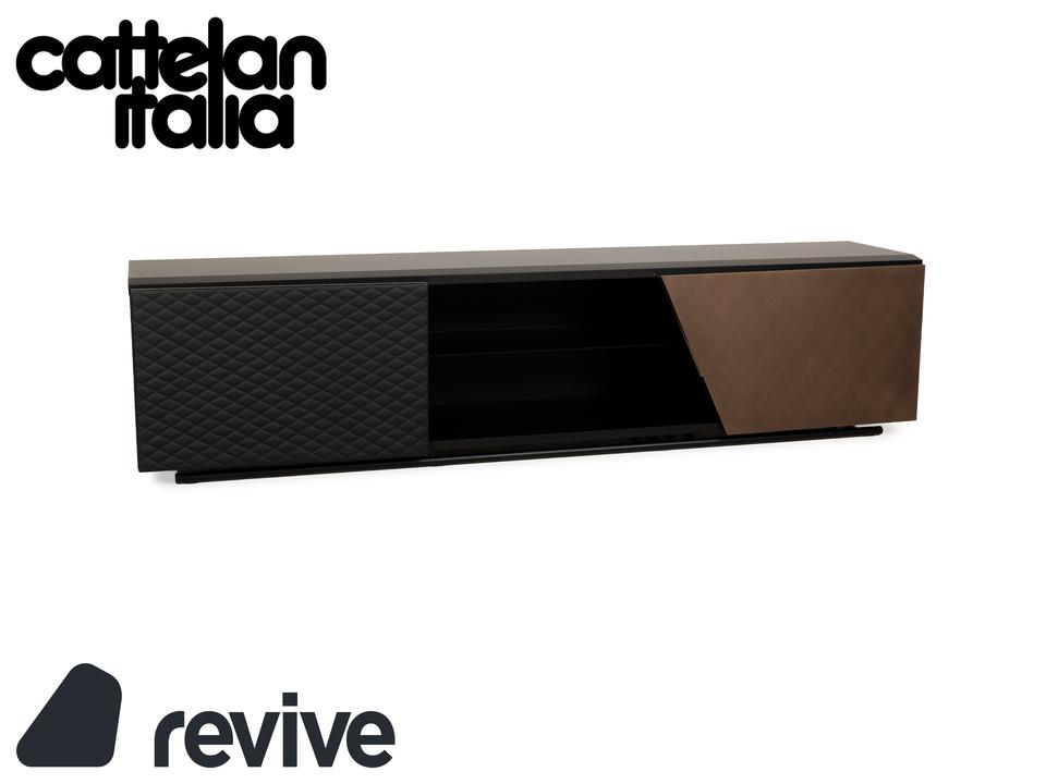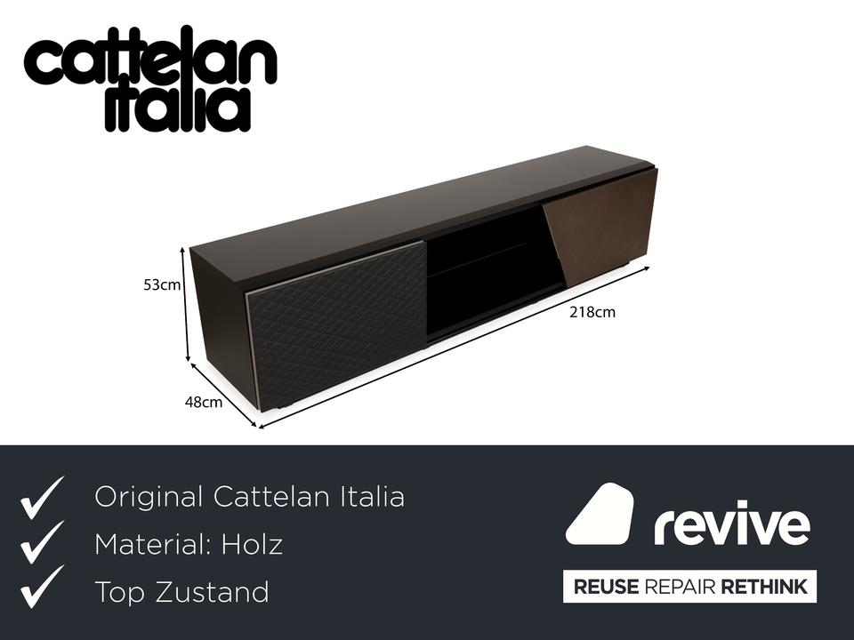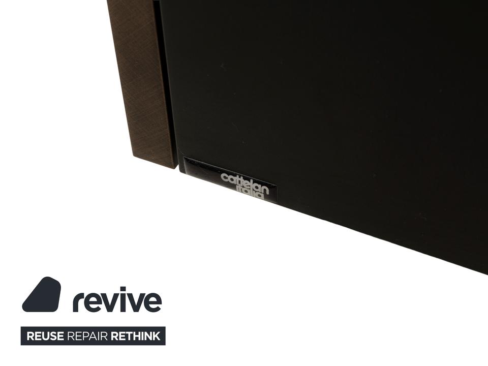 Das Sideboard von Cattelan Italia ist aus braunem und schwarzem Holz gefertigt und steht quasi bodentief auf – eine schmale, durchgehende Schiene dient als Fuß und setzt einen eleganten Akzent. Das Sideboard überzeugt durch sein modernes, reduziertes Design mit grifflosen Türen, stilvoll ineinander übergehenden Flächen und Formen und hochwertigen Materialien. Die beiden Schranktüren, von denen eine mit einem gesteppten Leder bezogen ist, geben den Weg frei zu den drei innenliegenden, durch Trennböden aufgeteilte Schrankfächer.