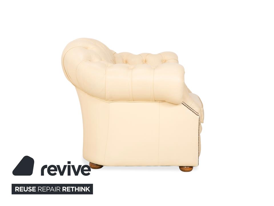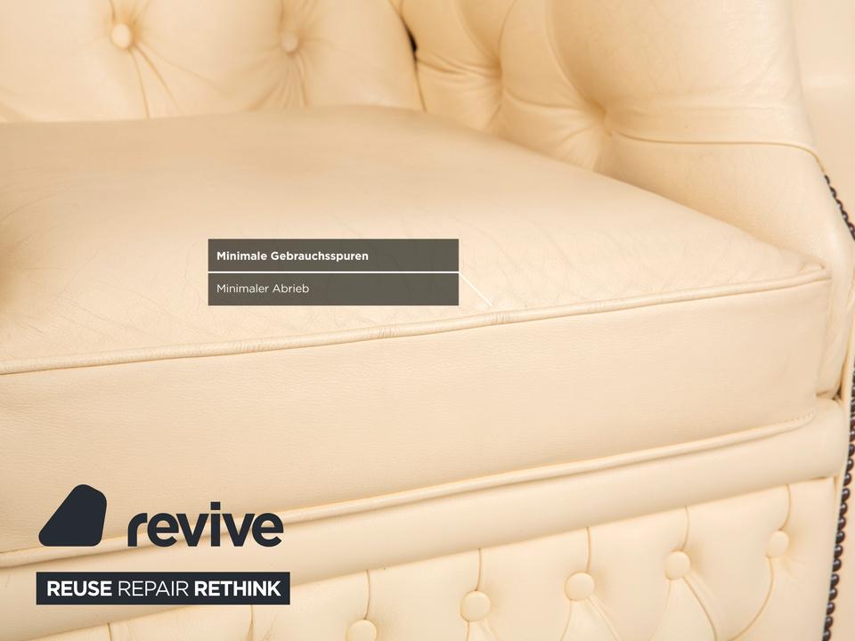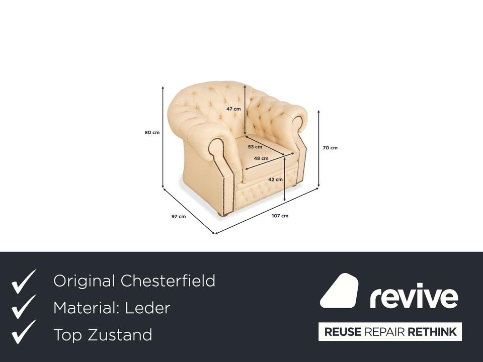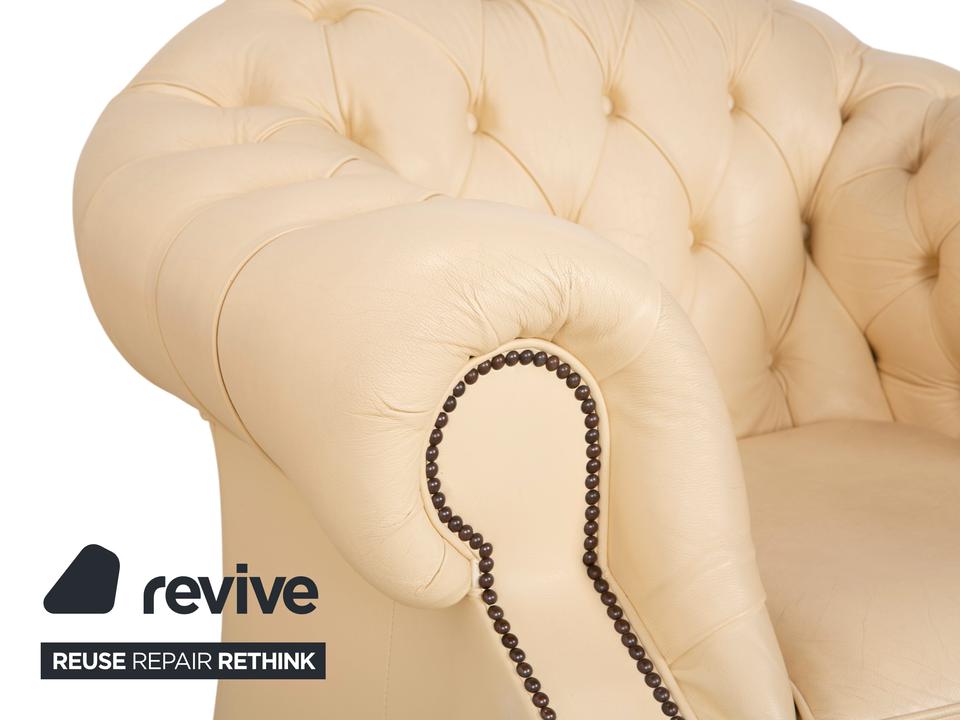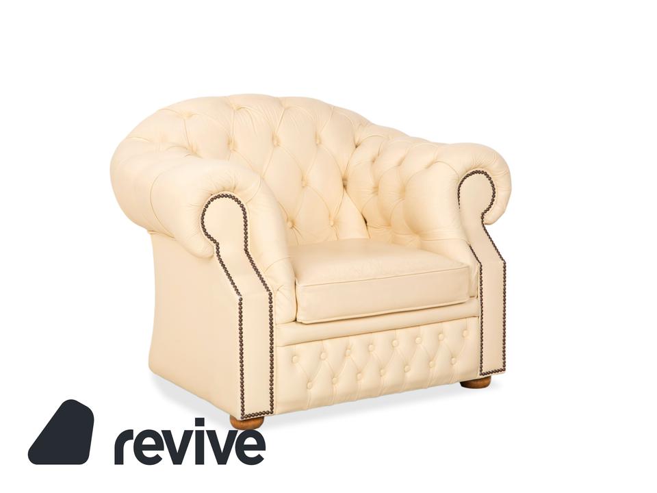 Mit dem Modell „Centurion“ holst du dir den englischen Adel unter den Sesseln in dein Zuhause – allerdings in einer besonders edlen und freundlichen Variante. Während man Chesterfields oft nur in dunklen Tönen kennt, strahlt dieses Exemplar in einem feinen Creme-Ton eine wunderbare Leichtigkeit und Eleganz aus.Das Design ist unverkennbar: Die tiefe, rautenförmige Knopfheftung (Kapitonierung) im Rücken und die kunstvoll gearbeiteten Nietenbeschläge an den Fronten der geschwungenen Armlehnen sind handwerkliche Meisterleistungen. Als Vintage-Stück hat das Leder bereits diesen unverwechselbaren Charakter und eine leichte Patina entwickelt, die den Sessel erst richtig interessant macht – er wirkt nicht „frisch aus der Fabrik“, sondern lebendig und authentisch. Ein imposanter Solitär, der jeden Raum aufwertet, ohne ihn durch dunkle Farben zu erdrücken.