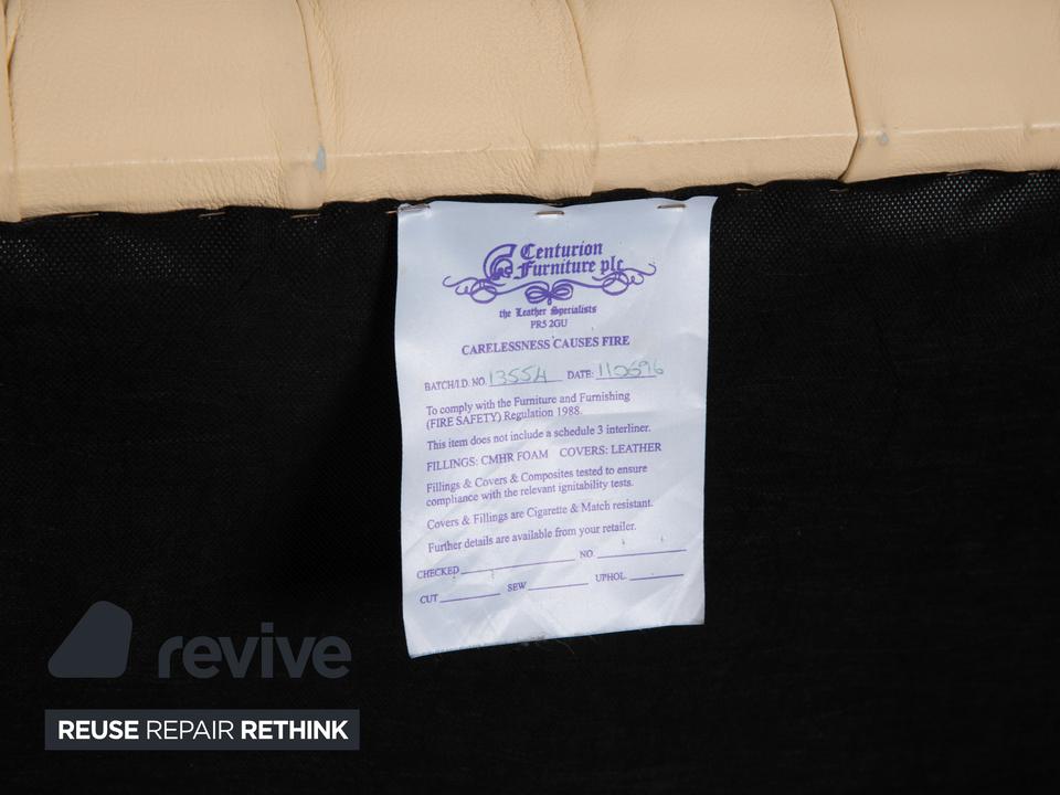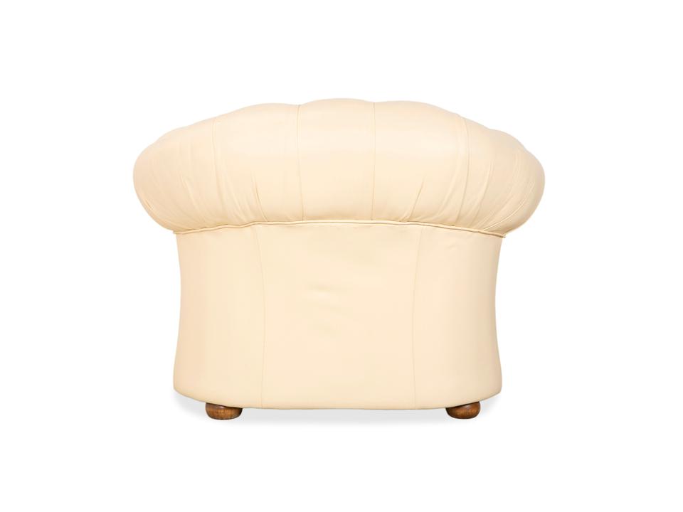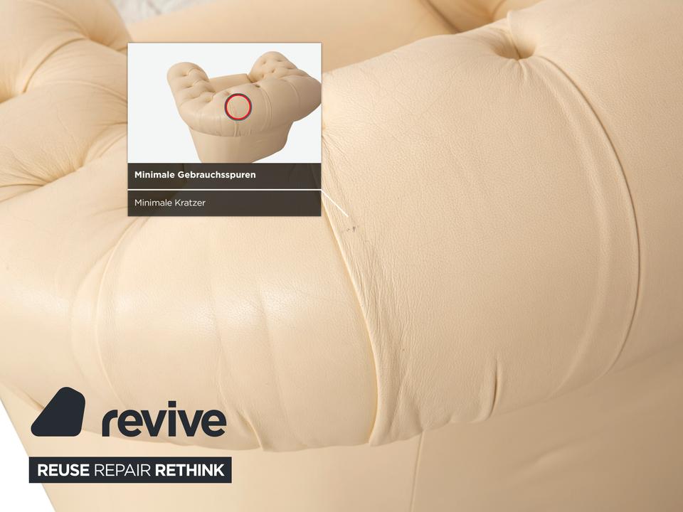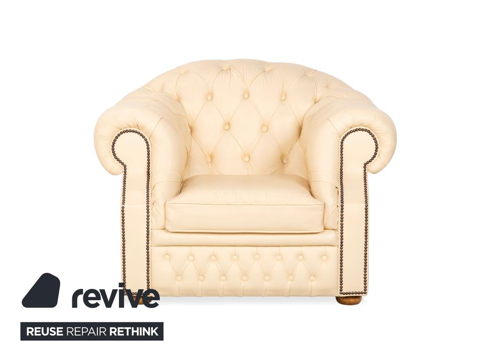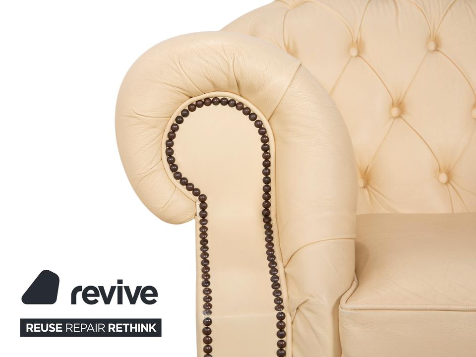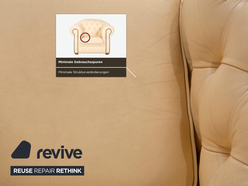 Mit dem Modell „Centurion“ holst du dir den englischen Adel unter den Sesseln in dein Zuhause – allerdings in einer besonders edlen und freundlichen Variante. Während man Chesterfields oft nur in dunklen Tönen kennt, strahlt dieses Exemplar in einem feinen Creme-Ton eine wunderbare Leichtigkeit und Eleganz aus.Das Design ist unverkennbar: Die tiefe, rautenförmige Knopfheftung (Kapitonierung) im Rücken und die kunstvoll gearbeiteten Nietenbeschläge an den Fronten der geschwungenen Armlehnen sind handwerkliche Meisterleistungen. Als Vintage-Stück hat das Leder bereits diesen unverwechselbaren Charakter und eine leichte Patina entwickelt, die den Sessel erst richtig interessant macht – er wirkt nicht „frisch aus der Fabrik“, sondern lebendig und authentisch. Ein imposanter Solitär, der jeden Raum aufwertet, ohne ihn durch dunkle Farben zu erdrücken.