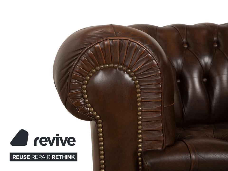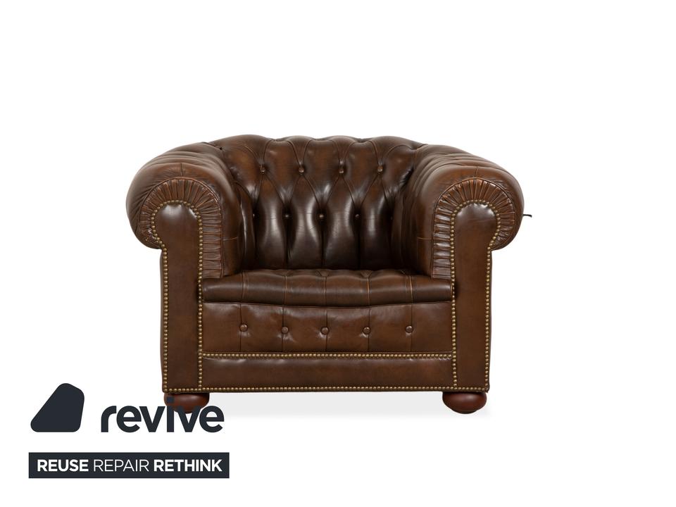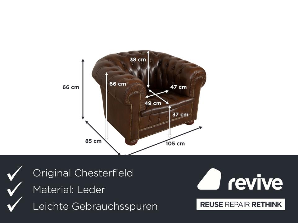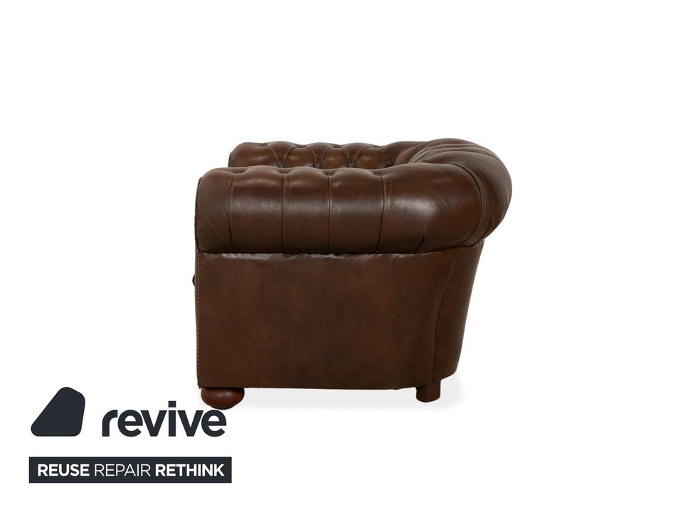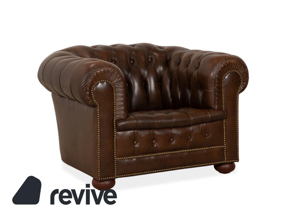 Dieser Chesterfield Ledersessel in klassischem Braun verkörpert echten Vintage-Charme und zeitlose Eleganz. Das typisch tief geknöpfte Rücken- und Armlehnendesign, kombiniert mit der aufwendig gearbeiteten Nietenverzierung, verleiht dem Sessel seine charakteristische Chesterfield-Optik. Der hochwertige Lederbezug zeigt eine schöne, warme Patina und unterstreicht den authentischen Vintage-Look. Die großzügige Polsterung sorgt für hohen Sitzkomfort, während die runden Holzfüße das traditionelle Design harmonisch abrunden. Ein stilvolles Statement-Piece, das jedem Raum eine edle, klassische Atmosphäre verleiht.