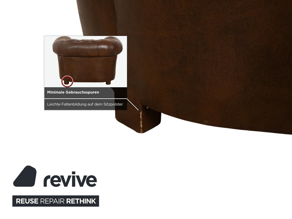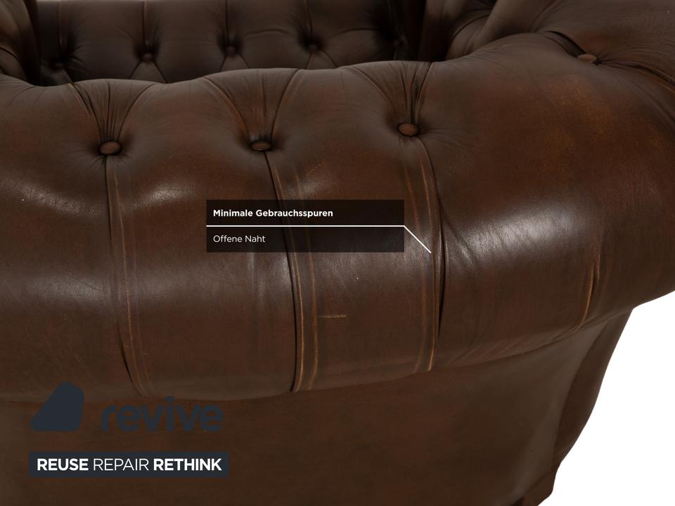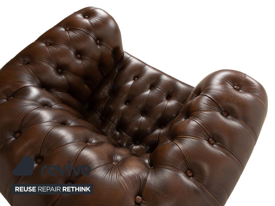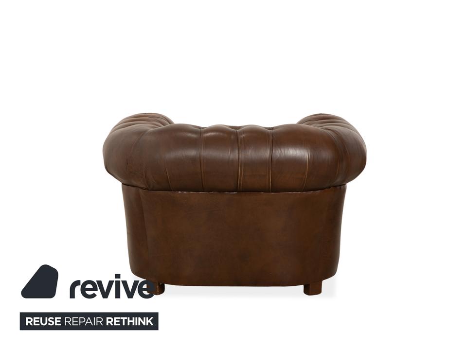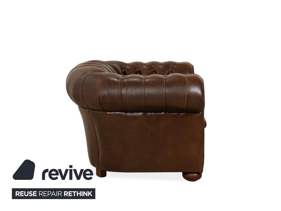 Dieser Chesterfield Ledersessel in klassischem Braun verkörpert echten Vintage-Charme und zeitlose Eleganz. Das typisch tief geknöpfte Rücken- und Armlehnendesign, kombiniert mit der aufwendig gearbeiteten Nietenverzierung, verleiht dem Sessel seine charakteristische Chesterfield-Optik. Der hochwertige Lederbezug zeigt eine schöne, warme Patina und unterstreicht den authentischen Vintage-Look. Die großzügige Polsterung sorgt für hohen Sitzkomfort, während die runden Holzfüße das traditionelle Design harmonisch abrunden. Ein stilvolles Statement-Piece, das jedem Raum eine edle, klassische Atmosphäre verleiht.