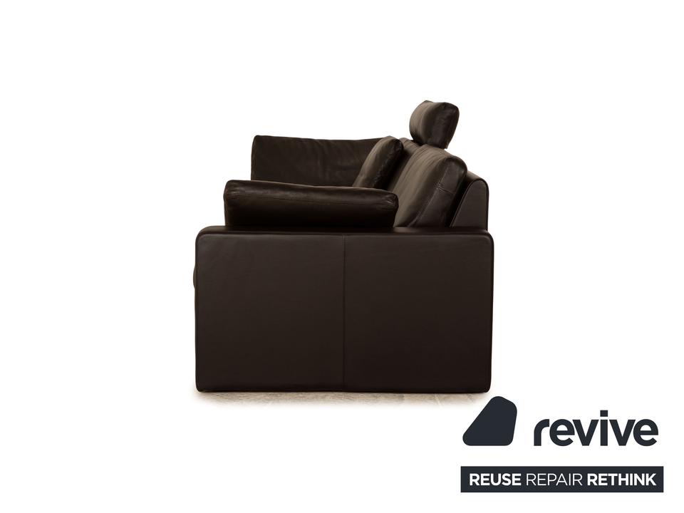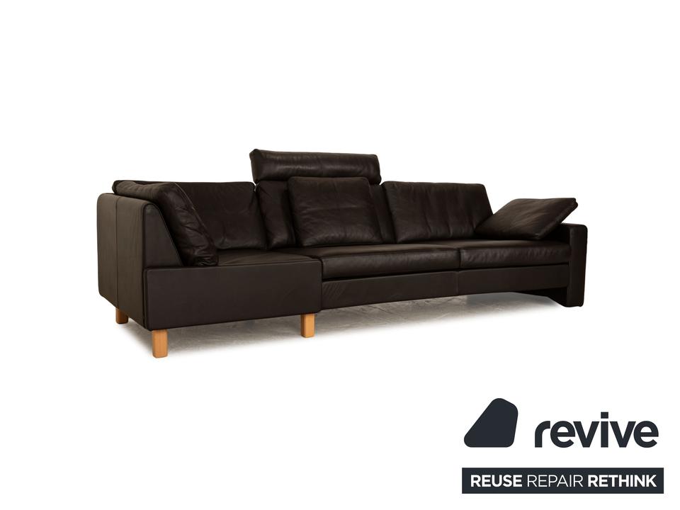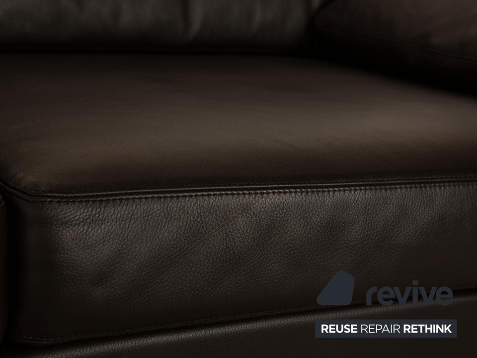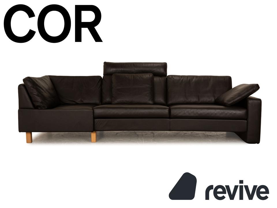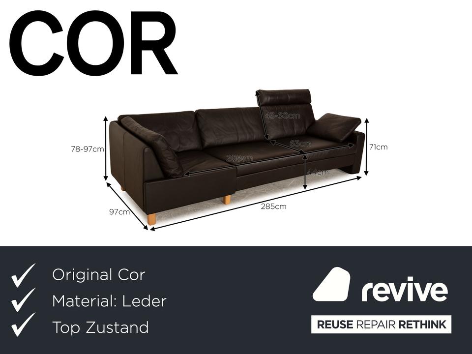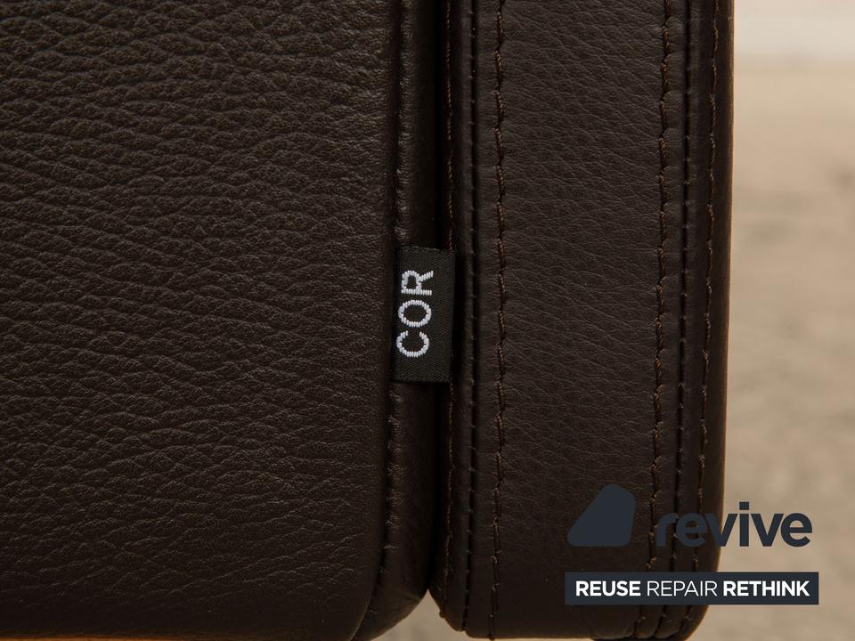 Der Viersitzer Conseta von Cor ist mit einem dunkelbraunen Echtleder bezogen und steht auf braunen Holzfüßen. Er zeichnet sich durch das kantige, gradlinige Design und die schlichte, zeitlose Optik aus.
