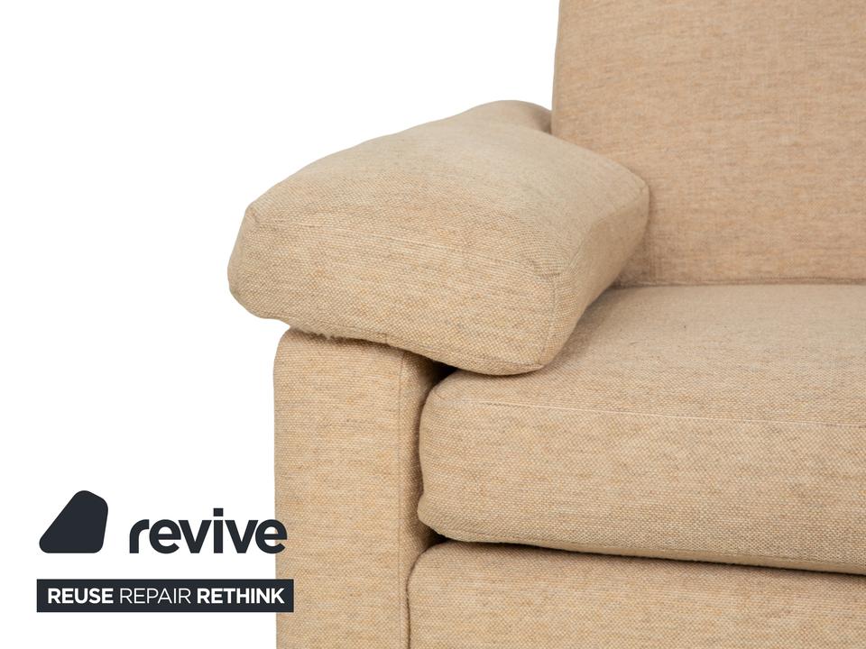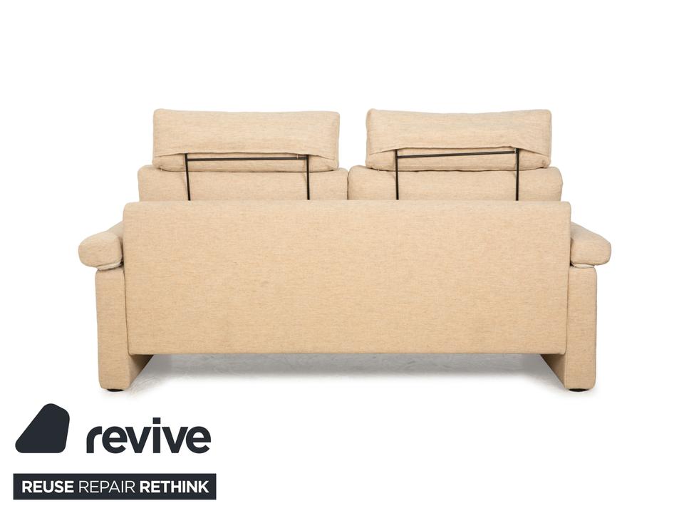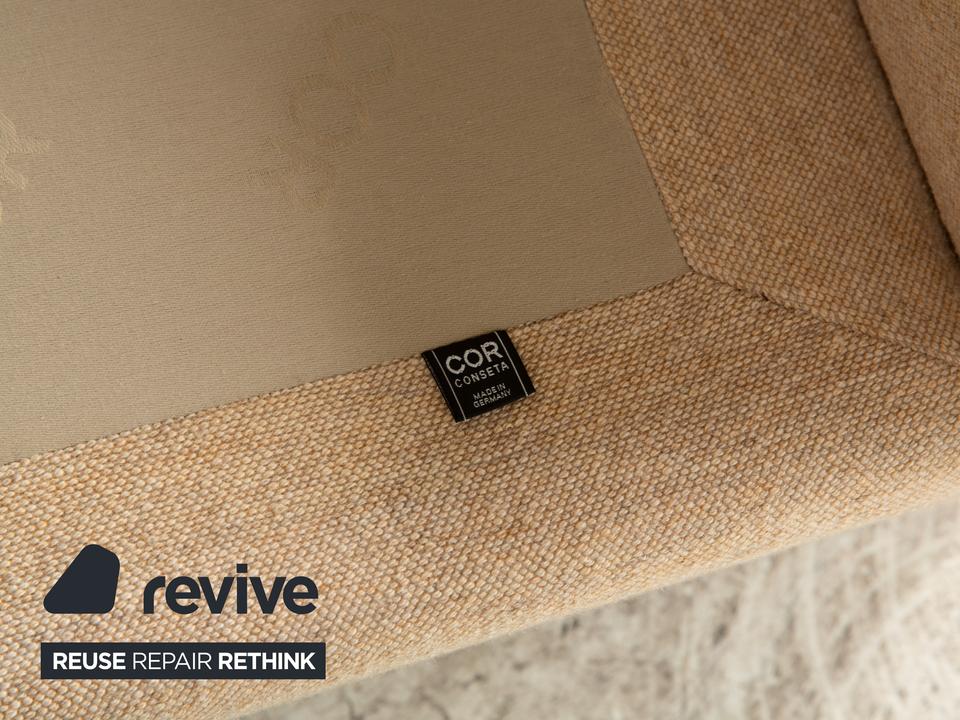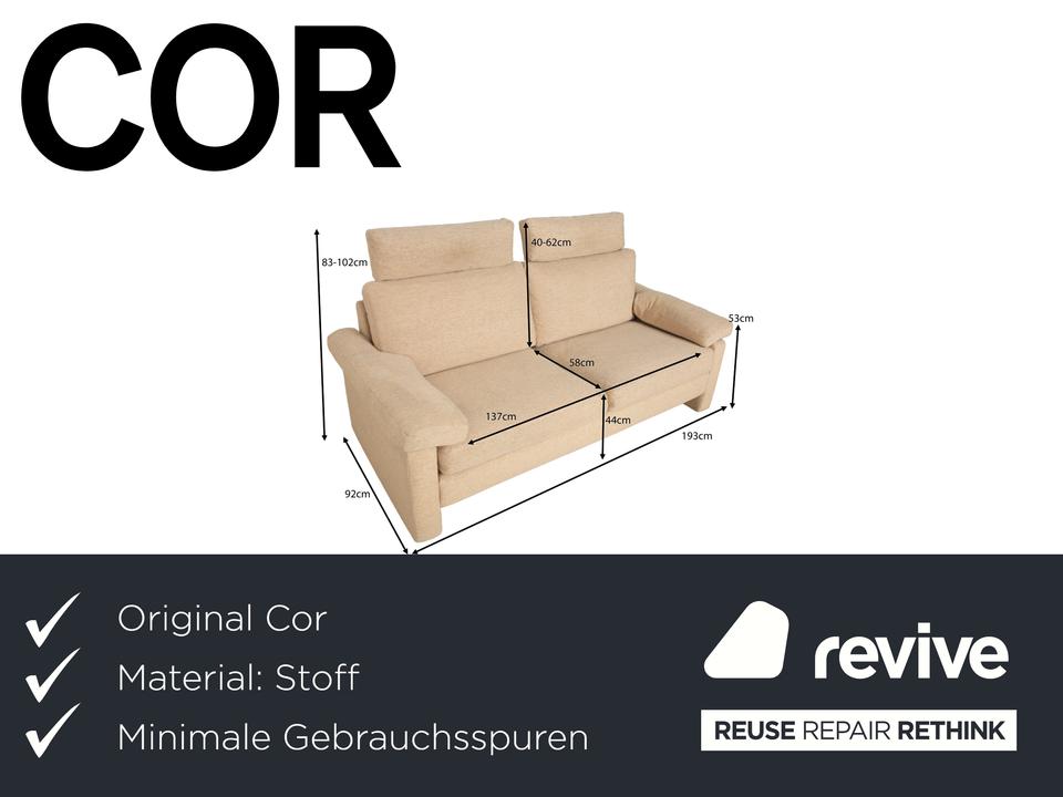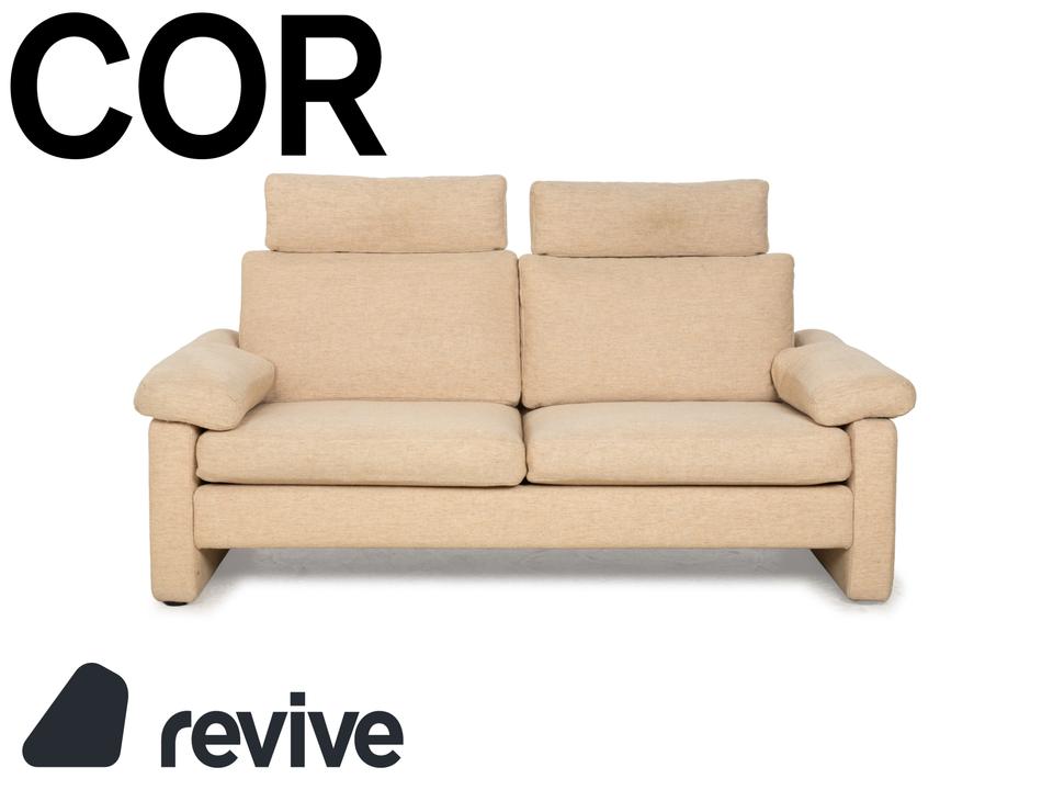 Das Sofa Conseta von Cor ist ist mit einem beigefarbenen Stoff bezogen und steht auf bodentiefen Seitenteilen. Der Zweisitzer zeichnet sich durch sein klassisches und unaufdringliches Design aus, das ihn zusammen mit der neutralen Farbe zu einem einfach kombinierbaren Möbelstück macht. Breite Armlehnen, großzügige Polsterung und versetzbare Kopfstützen versprechen hohen Komfort.