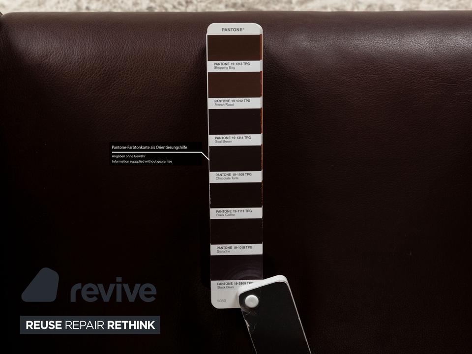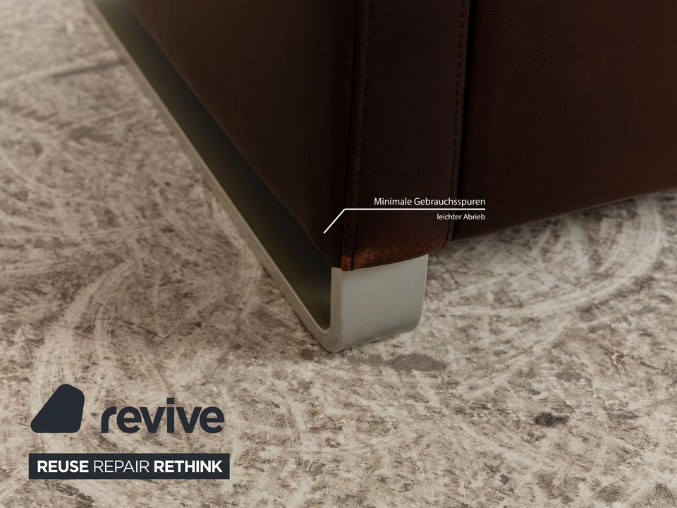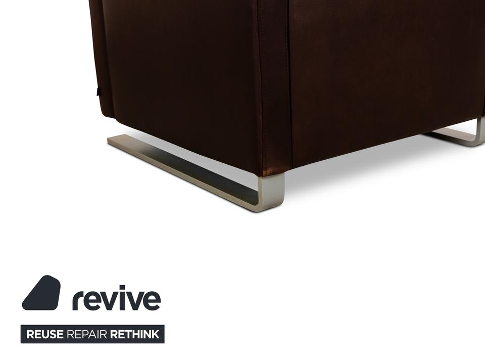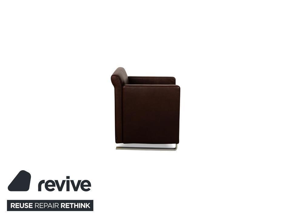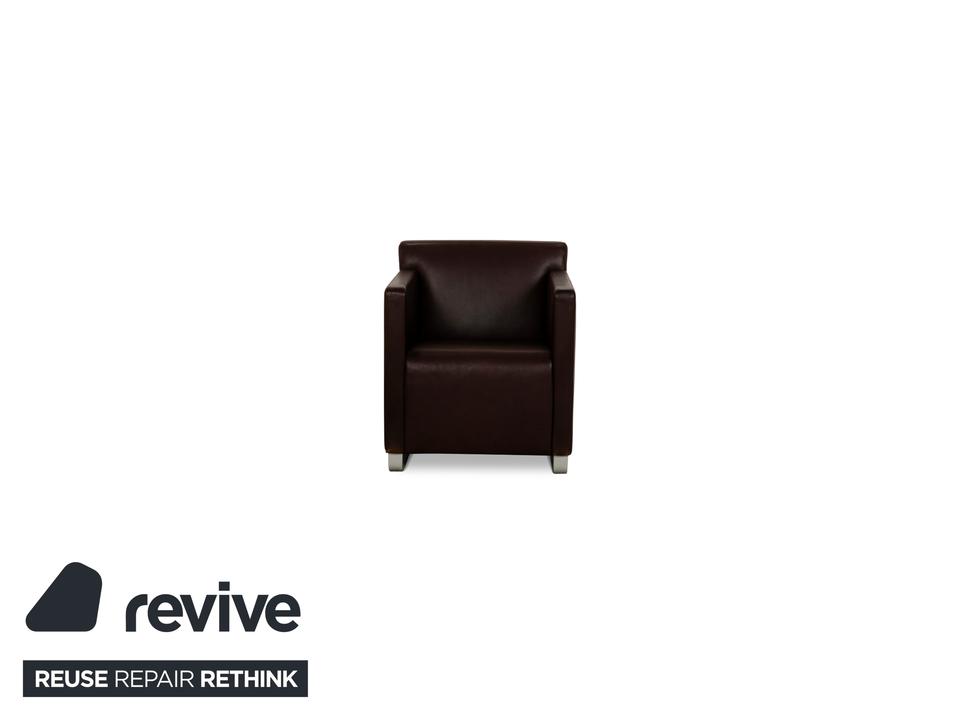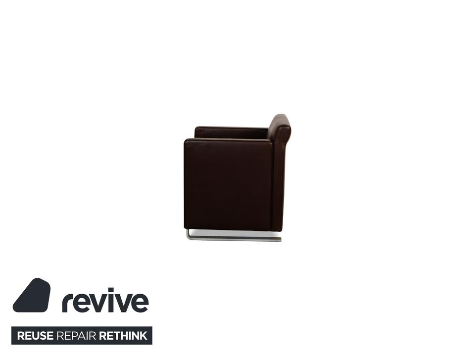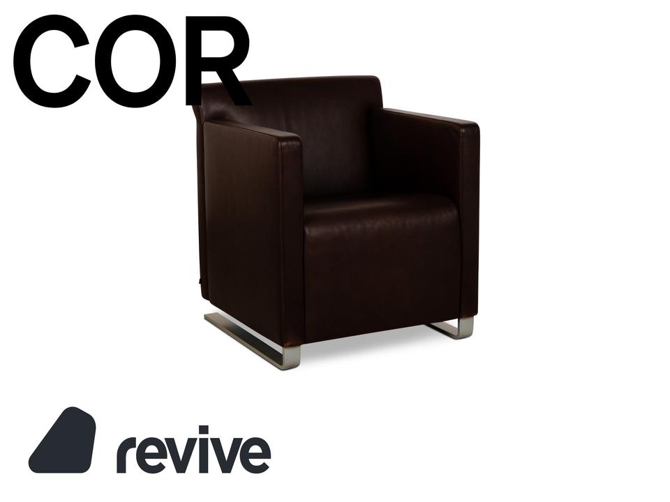 Der Sessel Quant aus dem Hause Cor ist mit einem rotbraunen Echtleder bezogen und steht auf kufenförmigen Fußgestellen. Das kubische, kantige Design zeichnet den Sessel aus.