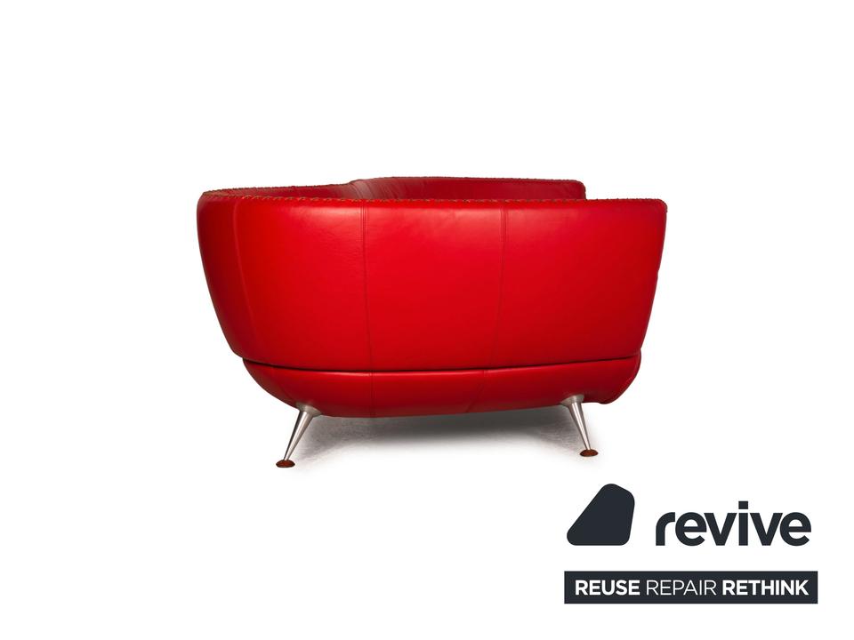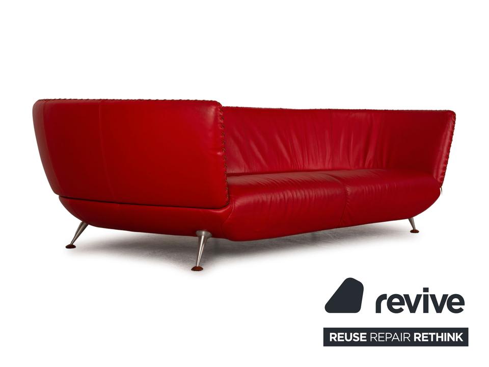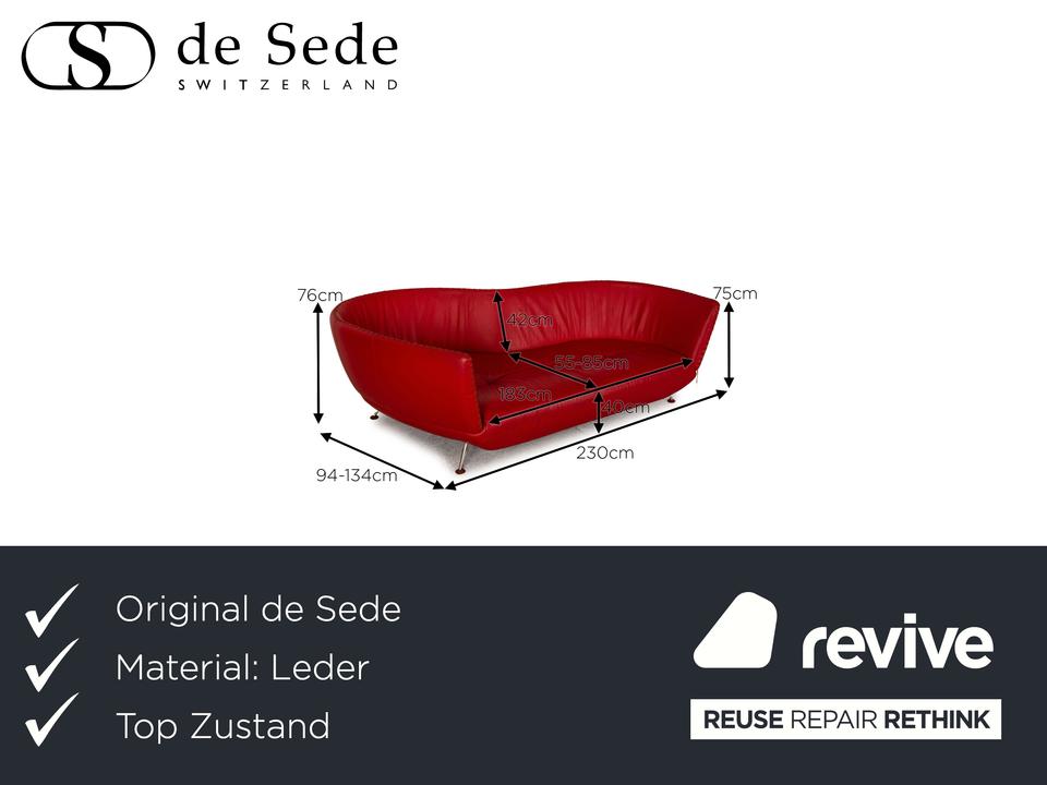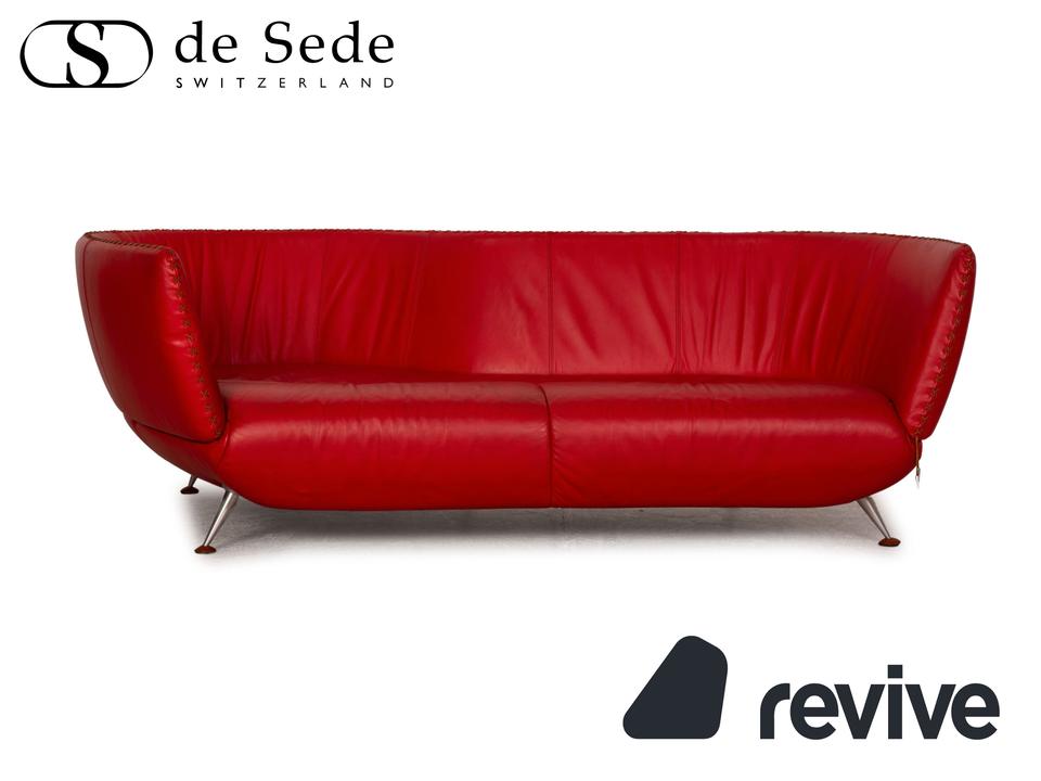 Der Dreisitzer DS 102 von de Sede ist mit einem roten Echtleder bezogen und steht auf silbernen Metallfüßen. Er zeichnet sich durch die organische Form und das extravagante Design aus.
