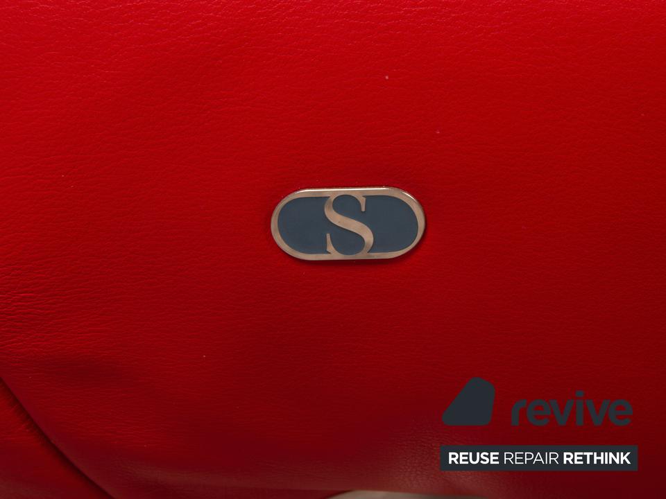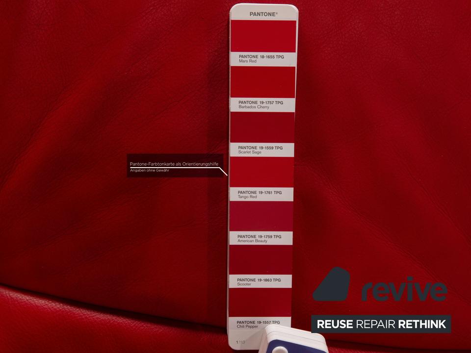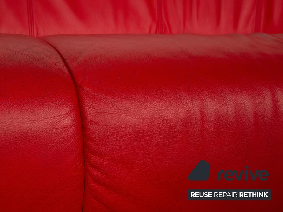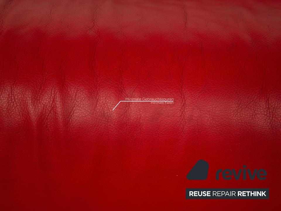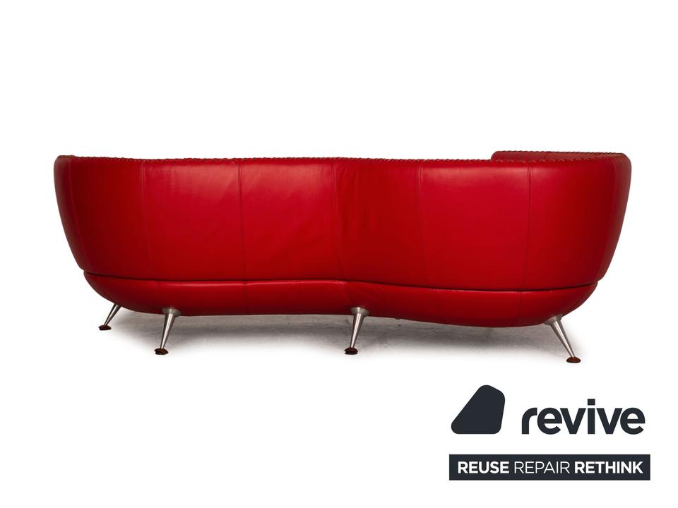 Der Dreisitzer DS 102 von de Sede ist mit einem roten Echtleder bezogen und steht auf silbernen Metallfüßen. Er zeichnet sich durch die organische Form und das extravagante Design aus.