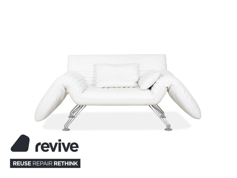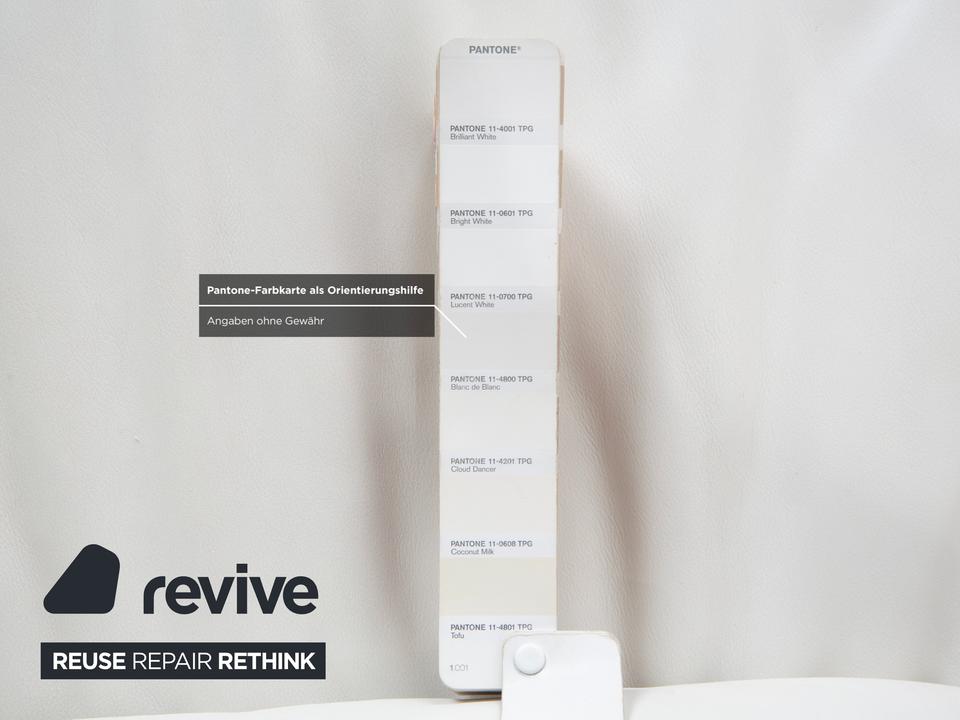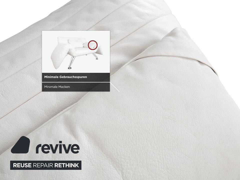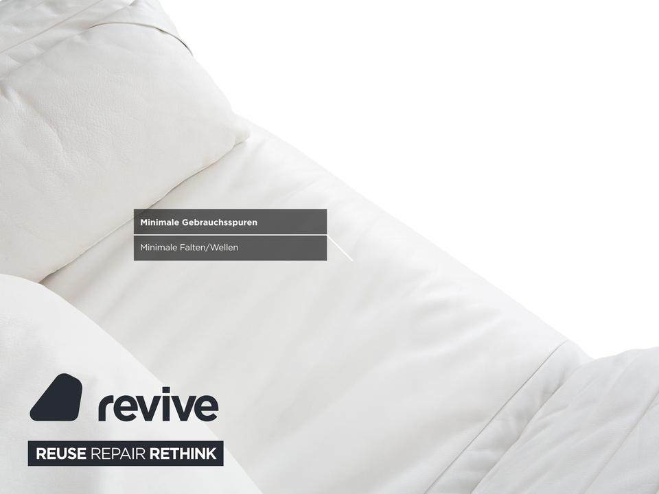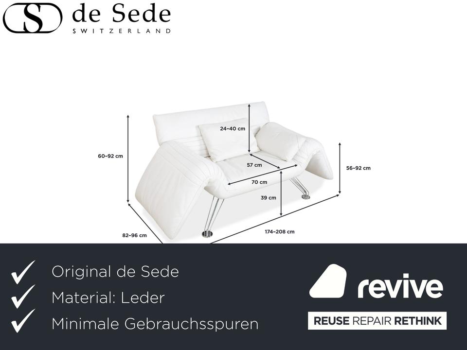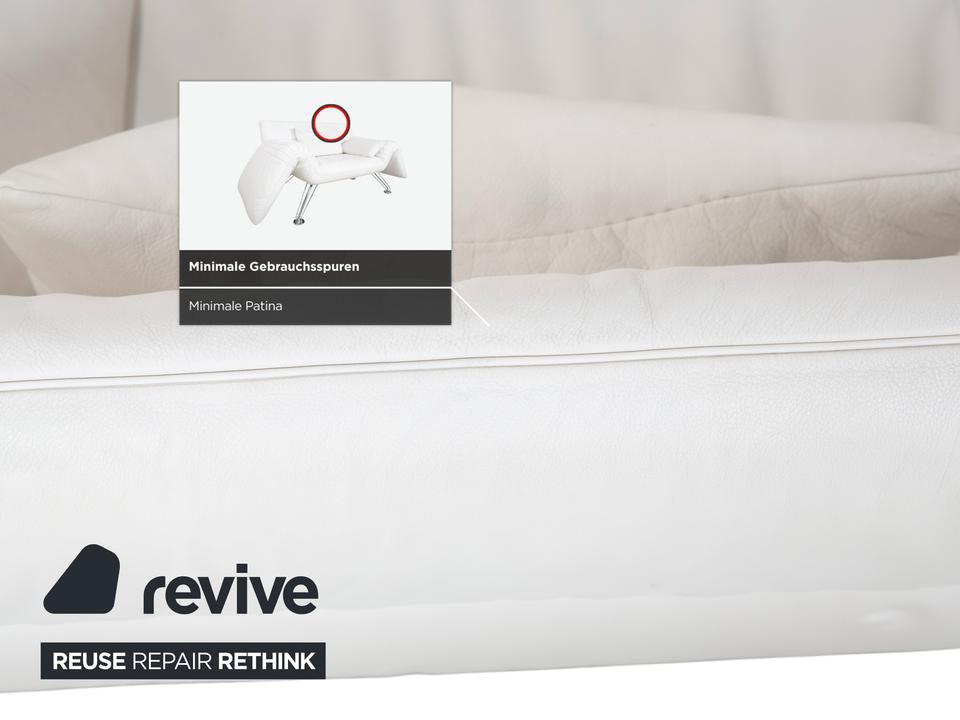 Mit dem Modell DS-142 holst du dir ein Stück Schweizer Ingenieurskunst der Spitzenklasse von de Sede ins Haus. Dieses Möbelstück entzieht sich gängigen Kategorien: Es ist Sessel, Chaiselongue und kompaktes Sofa in einem – ein wahres Verwandlungskünstler.Der Bezug aus hochwertigem Leder ist in einem strahlenden Weiß gehalten, was die futuristische, organische Formgebung perfekt zur Geltung bringt. Das absolute Highlight ist die namensgebende „Wing“-Funktion: Rücken und Armlehnen sind nicht starr, sondern lassen sich unabhängig voneinander verstellen. Auf dem Bild sind die seitlichen Flügel weit nach unten geklappt, wodurch eine offene, breite Liegefläche entsteht. Man kann sie jedoch stufenweise nach oben ratschen, um eine gemütliche Kuhle zum Sitzen oder Anlehnen zu formen.Getragen wird diese komplexe Mechanik von einem filigranen Gestell aus verchromtem Stahl, das technisch und leicht wirkt. Die sichtbaren Ziernähte auf den Flügeln zeugen von der handwerklichen Meisterschaft der Manufaktur. Zusätzliche lose Kissen sorgen für individuellen Komfort im Rückenbereich.