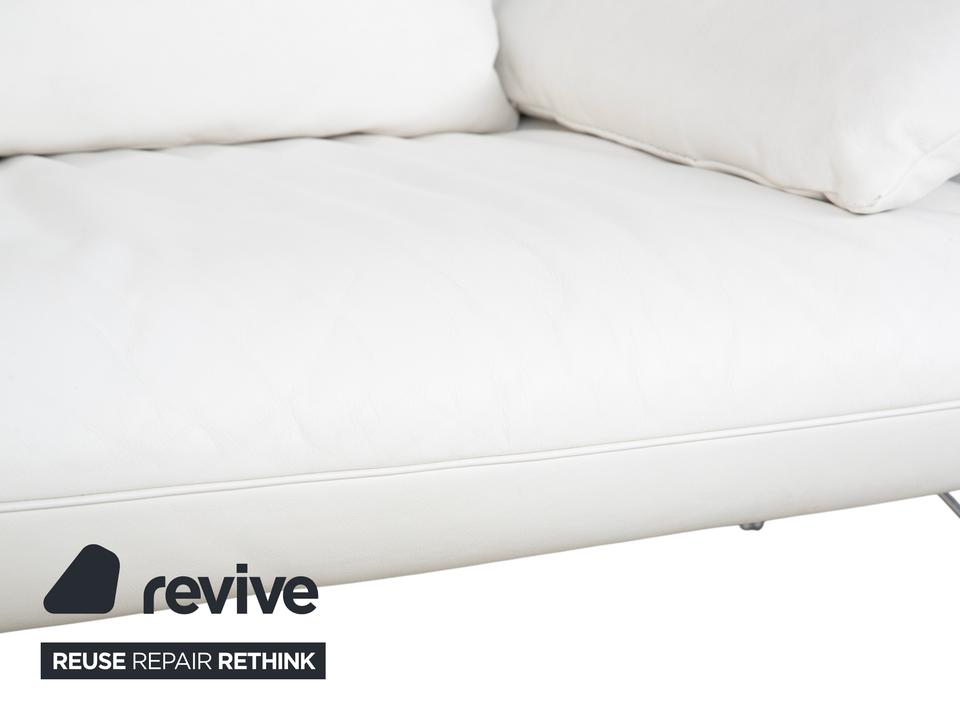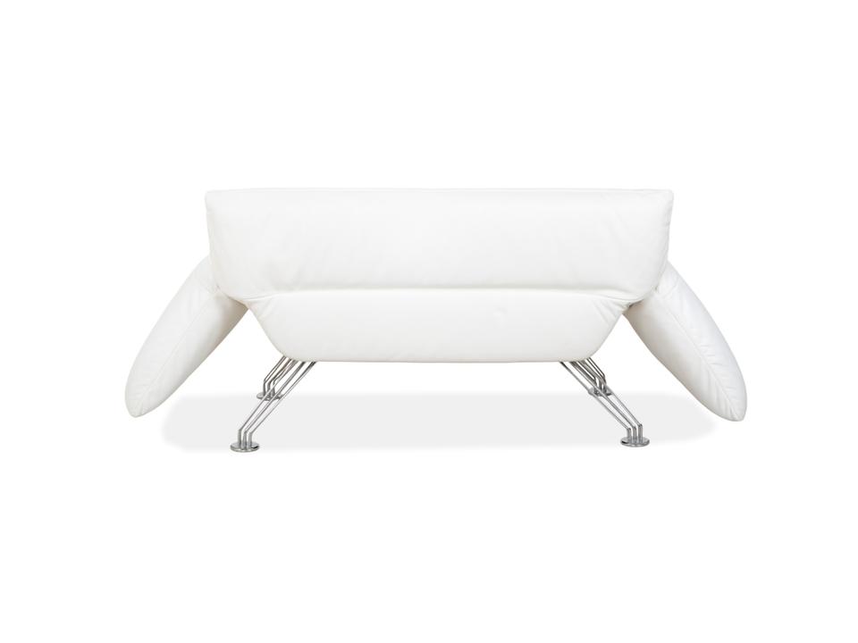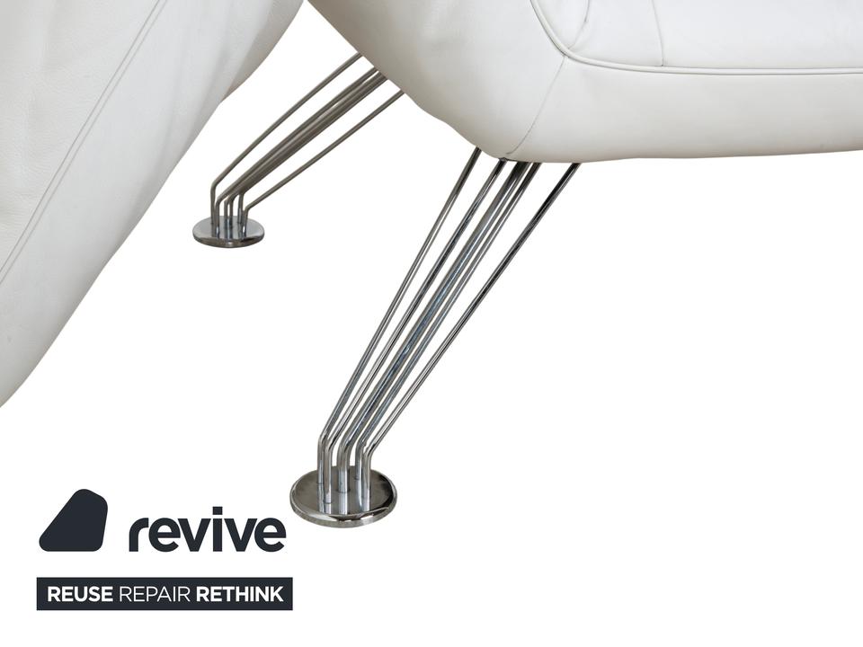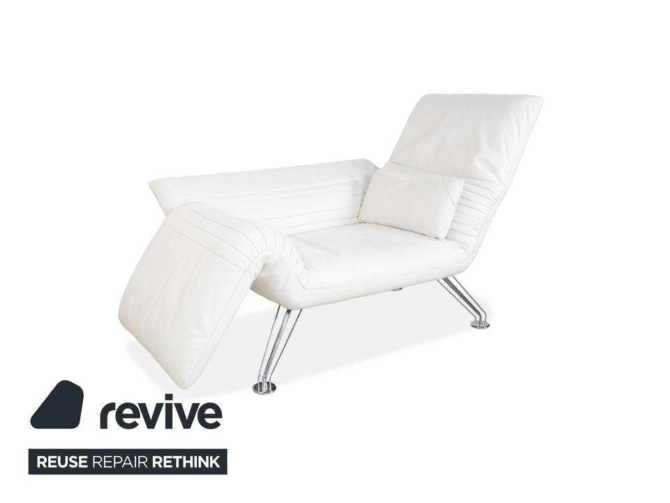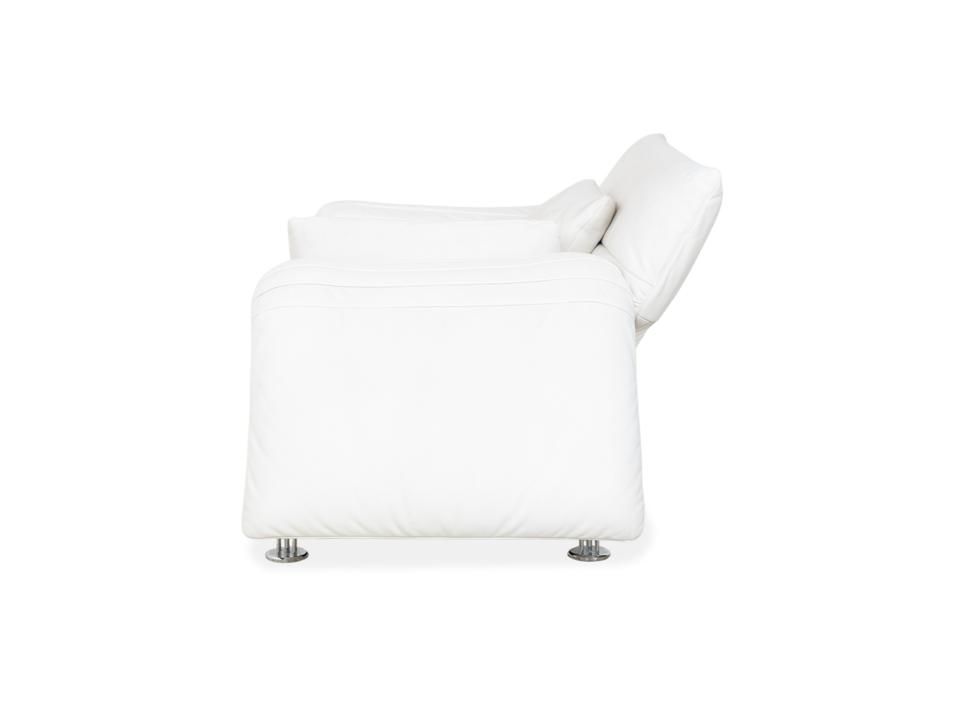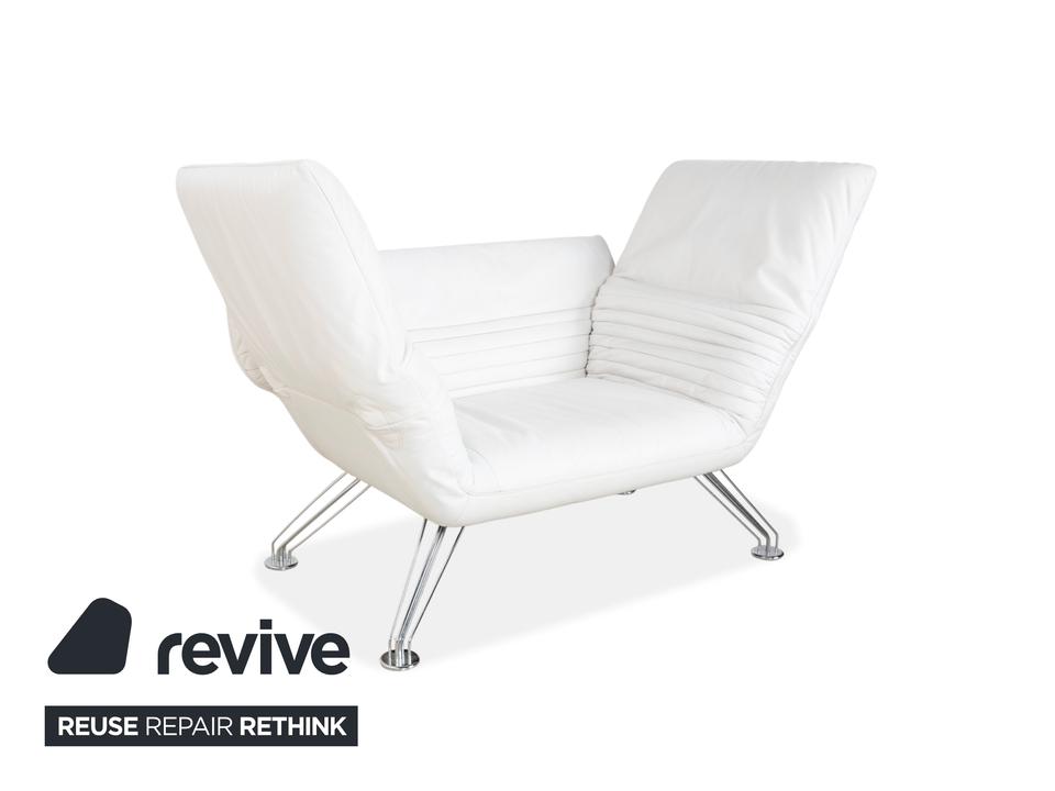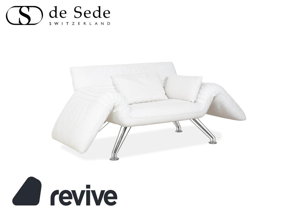Mit dem Modell DS-142 holst du dir ein Stück Schweizer Ingenieurskunst der Spitzenklasse von de Sede ins Haus. Dieses Möbelstück entzieht sich gängigen Kategorien: Es ist Sessel, Chaiselongue und kompaktes Sofa in einem – ein wahres Verwandlungskünstler.Der Bezug aus hochwertigem Leder ist in einem strahlenden Weiß gehalten, was die futuristische, organische Formgebung perfekt zur Geltung bringt. Das absolute Highlight ist die namensgebende „Wing“-Funktion: Rücken und Armlehnen sind nicht starr, sondern lassen sich unabhängig voneinander verstellen. Auf dem Bild sind die seitlichen Flügel weit nach unten geklappt, wodurch eine offene, breite Liegefläche entsteht. Man kann sie jedoch stufenweise nach oben ratschen, um eine gemütliche Kuhle zum Sitzen oder Anlehnen zu formen.Getragen wird diese komplexe Mechanik von einem filigranen Gestell aus verchromtem Stahl, das technisch und leicht wirkt. Die sichtbaren Ziernähte auf den Flügeln zeugen von der handwerklichen Meisterschaft der Manufaktur. Zusätzliche lose Kissen sorgen für individuellen Komfort im Rückenbereich.