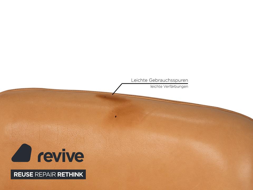 Der Zweisitzer DS 50 von de Sede ist mit einem beigen Echtleder bezogen und steht auf schwarzen Füßen. Er zeichnet sich durch das klassische Design und die Retro Optik aus.