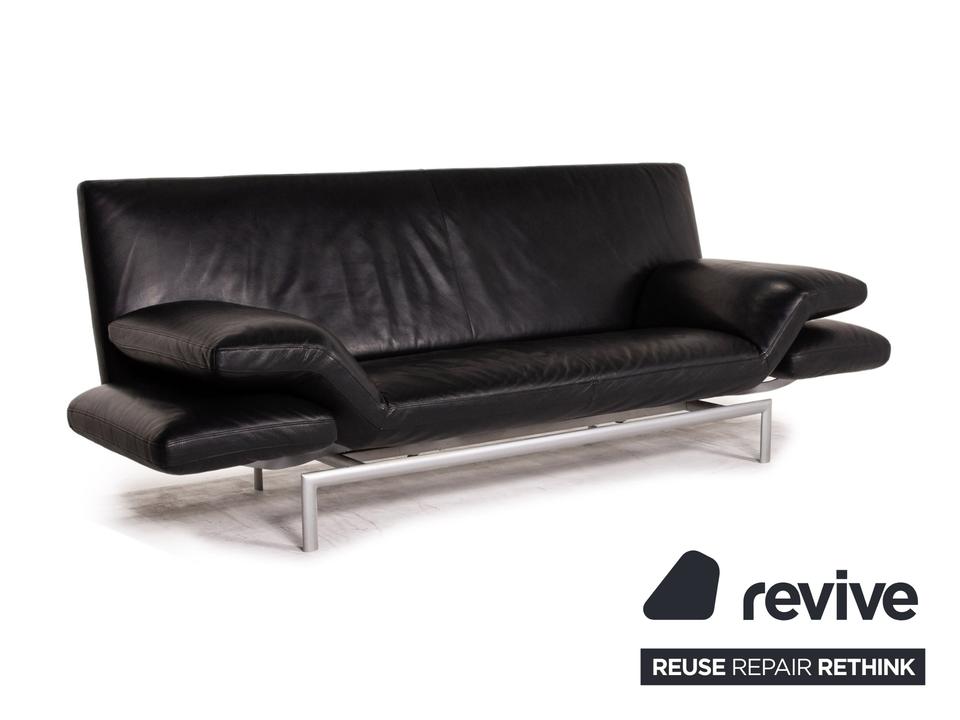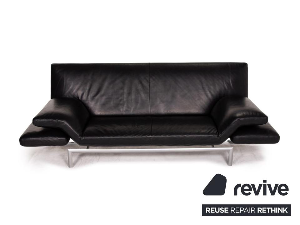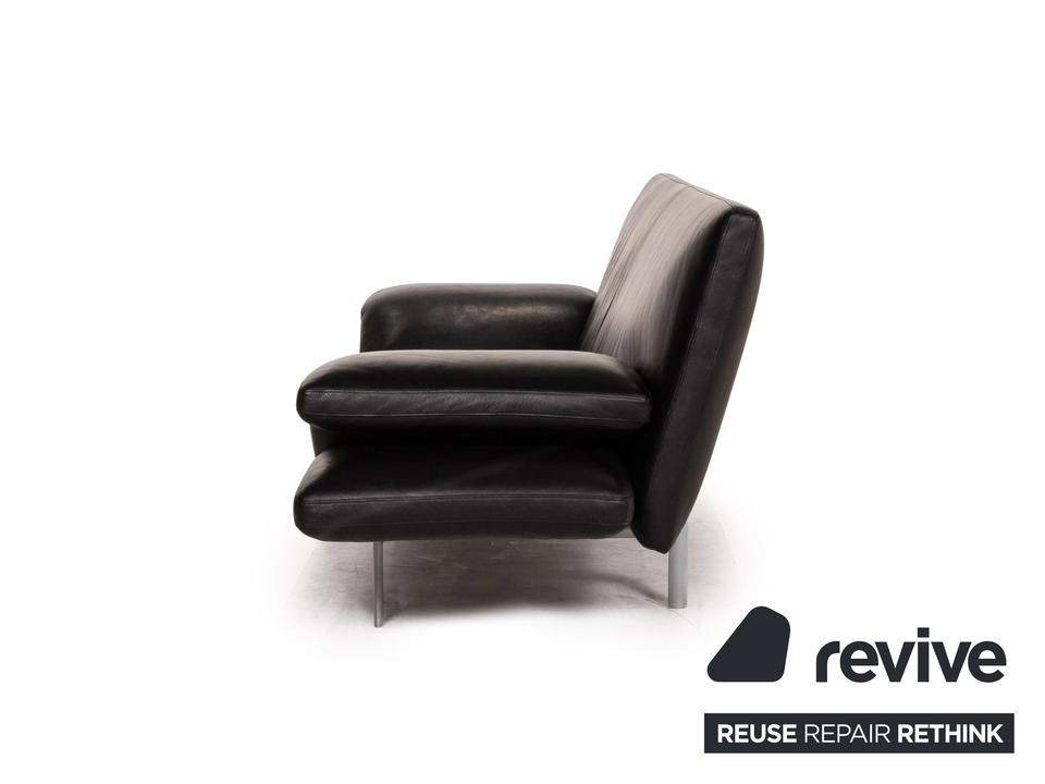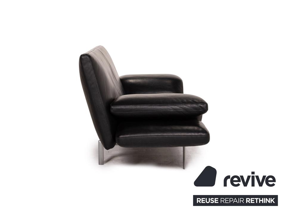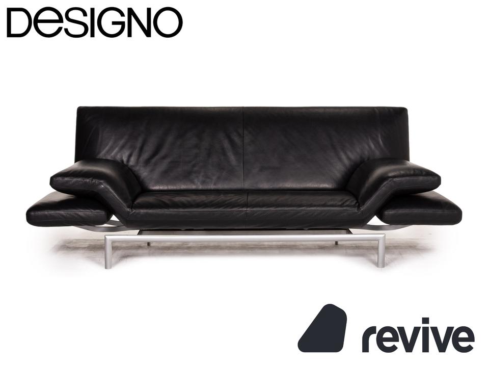 Das Sofa Flyer von Designo ist mit einem schwarzen Echtleder bezogen und steht auf einem matten Metallgestell. Die besondere Form zeichnet sich durch die Flügelpolster unter den Armlehnen aus. Diese können für mehr Komfort zu Fußteilen umgeschwenkt werden.
