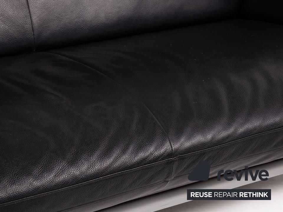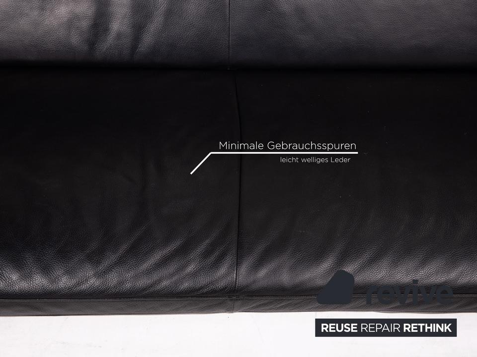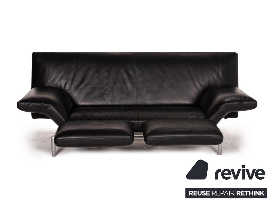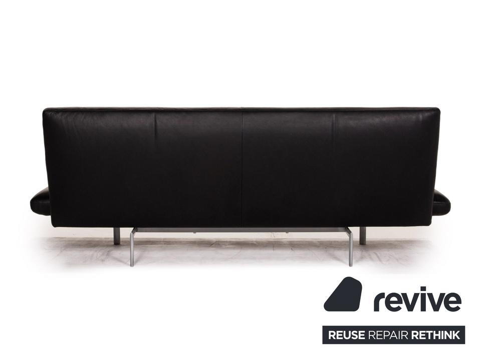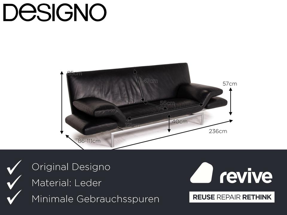 Das Sofa Flyer von Designo ist mit einem schwarzen Echtleder bezogen und steht auf einem matten Metallgestell. Die besondere Form zeichnet sich durch die Flügelpolster unter den Armlehnen aus. Diese können für mehr Komfort zu Fußteilen umgeschwenkt werden.
