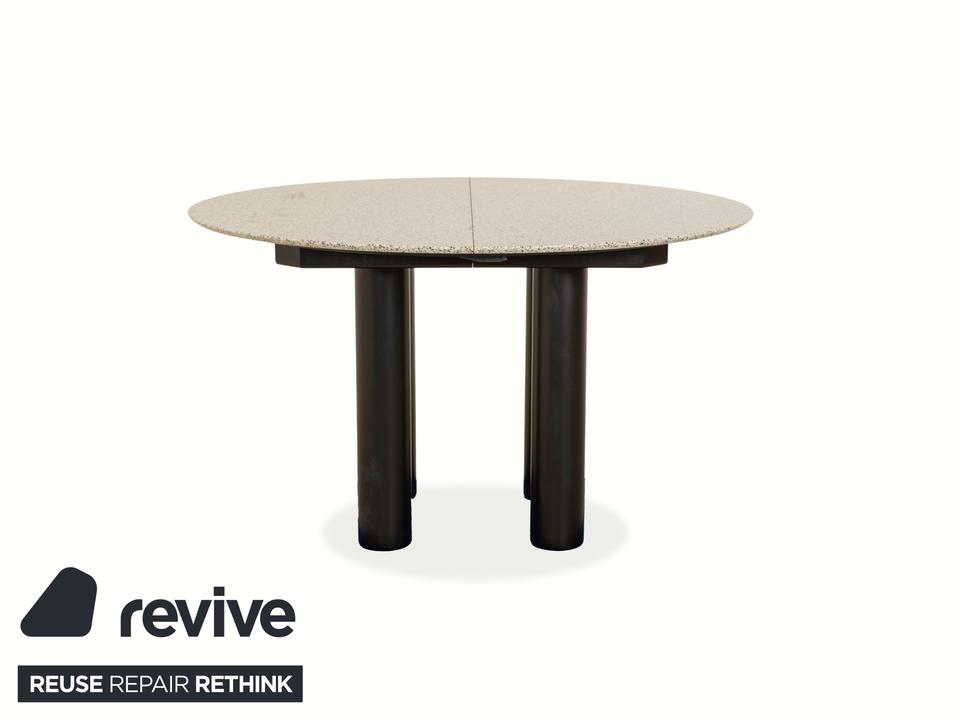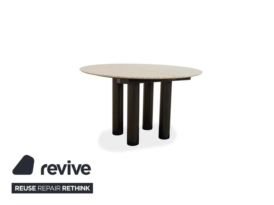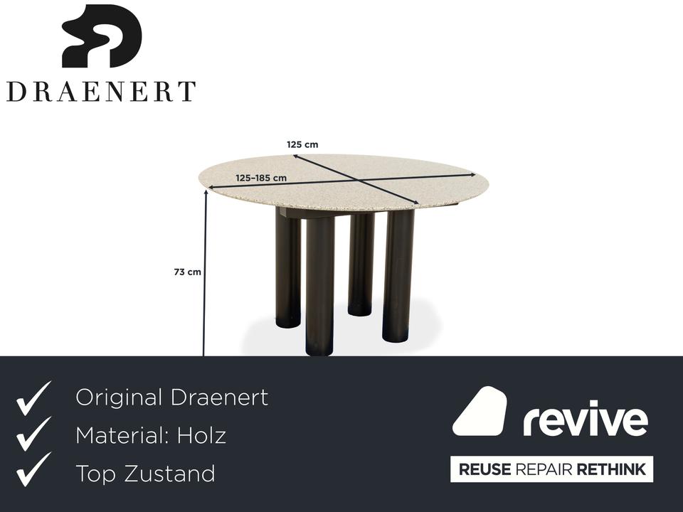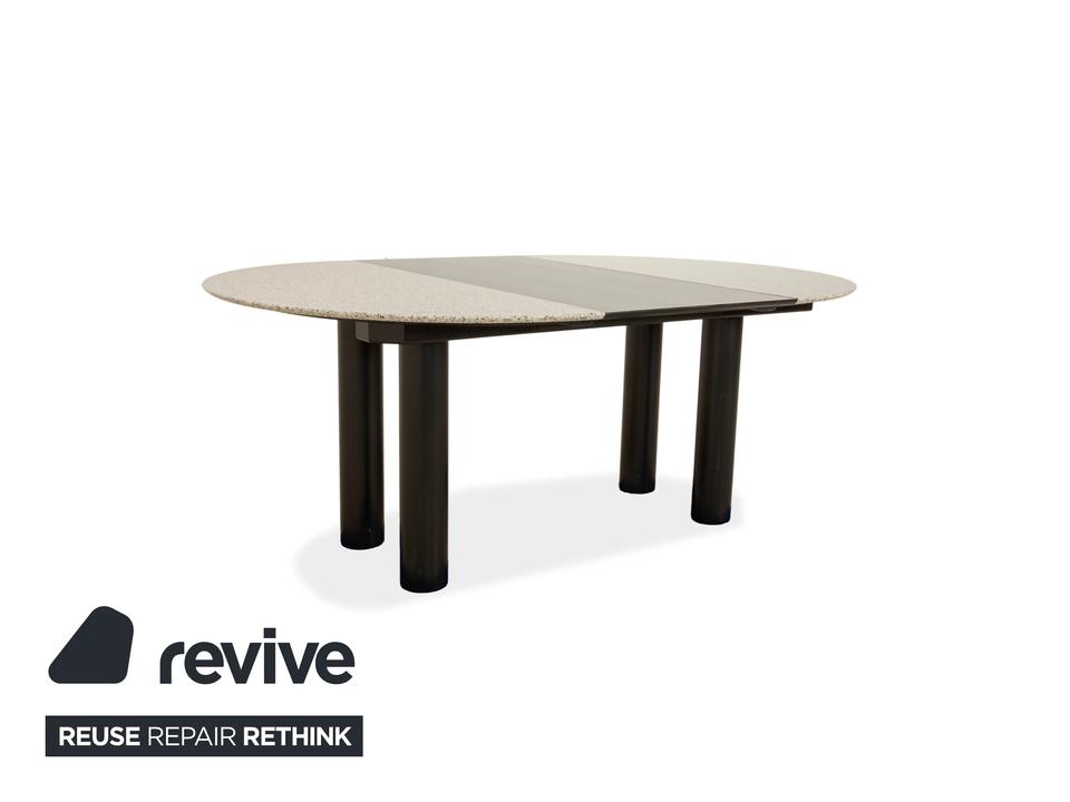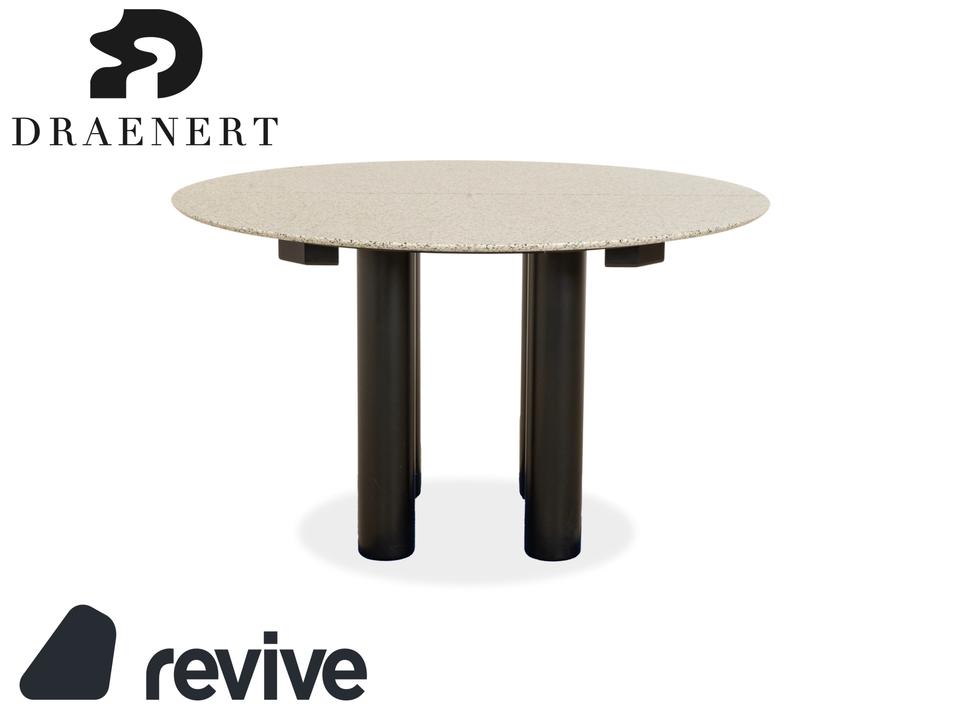 Der Esstisch Draenert 1226 aus Granit und Esche besticht durch sein klassisches Design. Die Granitplatte und der Mechanismus zum Erweitern der Tischfläche von 125 cm auf 225 cm ruhen auf einem Gestell aus Esche und vier runden Beinen aus Metall.