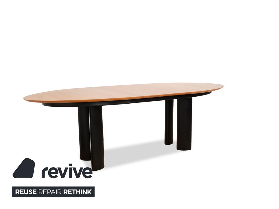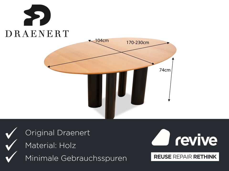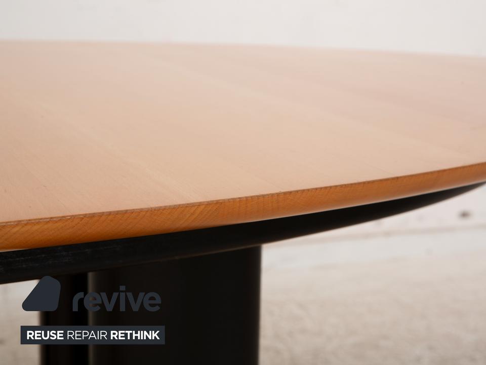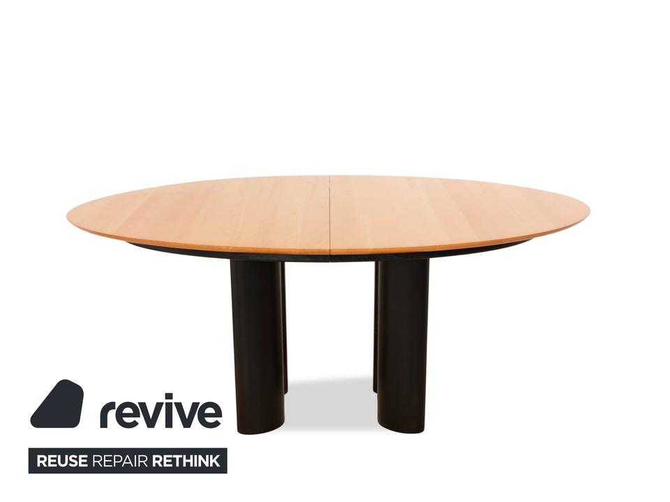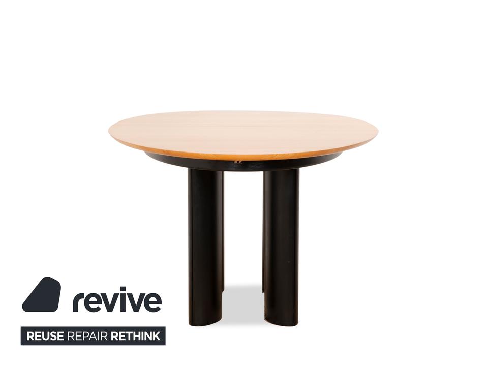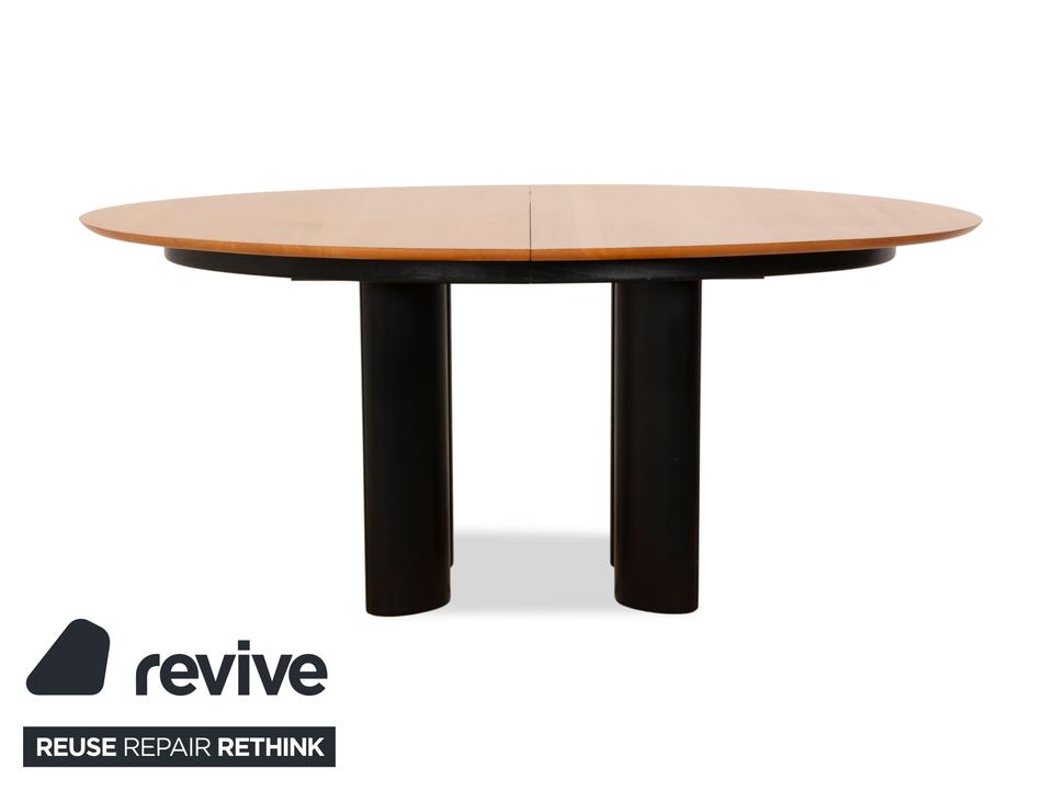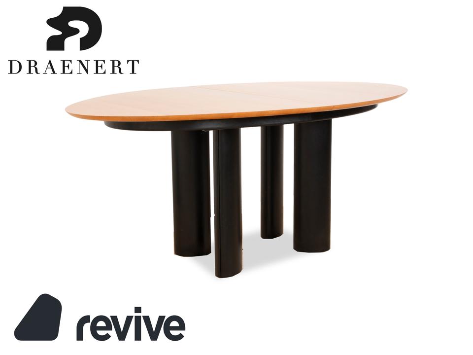 Der Tisch 1226 von Draenert ist ein Beispiel für klassisches Design. Die erweiterbare Holzfläche ruht auf schwarzen Metallfüßen.
