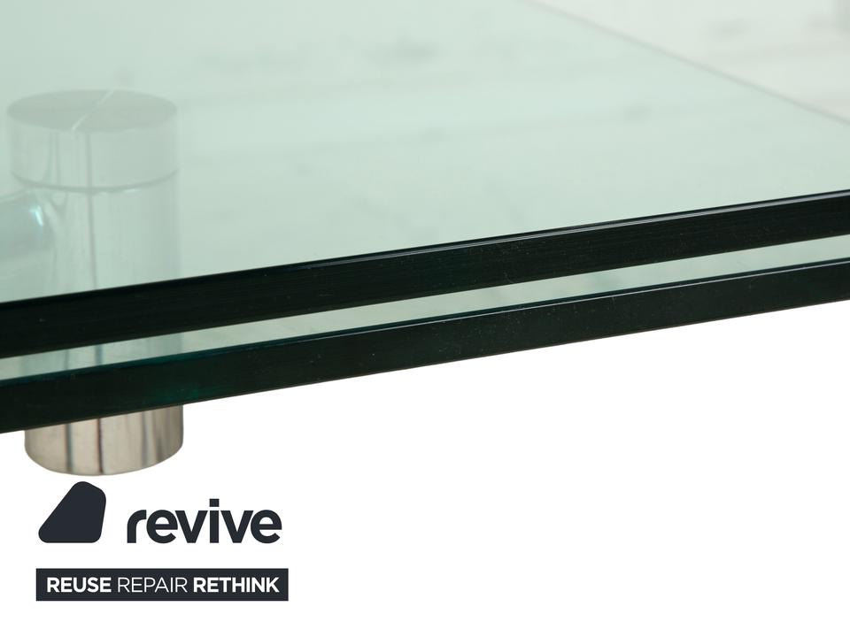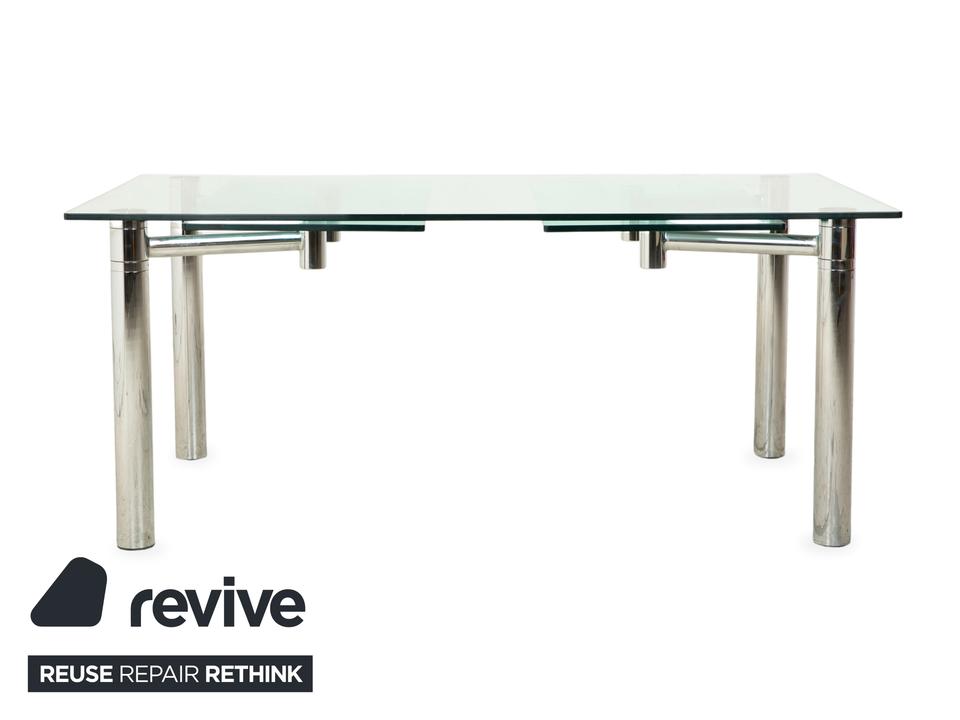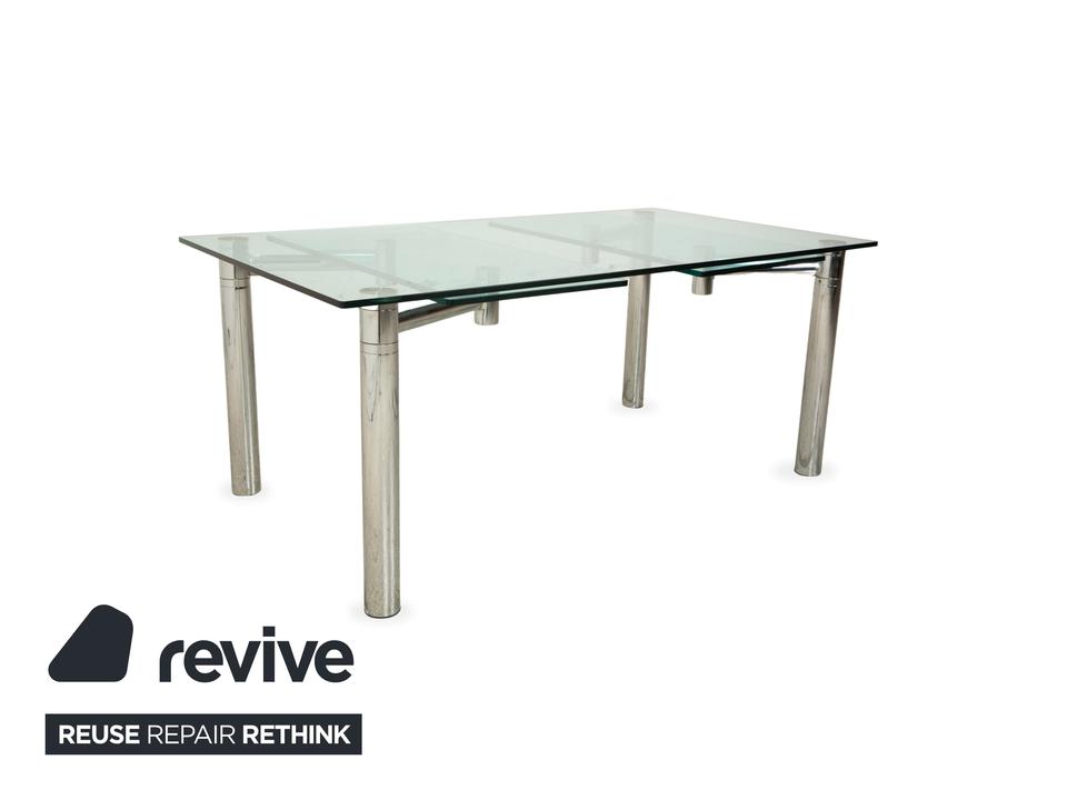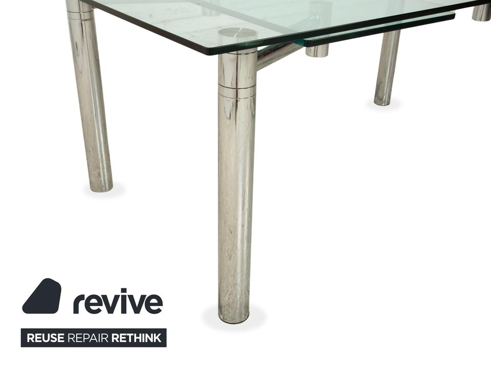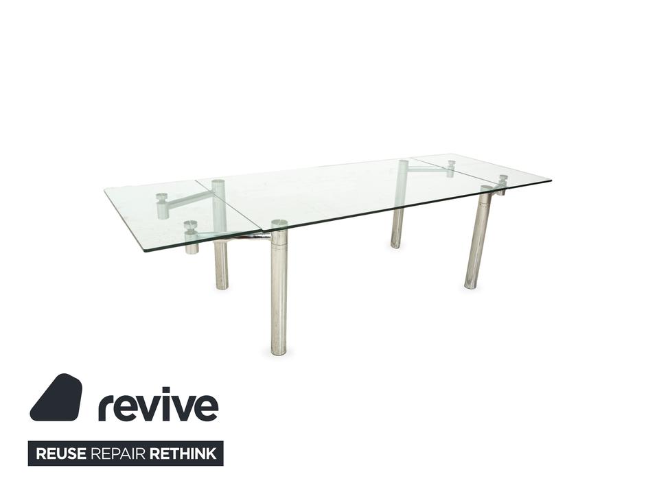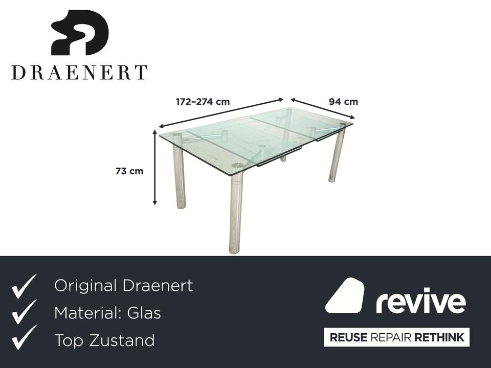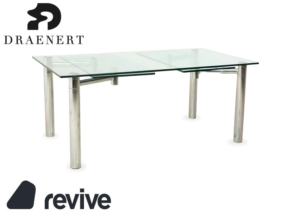 Der Casanova von Draenert ist ein rechteckiger Glastisch mit sauberem, reduzierten Design und runden Metallfüßen und Gestell in Chrom. Durch die integrierte Ausziehfunktion lässt sich die Tischfläche von 172 cm auf 274 cm verlängern, sodass er flexibel dann auch für größere Tischgesellschaften geeignet ist. Der Auszug arbeitet mit zwei Einlegeplatten, die unter der Hauptplatte gelagert sind. Die Einlegeplatten werden entlang der Mechanik nach oben/ausgedreht und so in die Verlängerungsposition gebracht.