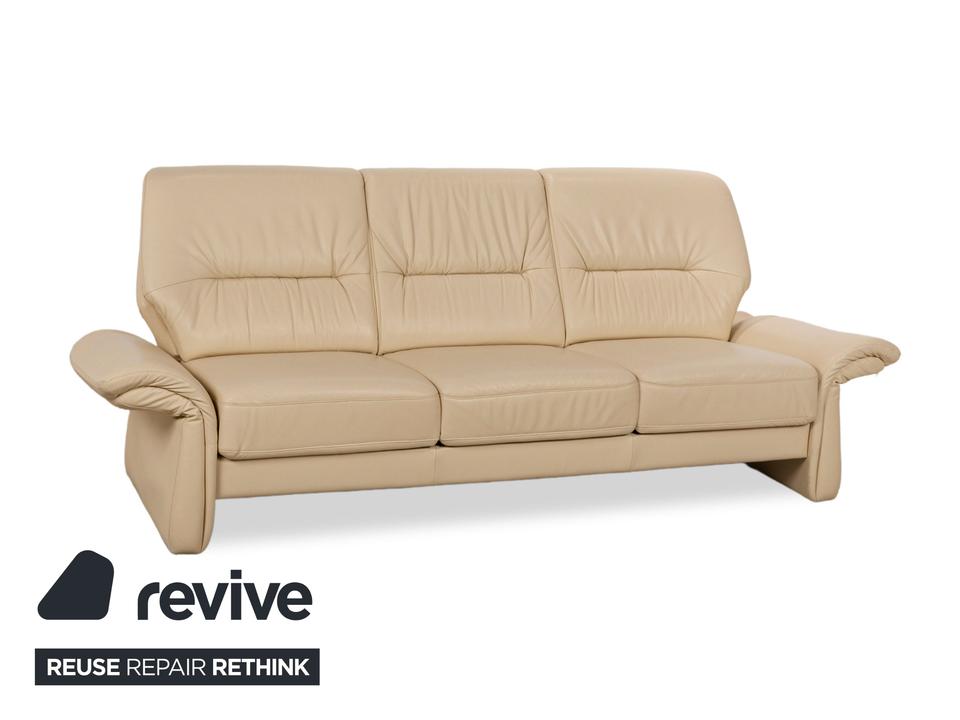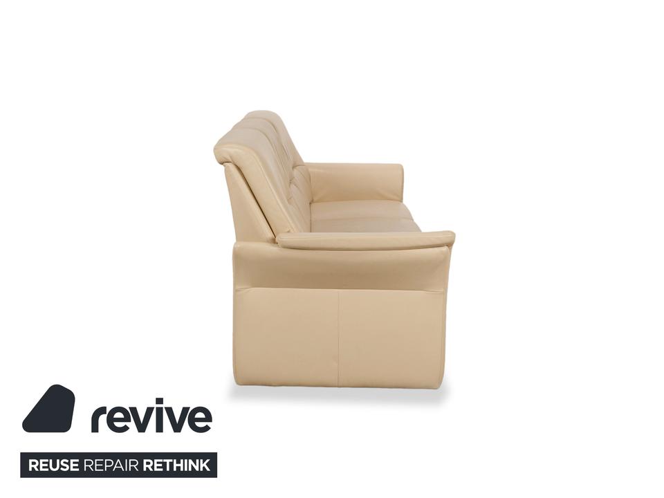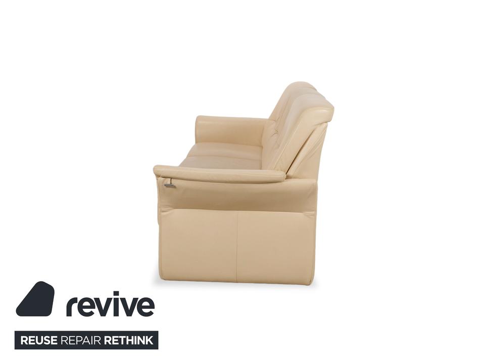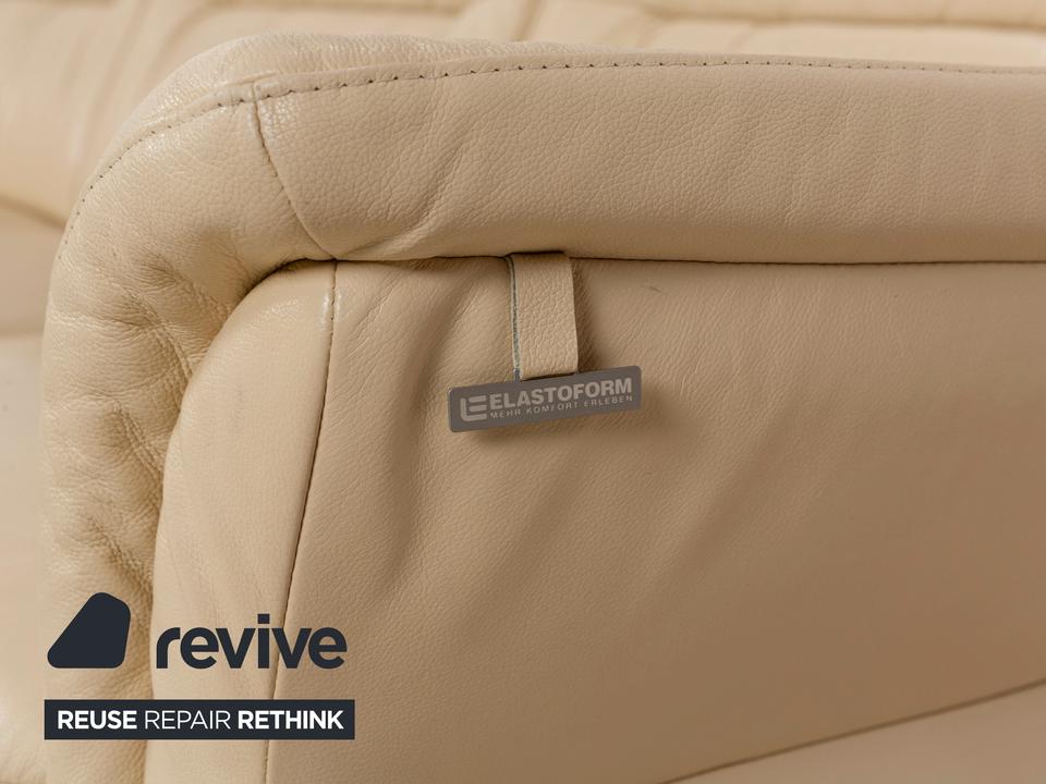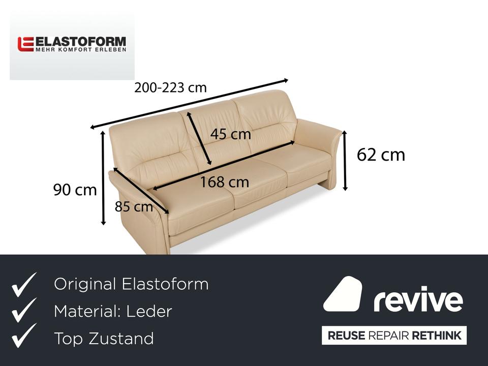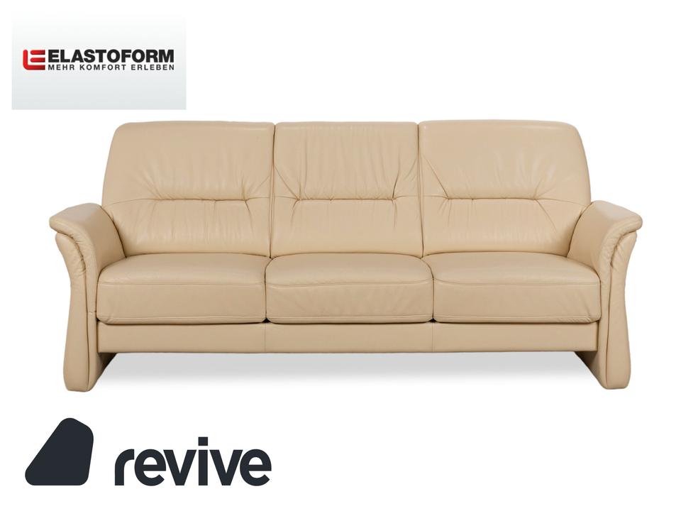 Das Elastoform Dreisitzer Sofa zeichnet sich mit dem hochwertigen Leder als langlebig und bequem heraus. Der Cremeton wirkt edel und einladend. Die Armlehnen können nach außen geklappt werden, was zusätzlichem Komfort gewährt.
